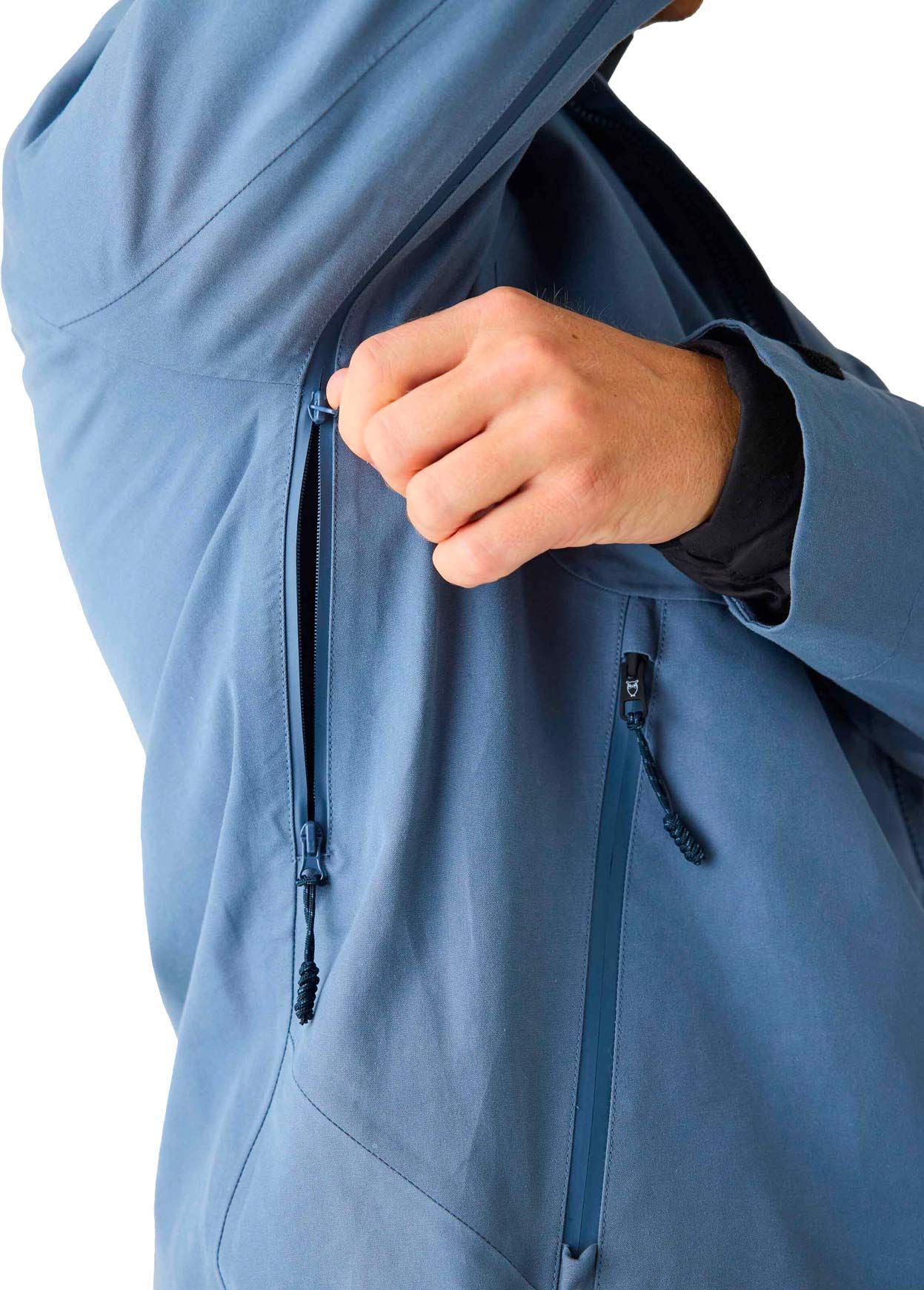 Les manches articulées répondent aux exigences de mobilité. L’équipement comprend une capuche à visière rigide réglable, un zip central bidirectionnel, plusieurs poches, ainsi que des ouvertures d’aération zippées pour optimiser le confort. Ourlet adaptable, poignets ajustables et fiche arrière allongée confèrent à cette veste une polyvalence fonctionnelle pour toutes les situations.