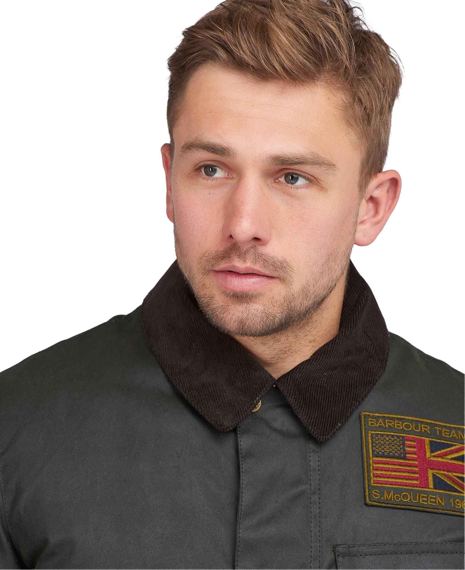 Veste Workers Wax Jacket sage pour homme, en coton ciré avec col velours côtelé et doublure tartan matelassée, protège du froid hivernal tout en affirmant un style british intemporel.