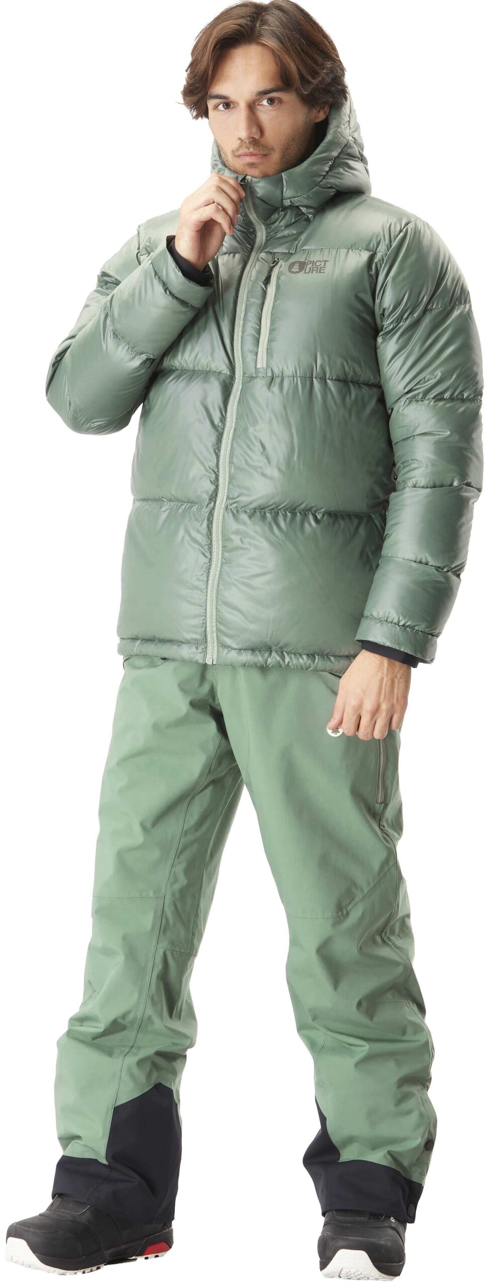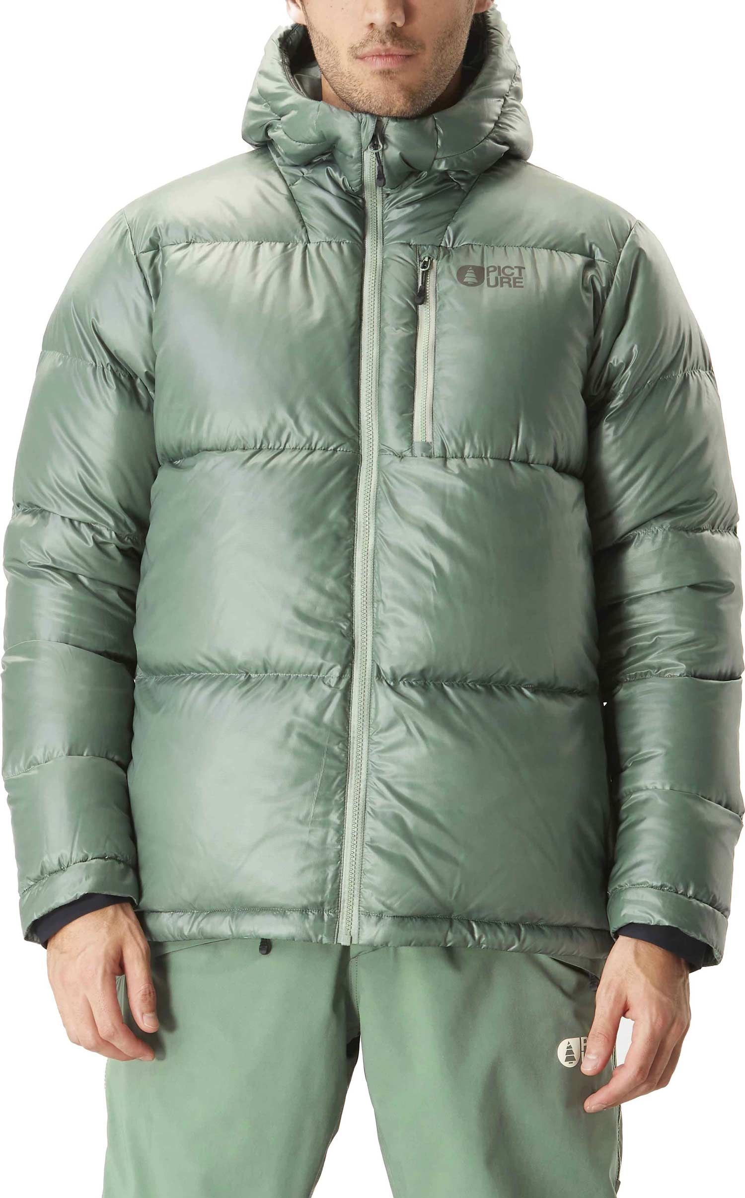 Doudoune urbaine Picture Organic Clothing Hi Puffer Laurel Wreath pour homme, isolée en duvet de canard recyclé et doublée Pertex® 2D nano ripstop pour une chaleur durable. Traitement déperlant Teflon Ecoelite™ sans PFC, fermeture zippée étanche, confection 100 % polyester recyclé.