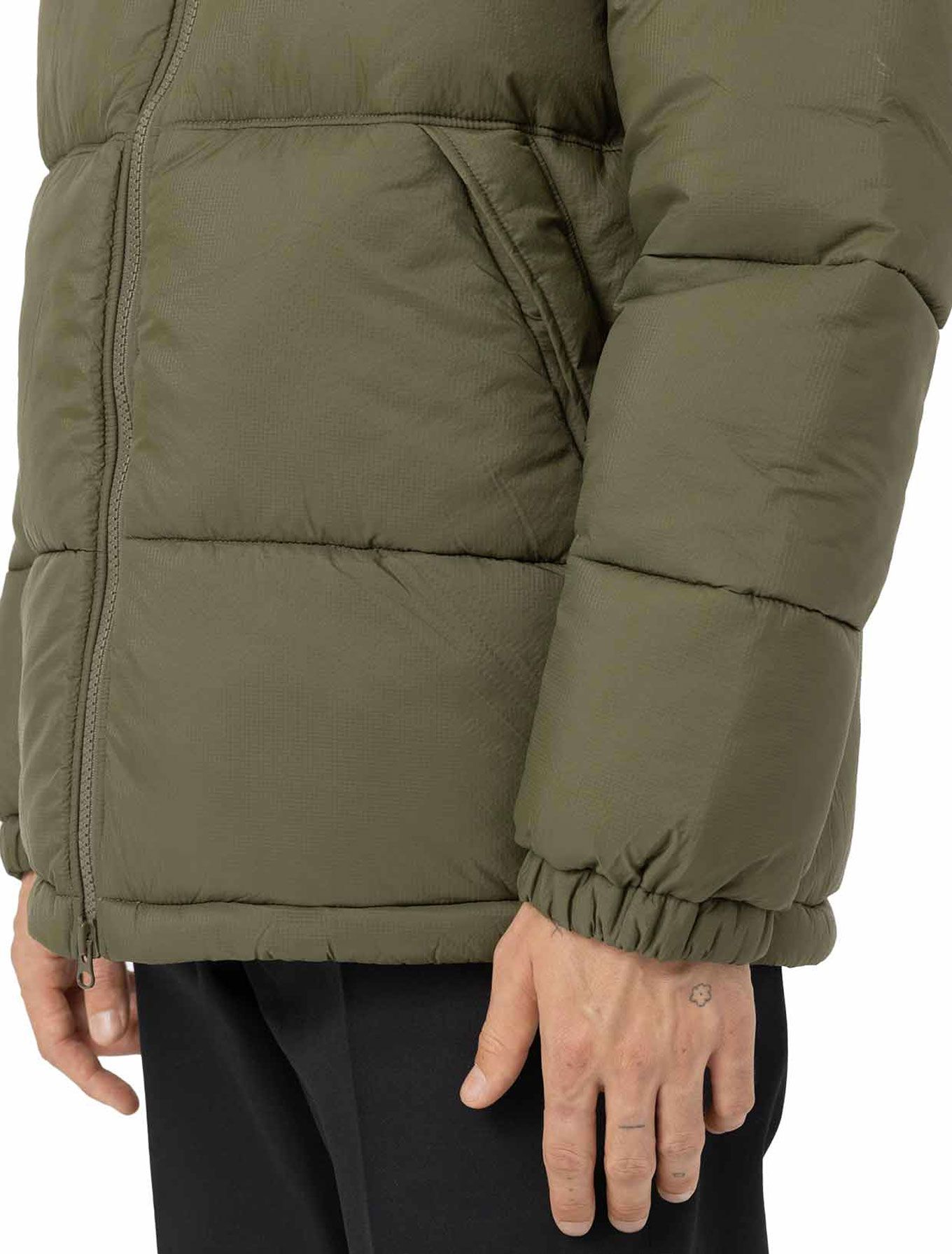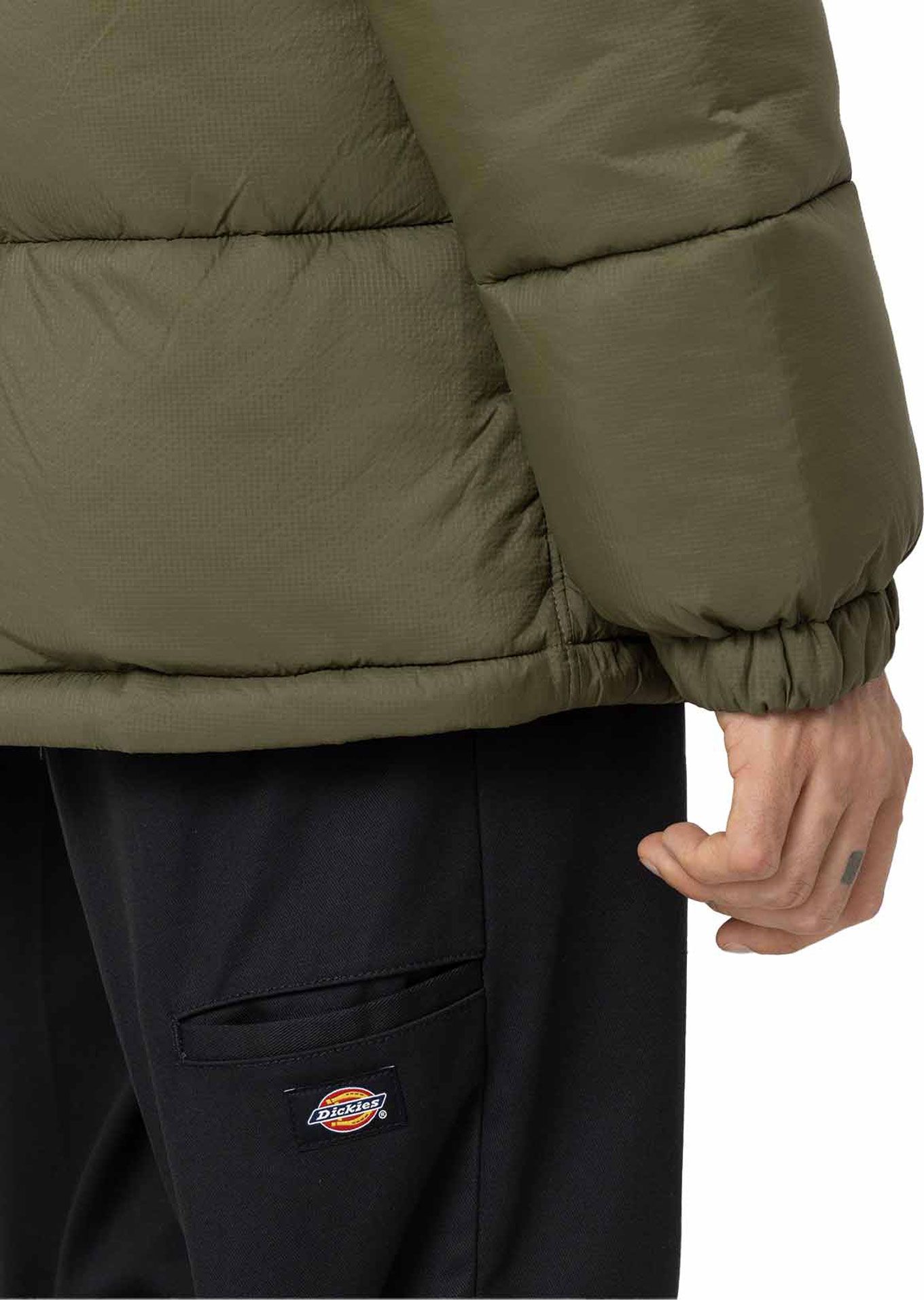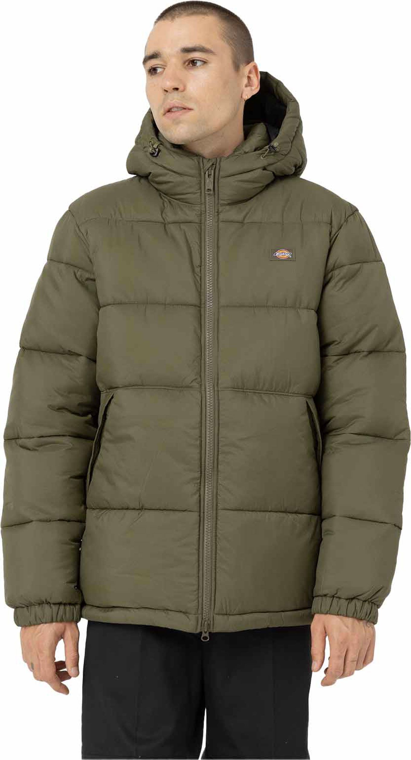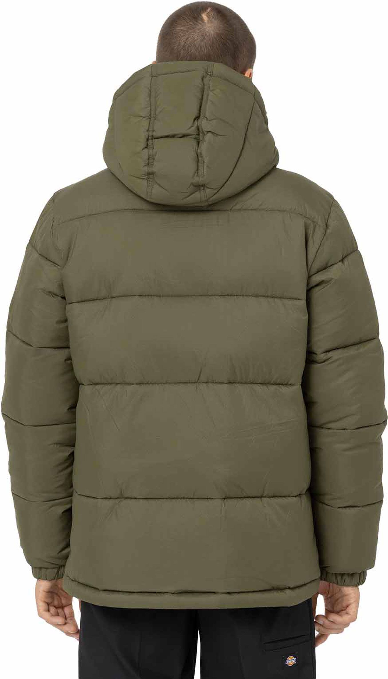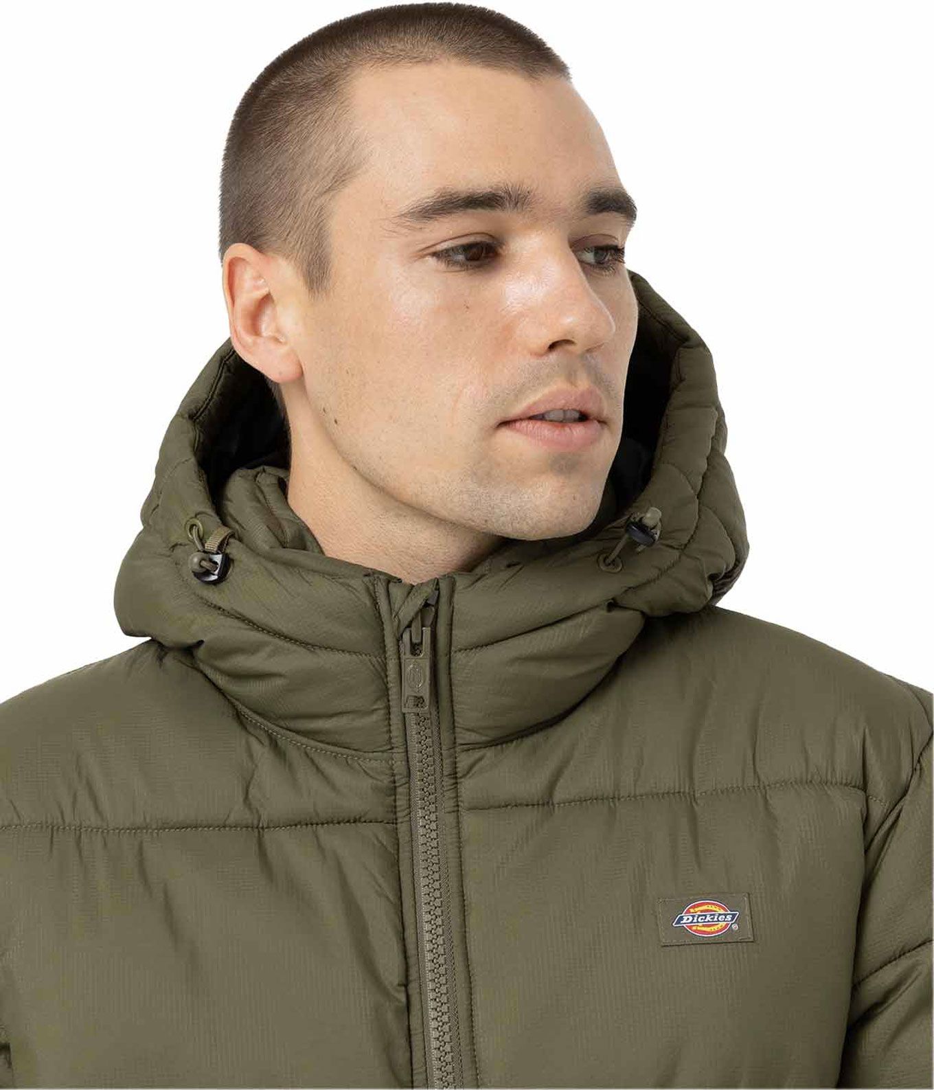 Dickies Waldenburg Hooded Military Green : doudoune homme résistante à l’eau, chaude et fonctionnelle avec capuche ajustable et poches zippées.
