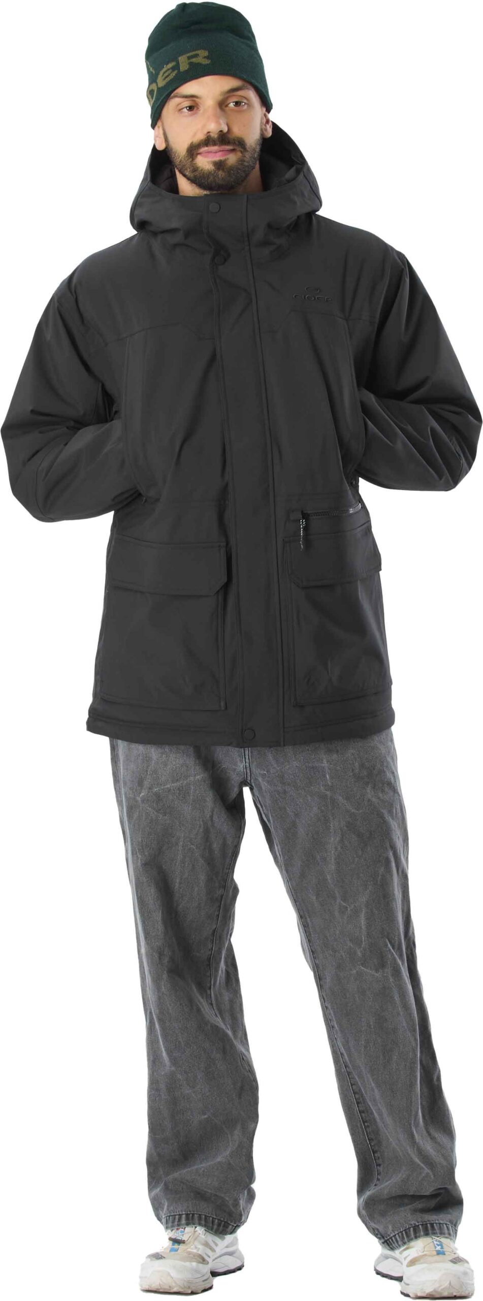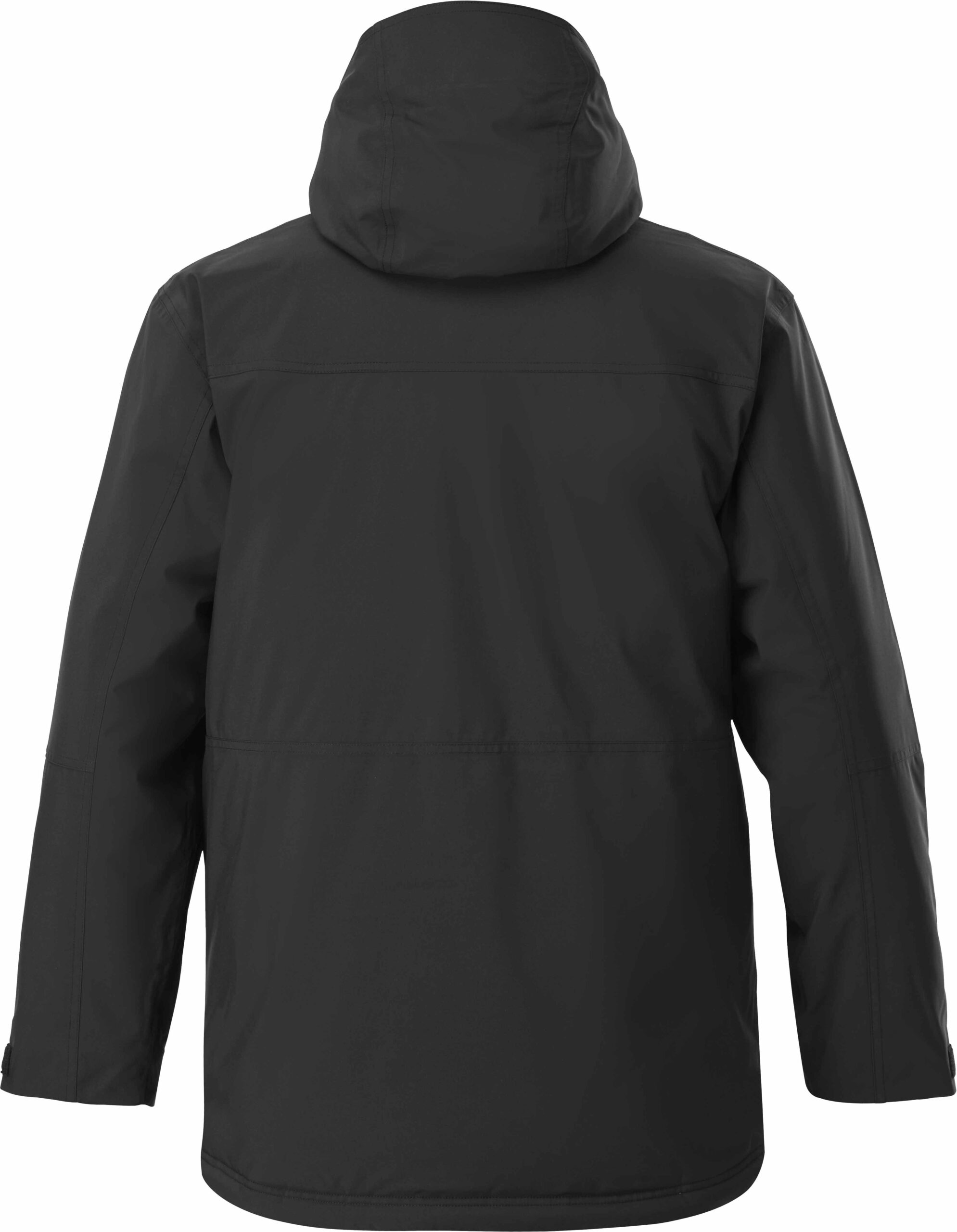 Cette parka s’adapte à diverses conditions. Le mannequin mesure 1m85 et porte une taille M. Le modèle proposé est noir.