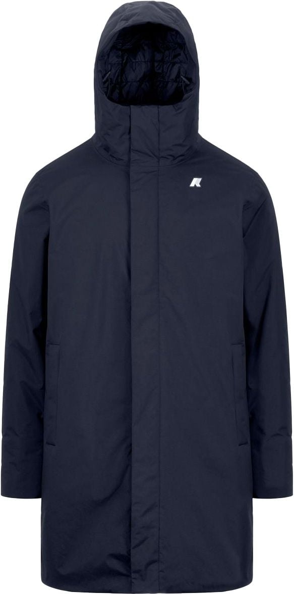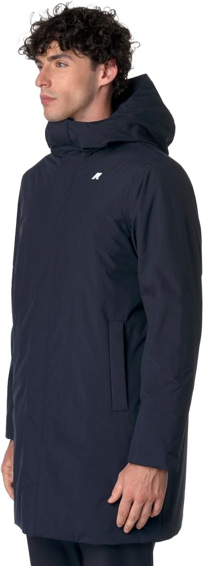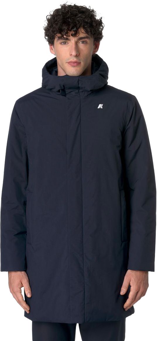 Parka longue homme K-Way Thomas Warm Ottoman Deep Blue en nylon recyclé imperméable, coupe-vent et déperlante, isolée synthétique et duvet pour la mi-saison. Capuche réglable, col protecteur, poches zippées, coutures thermo-soudées, look urbain.
