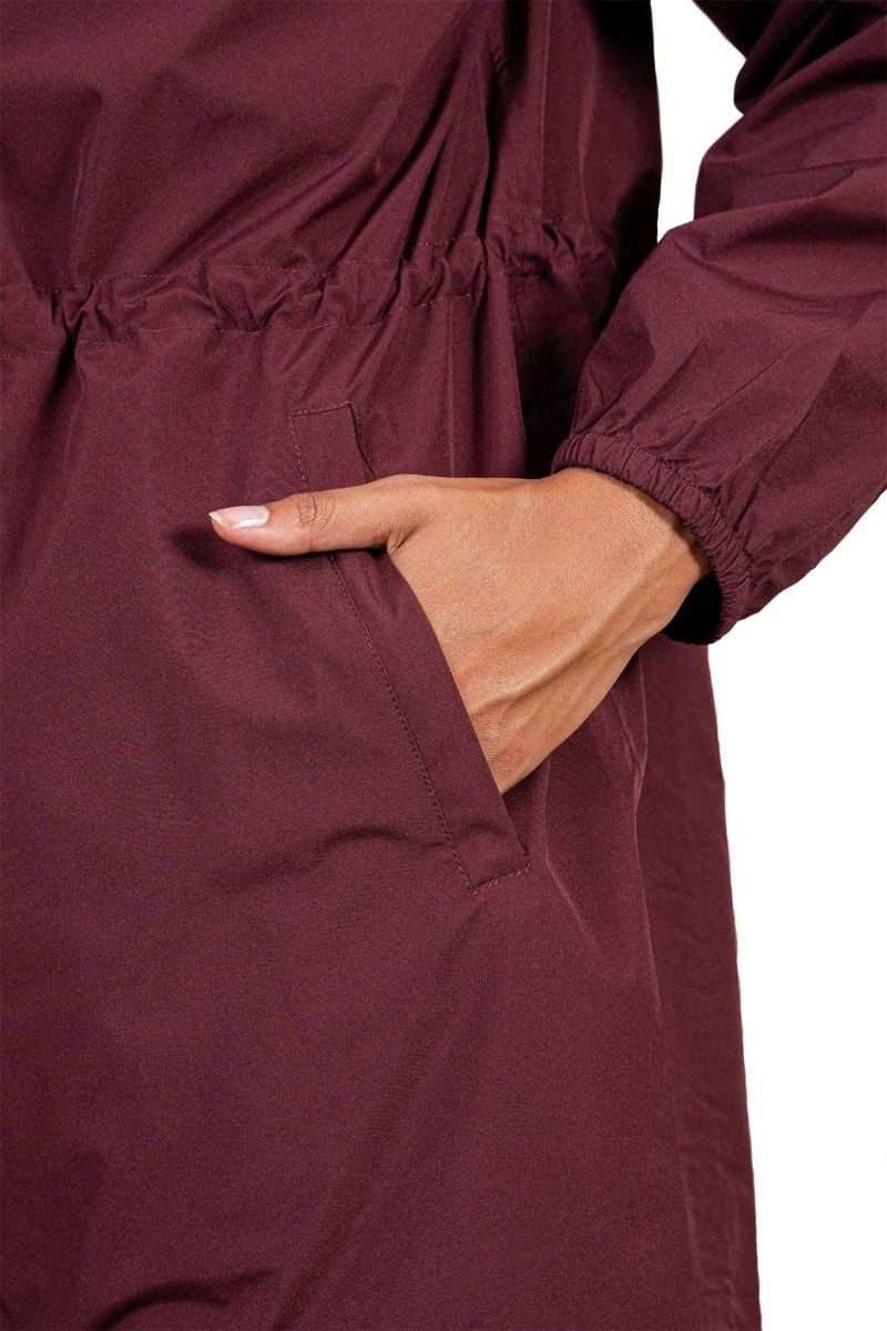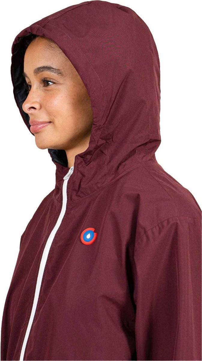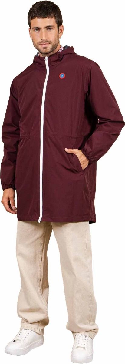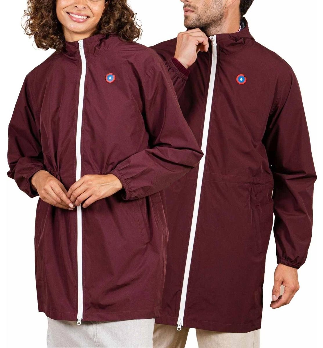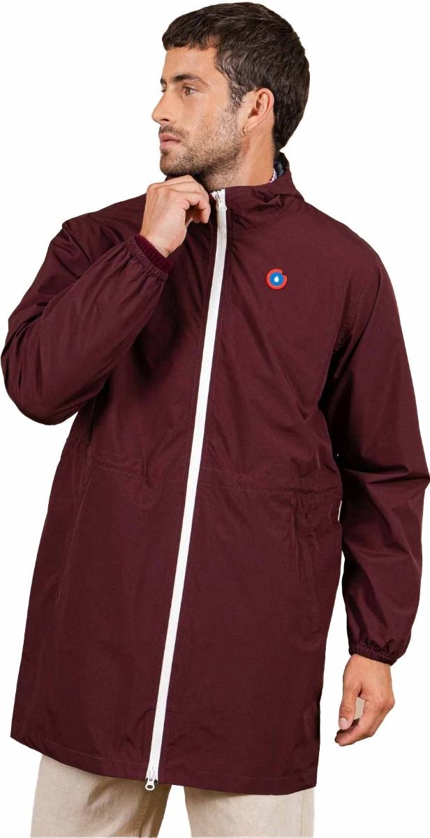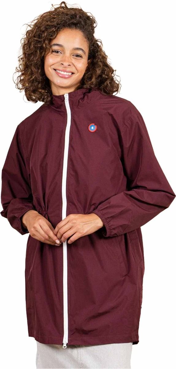Flotte Amelot Prune, veste unisexe longue en matériaux recyclés, imperméable et respirante, se transforme en sac via sa pochette dorsale intégrée et s’ajuste à toutes les morphologies grâce à son cordon réglable.