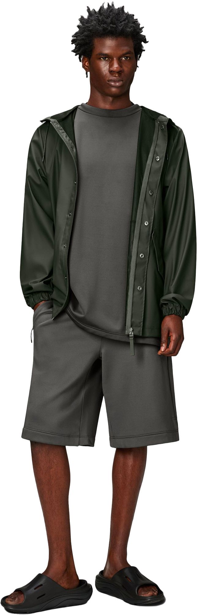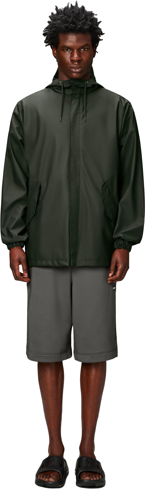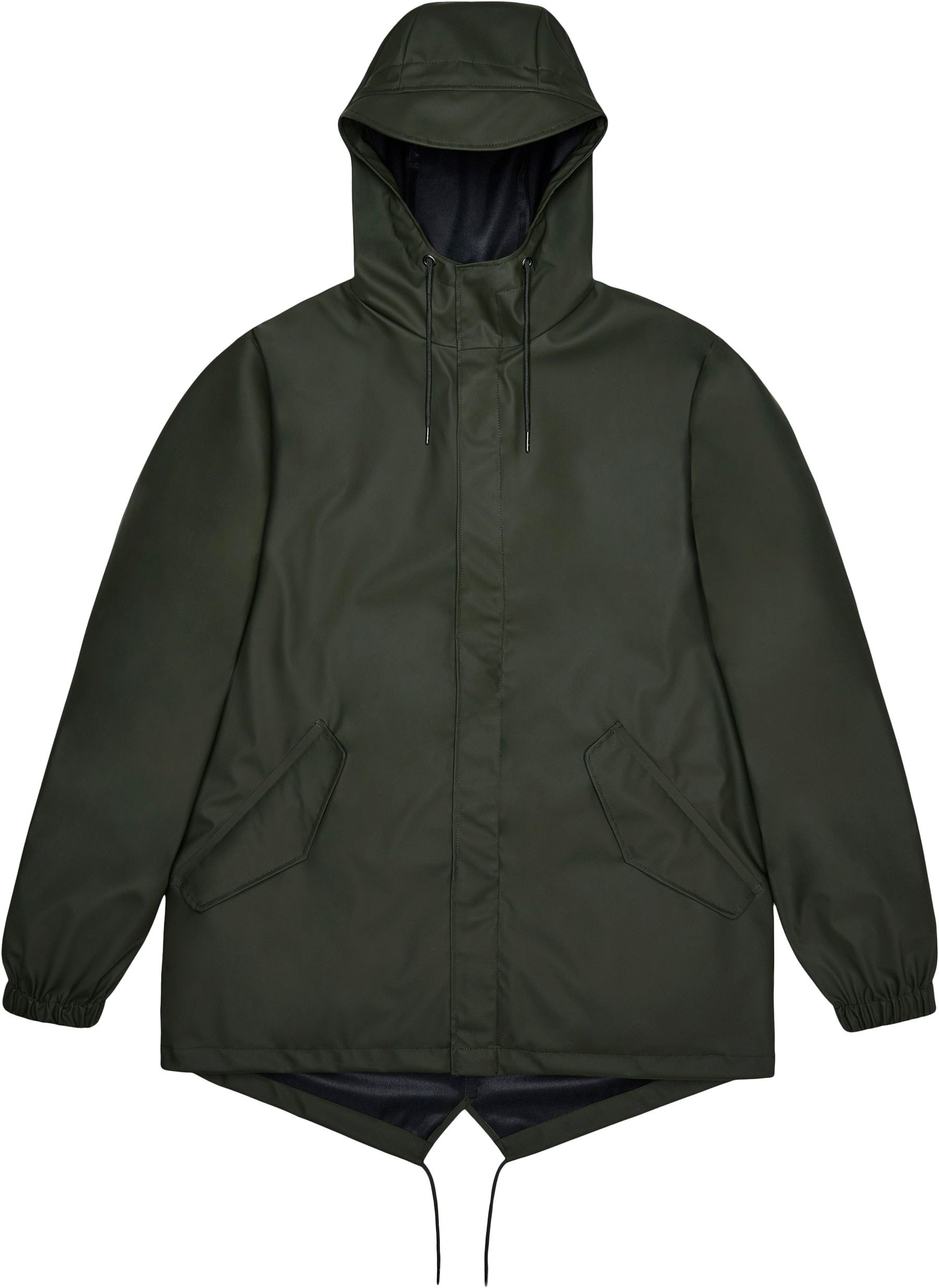 Veste imperméable unisexe Rains Fishtail Jacket W3 Green, coupe-vent à coutures soudées, capuche et ourlet queue de poisson réglables pour une protection urbaine complète.