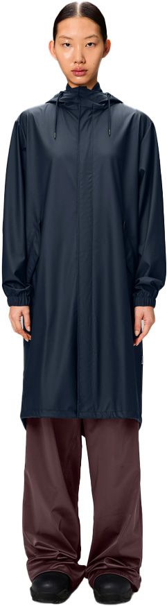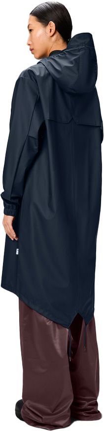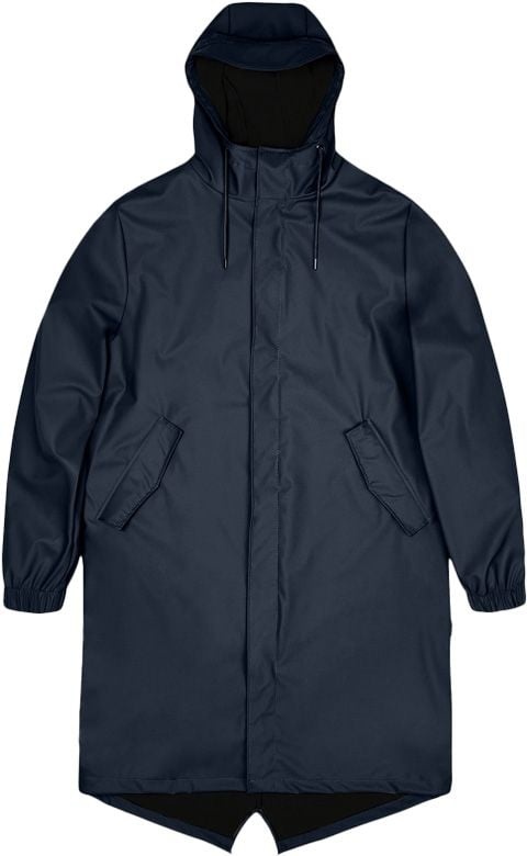 Rains Fishtail Parka W3 Navy : veste longue imperméable unisexe, coupe-vent à coutures soudées, capuche ajustée et ourlet queue de poisson réglable pour une protection urbaine complète.