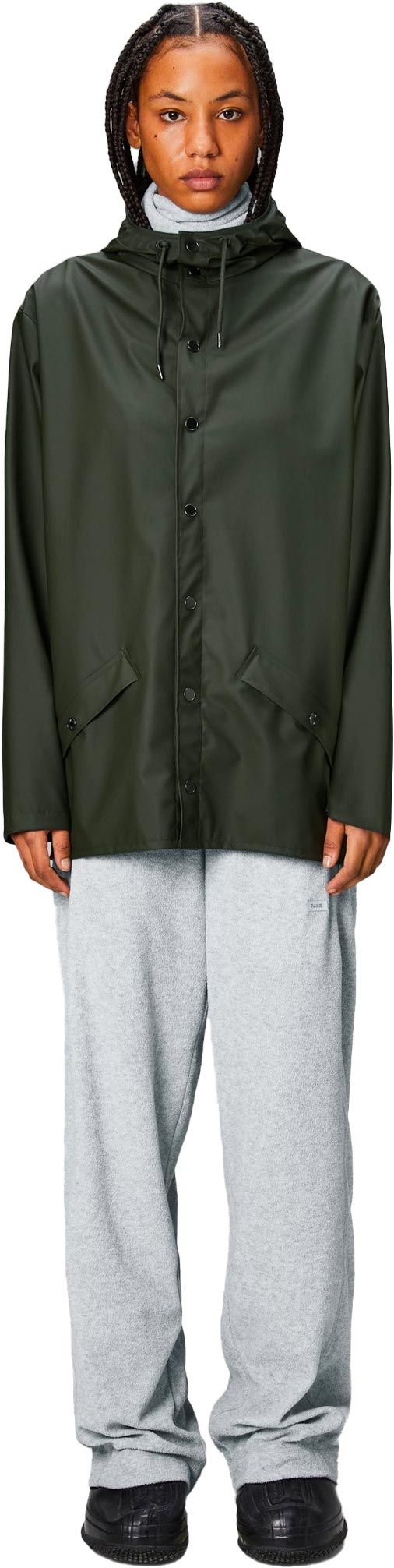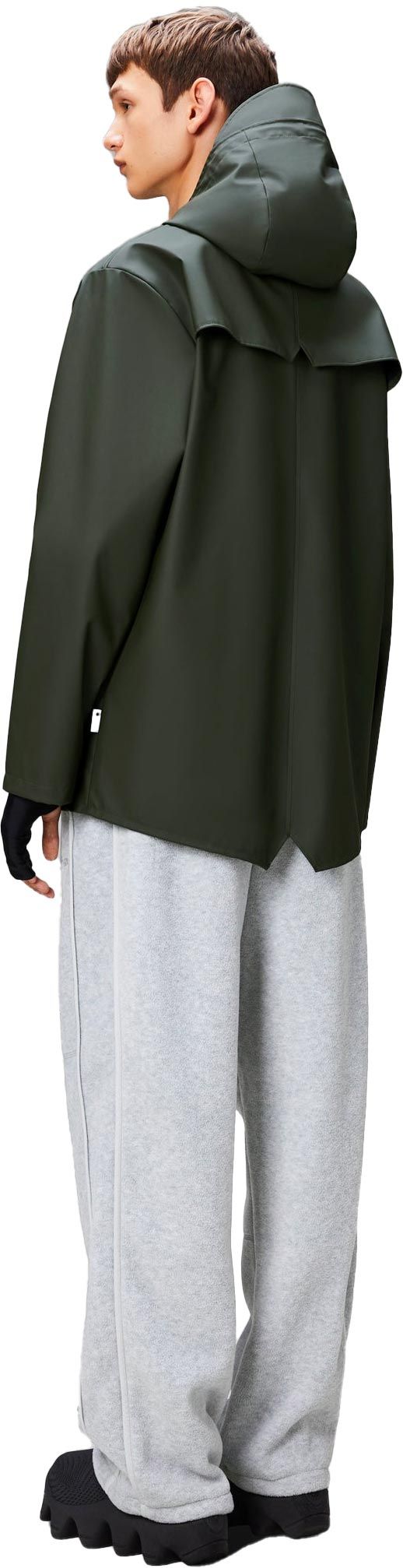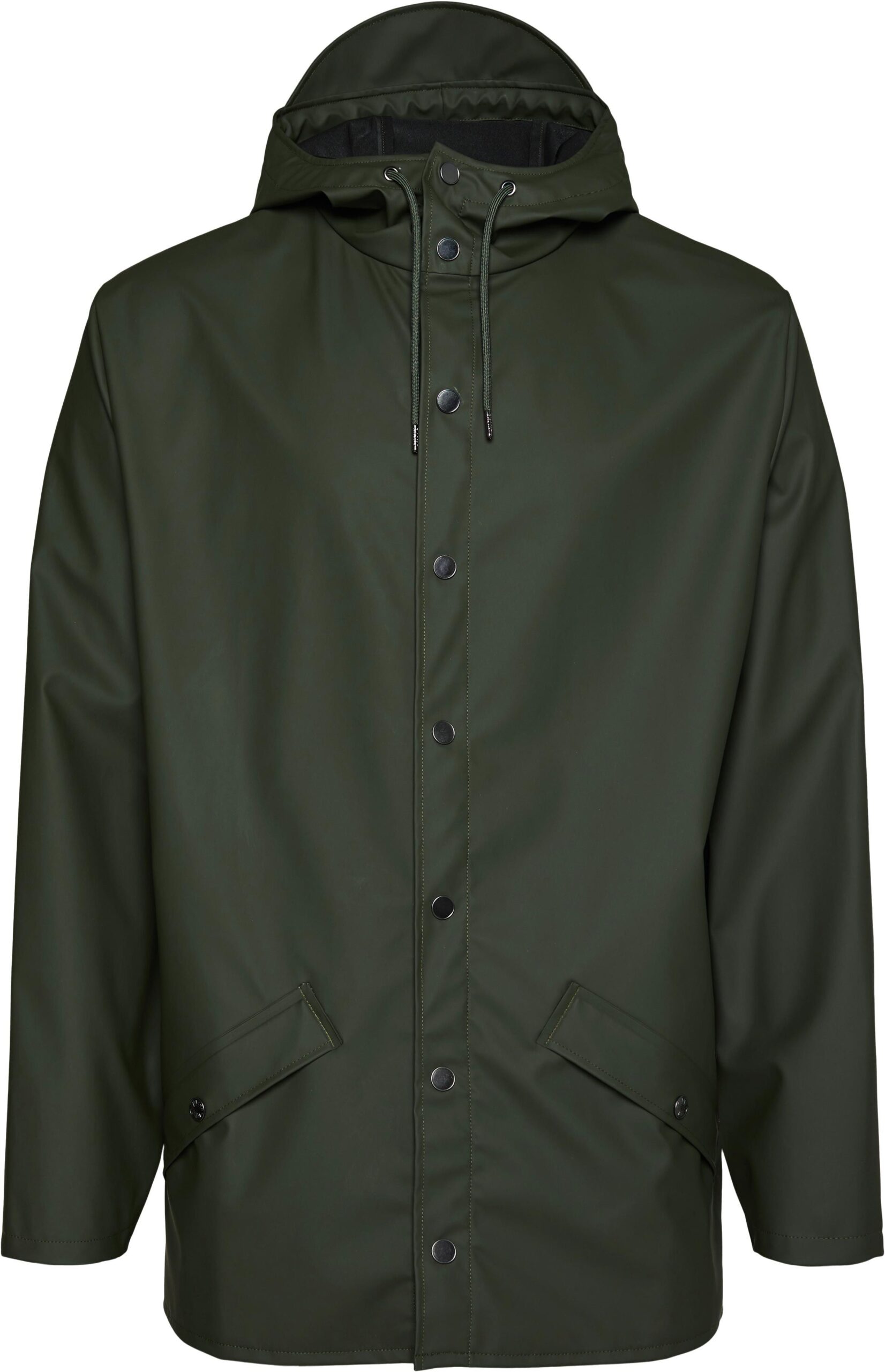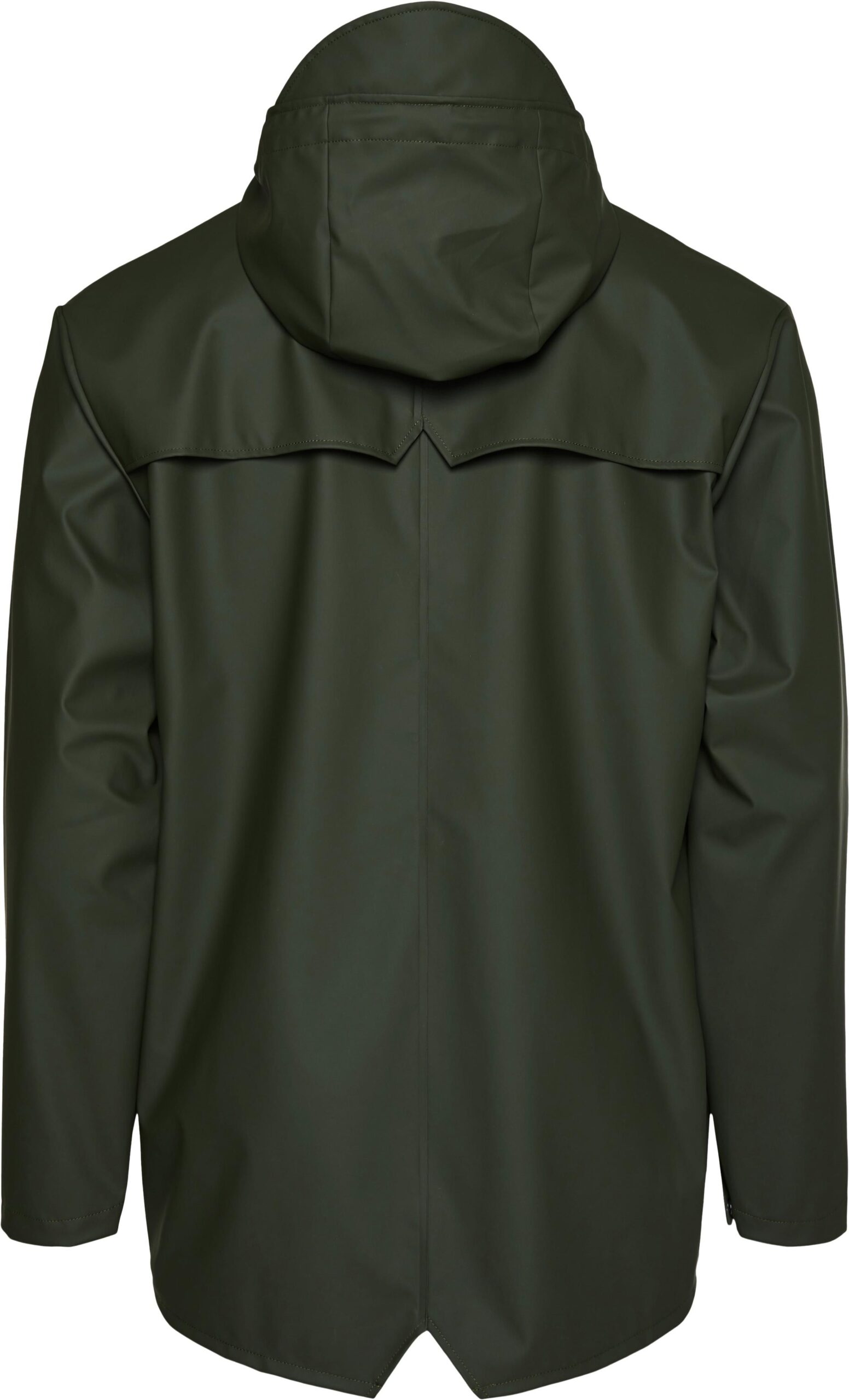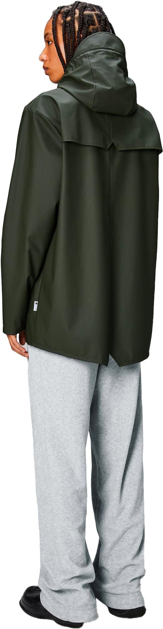 Veste unisexe Jacket Green de Rains, imperméable avec coutures soudées ultrason, capuche ajustable et aérations discrètes pour explorer la ville sous la pluie avec style.