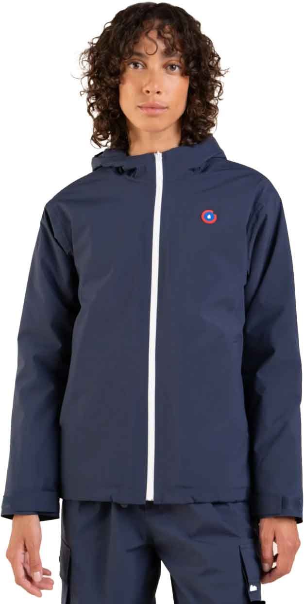 Veste imperméable Lazare Indigo par Flotte, coupe courte unisexe en tissu 100 % recyclé, doublure polaire, coutures scellées, manches ajustables et poches zippées pour chaleur et protection hivernale.