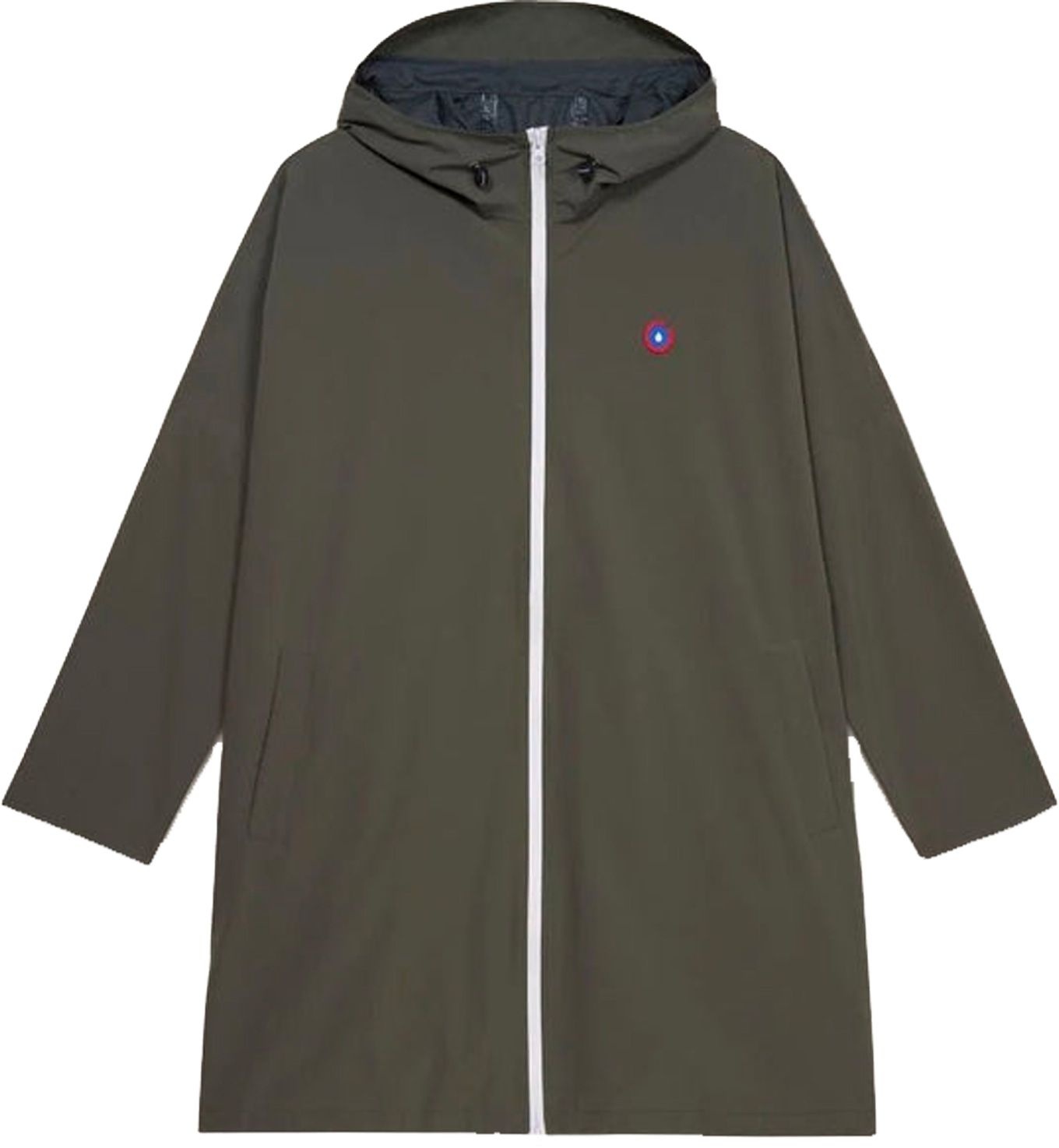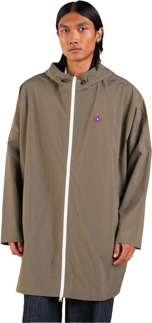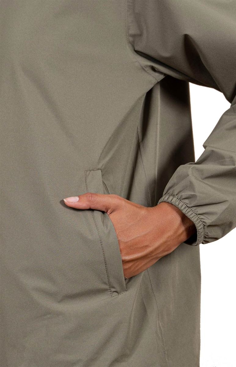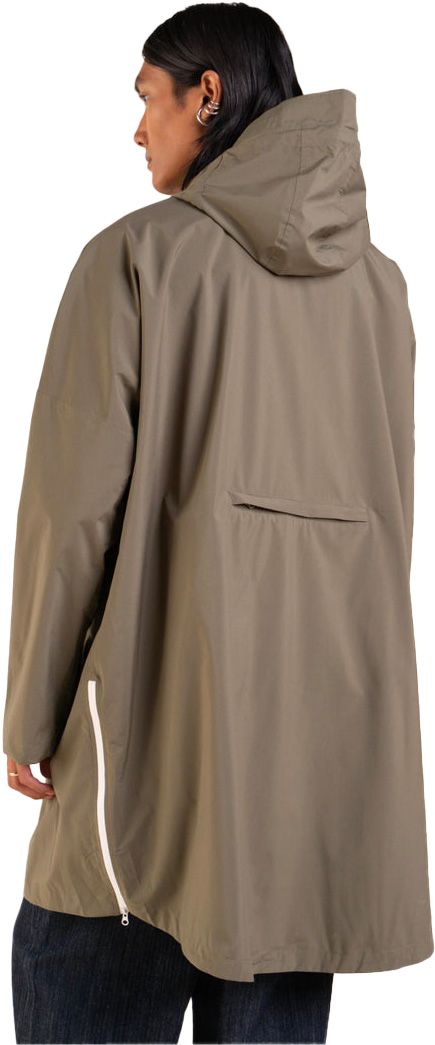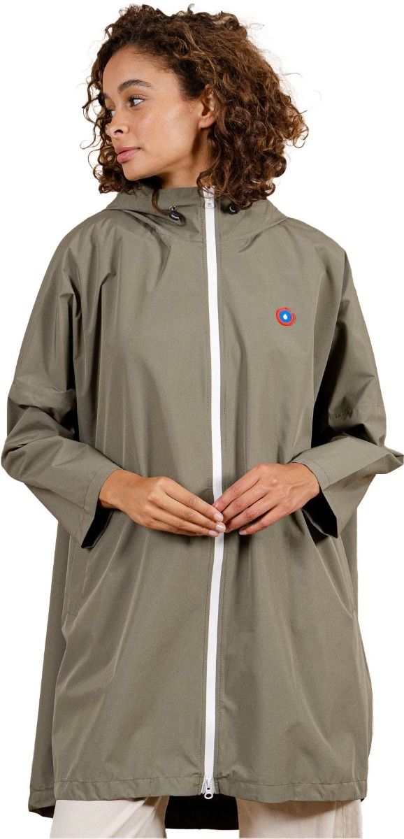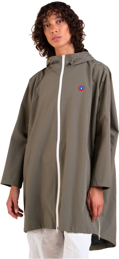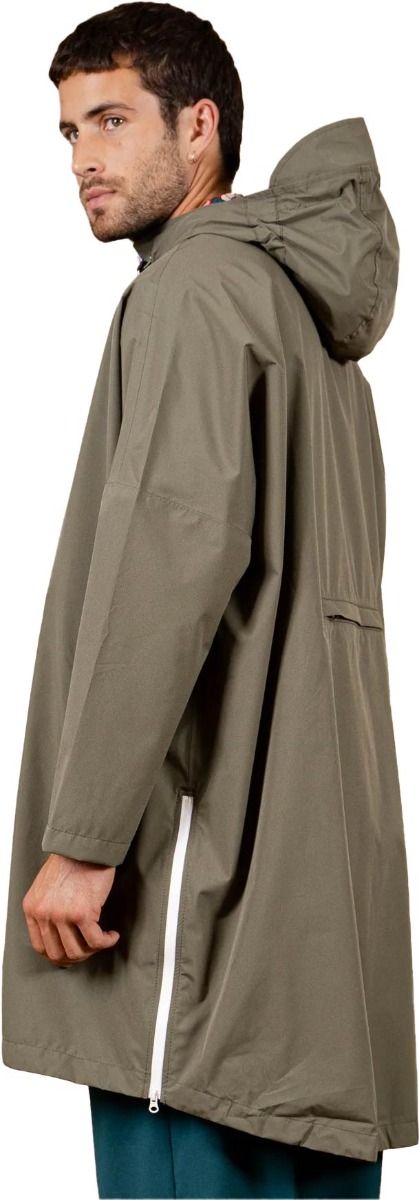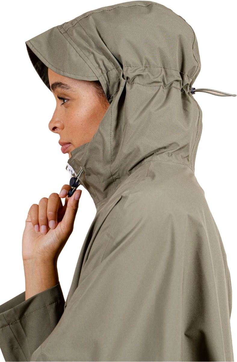 La cape de pluie Flotte Liberte Kaki, légère et imperméable, offre liberté de mouvement à vélo grâce à ses ouvertures latérales, capuche ajustable et transformation rapide en sac à dos.