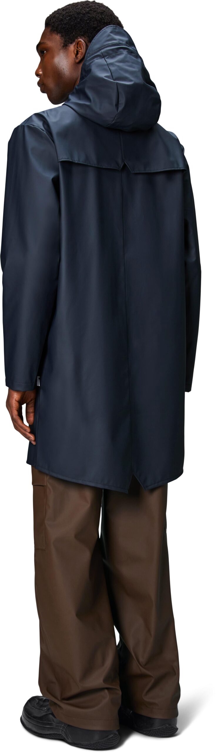Veste unisexe Rains Long Jacket Navy, imperméable et longue, protège en ville par coutures soudées ultrason, capuche ajustable et aérations dorsales discrètes.