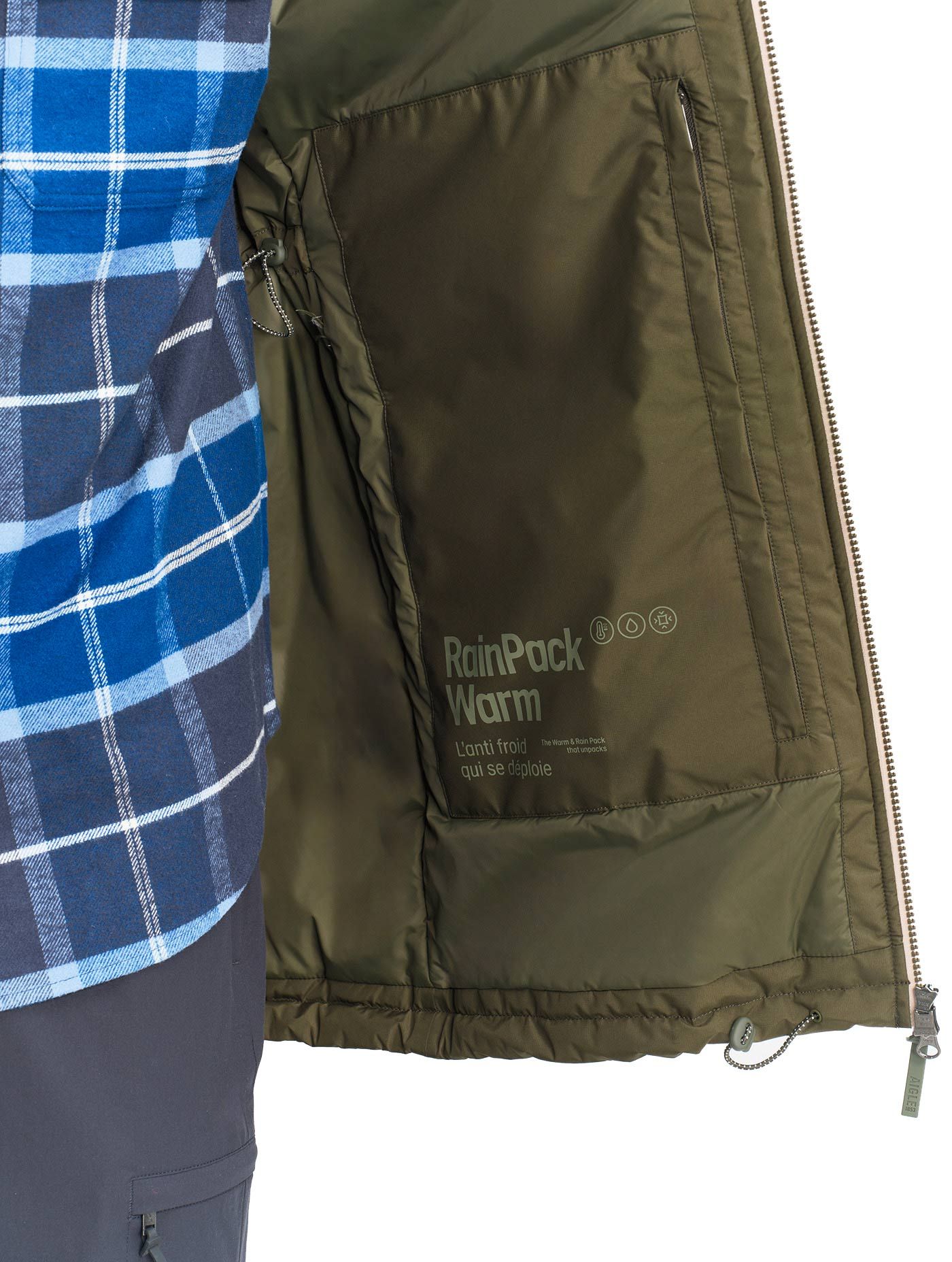 La veste Aigle Rainpack Warm90 MDT Avocado unisexe offre une protection imperméable, coupe-vent et respirante grâce à la membrane MTD®, un isolation légère, une capuche ajustable et un encombrement minimal une fois repliée dans sa poche.