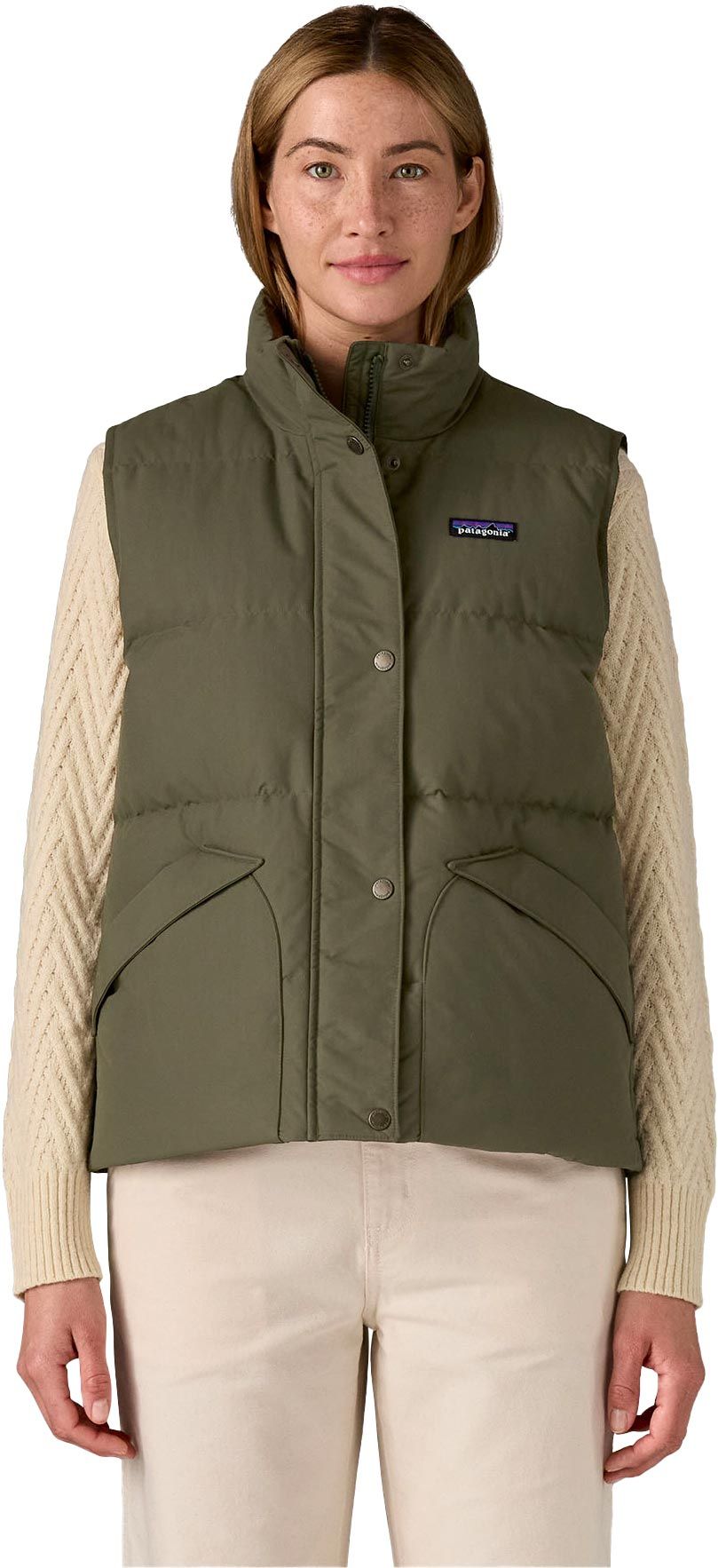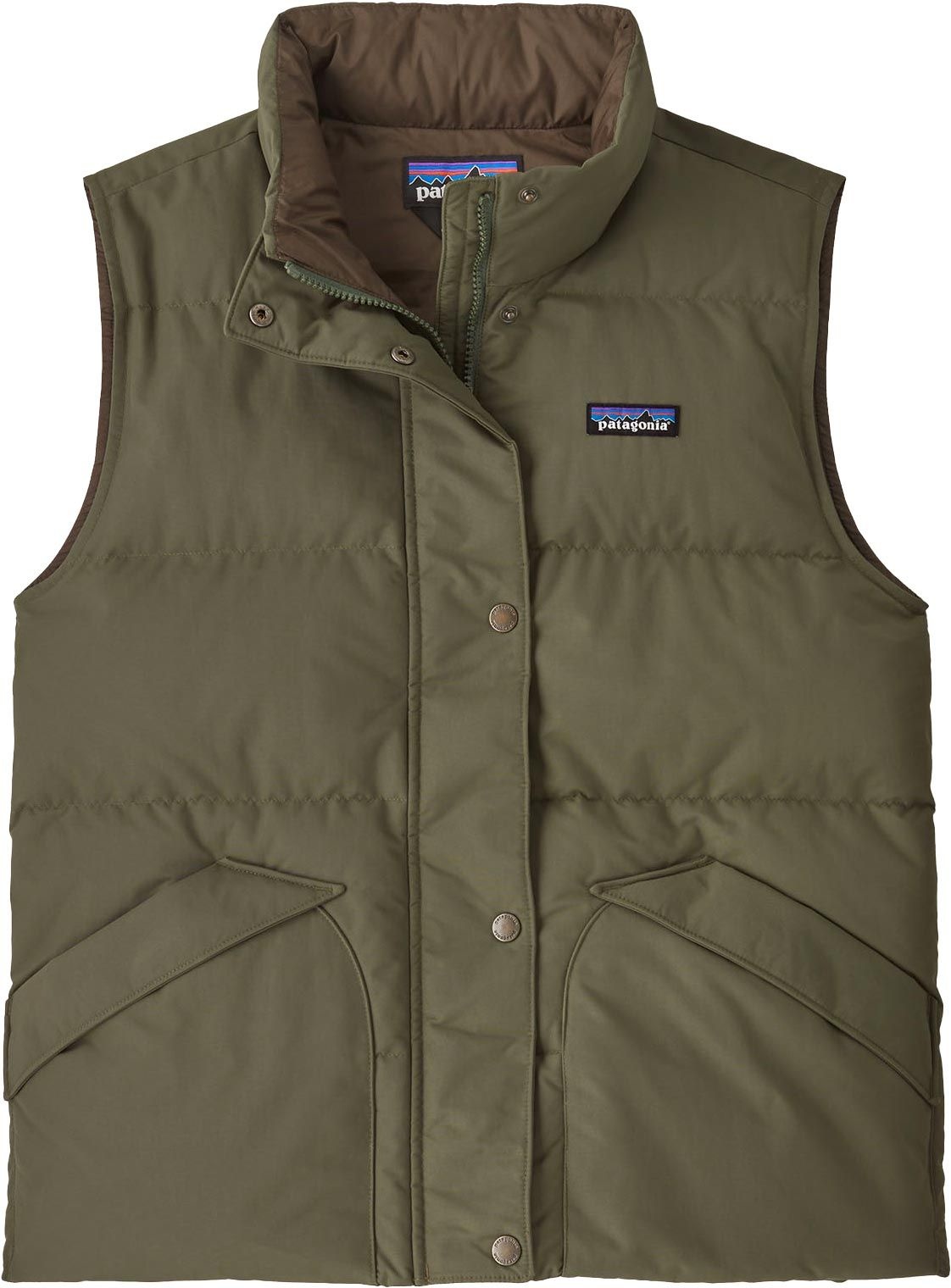 Veste sans-manches Downdrift Basin Green Patagonia femme, nylon recyclé NetPlus®, isolation duvet canard recyclé 600 CUIN, finition DWR déperlante, coupe droite inspirée années 60, deux poches à rabat.