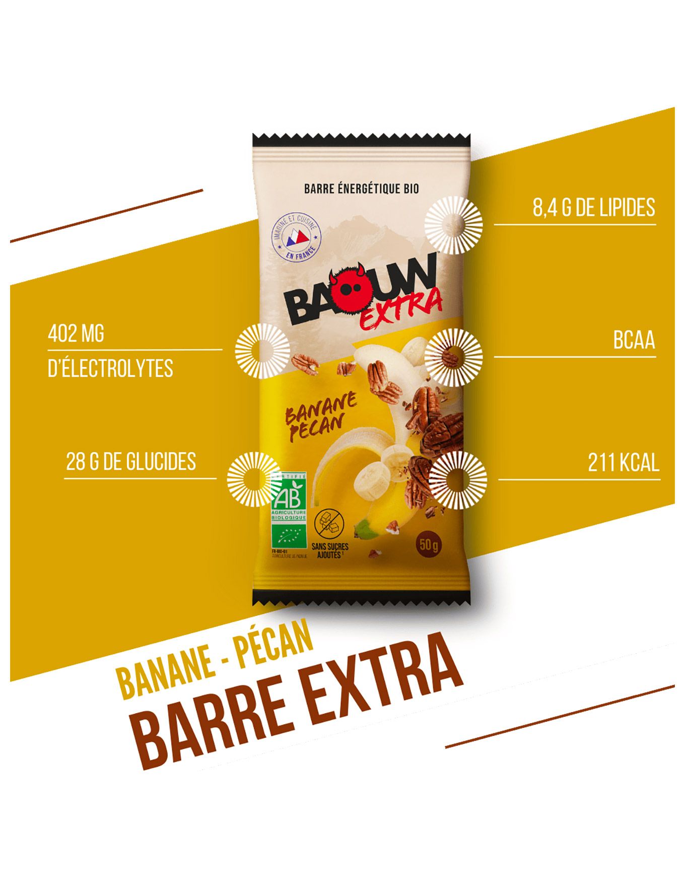 La barre bio énergie Extra aux notes de banane et de pécan signée BAOUW libère à chaque bouchée une poussée d’énergie 100 % naturelle, glissée dans une recette ultra-gourmande. Cœur fondant et éclats croquants de noix de pécan se marient à la douceur de la banane pour un feu d’artifice gustatif. Pensée pour l’effort, cette barre végétale fournit le combo gagnant : glucides d’endurance, lipides de satiété et protéines de récupération. Sans sucres ajoutés et élaborée en France, elle file dans l’estomac sans à-coups ni pics glycémiques, pour une digestion au top. Gourmandise healthy et tonique, l’Extra vous accompagne sur les trails, au bureau ou entre deux reps. Découvrir les catégories associées Barres et purées Alimentation