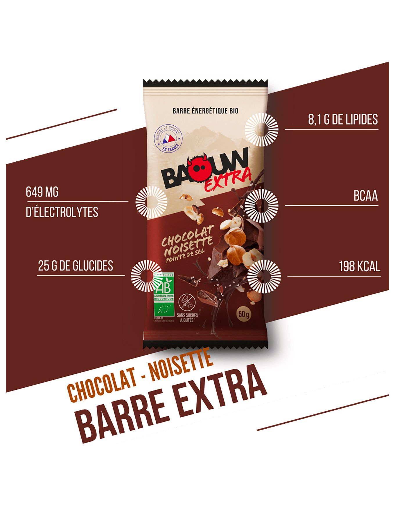 La barre bio BAOUW Extra au chocolat noisette libère à chaque pas une énergie naturelle sous une forme irrésistible. Laissez-vous surprendre par la puissance du cacao noir qui rencontre le croquant de la noisette : un duo qui fait exploser les papilles ! Conçue pour vos sorties sportives, elle fournit juste ce qu’il faut : des glucides pour tenir la distance, des lipides qualitatifs pour caler la faim, des protéines pour réparer les muscles. Française, sans sucre ajouté, elle file à l’estomac sans à-coup ni fringale. Gourmande, clean et tonique, l’Extra vous accompagne sur les trails, au open-space ou entre deux entraînements. Découvrir les catégories associées Barres et purées Alimentation