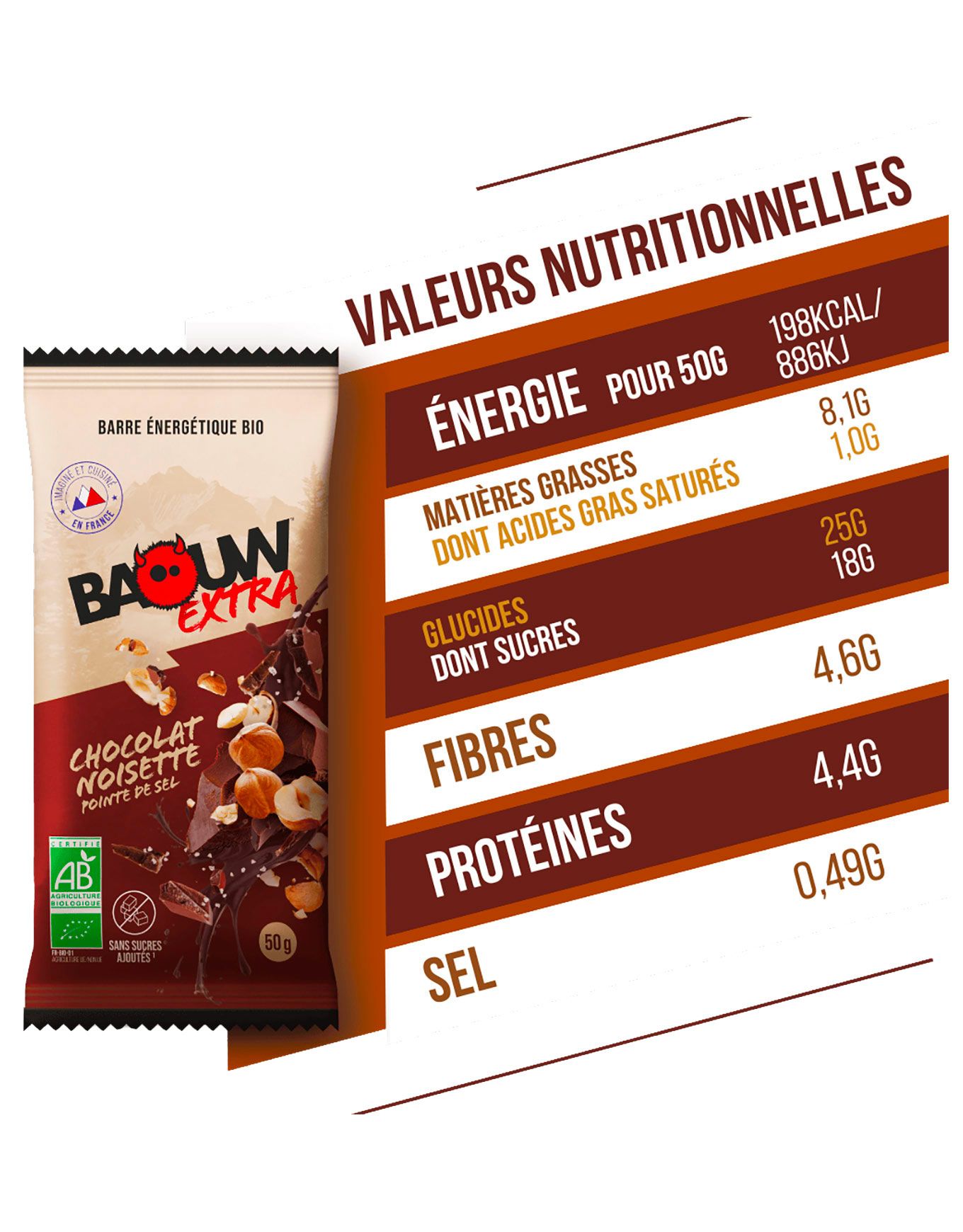 | Pour 100 g | Pour 1 barre (50 g) | |