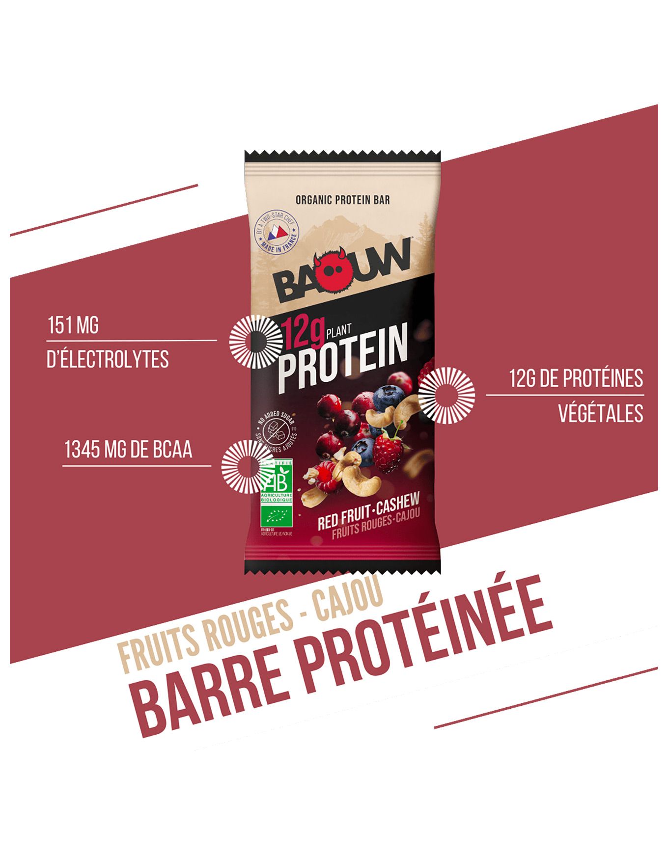 Découvrez la barre protéinée bio 50g saveur fruits rouges et cajou signée BAOUW, une friandise conçue pour améliorer vos performances et accélérer votre récupération. Cette barre 100 % naturelle marie dattes, noix de cajou, framboises, myrtilles et cranberries à 12 g de protéines de graines de courge haut de gamme, l’équivalent nutritionnel de deux œufs. Riche en micronutriments essentiels, elle soutient vos fibres musculaires, limite la fatigue et préserve votre santé. Idéale après l’effort ou en sortie longue, elle est sans gluten, sans lactose et sans céréales, convenant aux sportifs exigeants ou aux estomacs sensibles. Ses protéines végétales contribuent aussi à l’équilibre mental et au bon sommeil. Offrez-vous un coup de fouet gustatif et énergétique avant, pendant ou après chaque entraînement avec cette recette saine et savoureuse ! Découvrir les catégories associées Barres et purées Alimentation