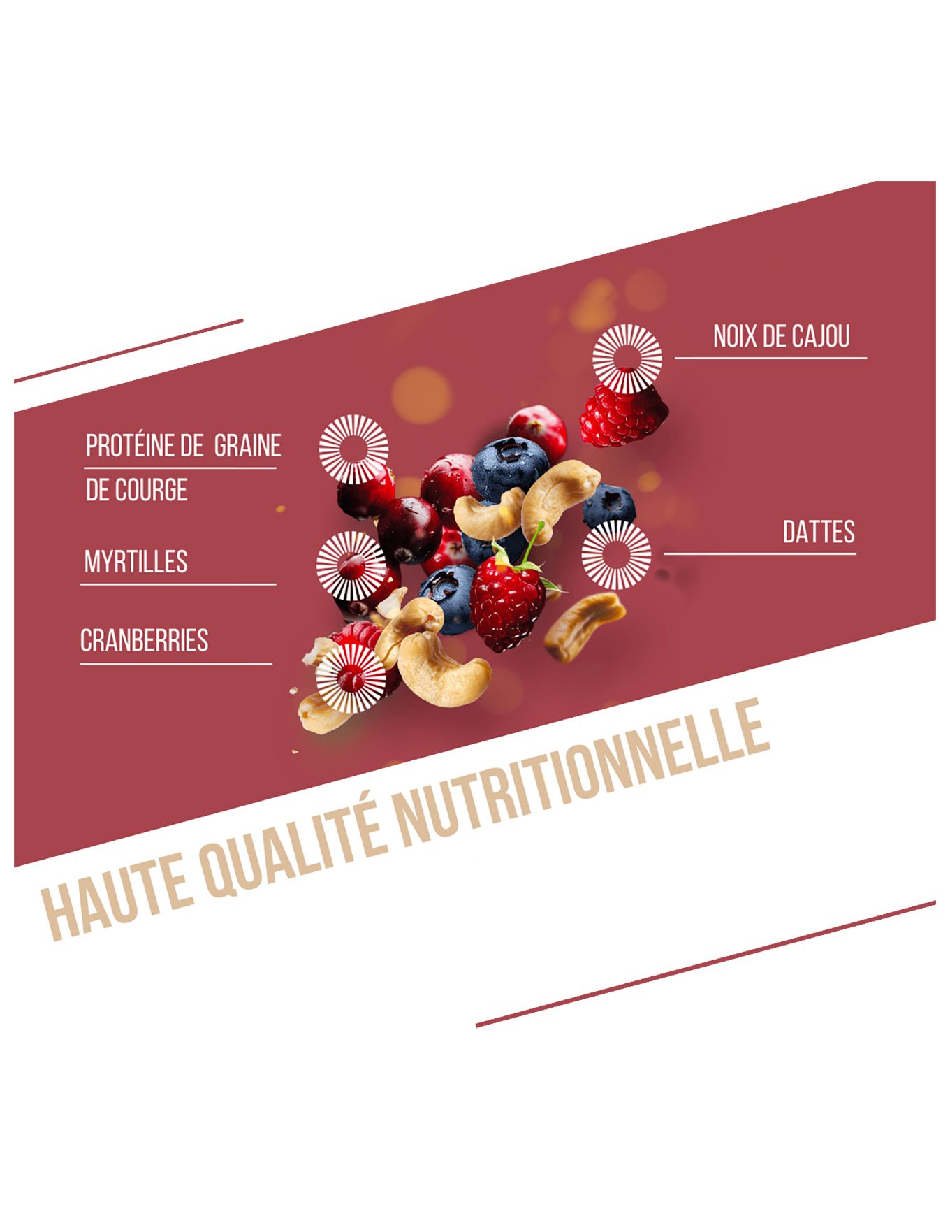 - Protéines de graines de courges toastées*, pâte de pomme* (jus concentré de pomme*, purée concentrée de pomme*), cranberries séchées* 12 % (cranberries*, jus de pomme concentré*, poudre de cranberries*, huile de tournesol*), noix de cajou* 12 %, pâte de dattes*, myrtilles sauvages séchées* 3 % (myrtilles*, sucre*, huile de tournesol*), huile d’olive vierge extra*, purée de noix de cajou*, poudre de framboise déshydratée* 1 %, arôme naturel de framboise 0,8 %