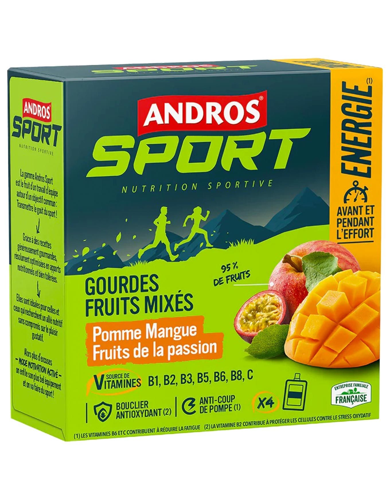 Le pack de 4 gourdes Andros Sport aux fruits mélangés Pomme-Mangue-Fruit de la Passion constitue une solution idéale pour dynamiser votre organisme. Que ce soit consommé en guise de casse-croûte avant une journée de travail ou ingéré toutes les trente minutes durant l’effort physique, ce produit allie glucose et fructose afin d’assurer à la fois une énergie immédiate et une glycémie équilibrée. Enrichi en vitamines B et E, ainsi qu’en calcium et oligo-éléments essentiels, il favorise la contraction musculaire, lutte contre le stress oxydatif et participe au maintien de l’hydratation corporelle. Grâce à sa texture fluide et sa richesse en fibres, l’assimilation s’effectue en douceur, procurant une stimulation sans sensation de pesanteur. Facile à consommer et à emporter, ce complément alimentaire vous accompagne aussi bien en amont qu’en cours d’activité physique pour maintenir vos performances avec plaisir. Découvrir les catégories associées Barres et purées Alimentation