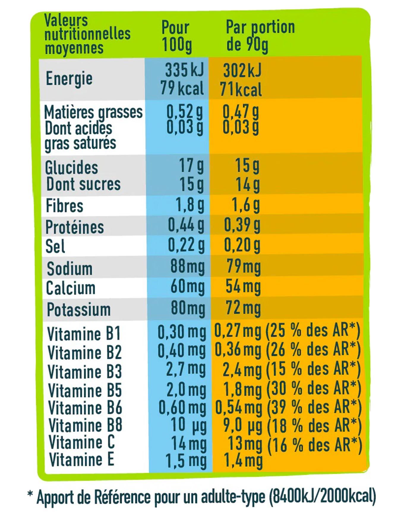 Pomme 63 %, mangues 28 %, sirop d’agave, jus de fruits de la passion 4 %, jus de citron concentré, jus concentré d’acérola, citrates de calcium, chlorure de potassium, sel, vitamines : B1, B2, B3, B5, B6, B8, E.