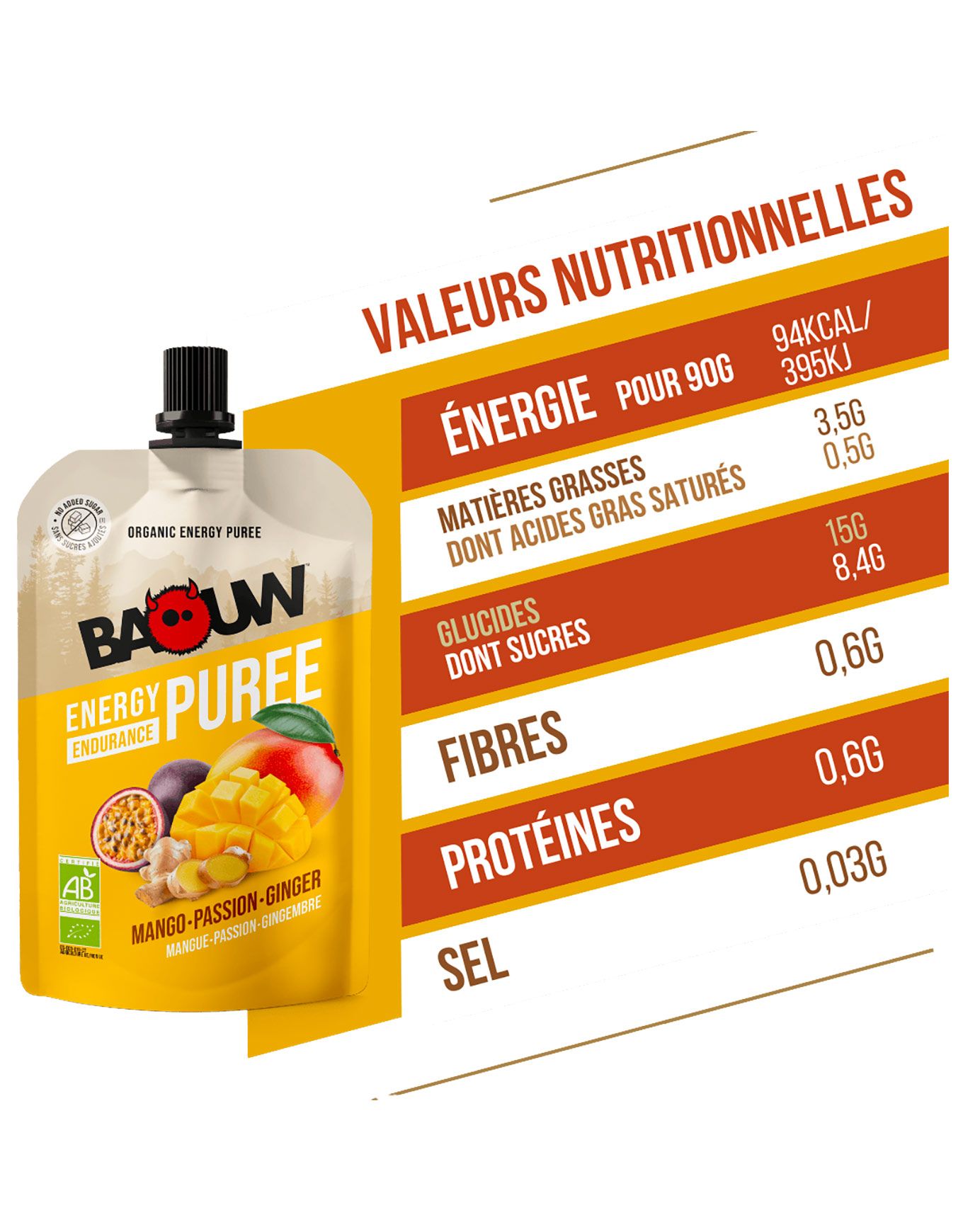 Imaginée par un chef étoilé, la purée énergétique mangue, passion, gingembre de BAOUW est une création 100 % bio conçue pour vous apporter l’énergie nécessaire jusqu’au dernier kilomètre. Des glucides immédiatement assimilables sont libérés par ce concentré dynamisant, lequel assure parallèlement une digestion ultra-douce afin que votre rythme ne soit jamais ralenti. Même lorsque la mâchoire fatigue, la consistance soyeuse et aérée de cette préparation glisse avec aisance. Fruit bio et filet d’huile d’olive vierge extra entrent dans sa composition, diffusant une énergie stable et prolongée par l’action de ses polyphénols et antioxydants. Ultra-clean, cette recette sans sucres ajoutés, vegan et sans gluten se révélera votre alliée performance. Au sein de la gamme gels et barres BAOUW, elle permet de varier les plaisirs texturés tout en maintenant l’équilibre nutritionnel durant l’intégralité de vos sorties et épreuves. Redonnez-vitalité à chaque coup de barre grâce à cette douceur BAOUW ! Découvrir les catégories associées Barres et purées Alimentation