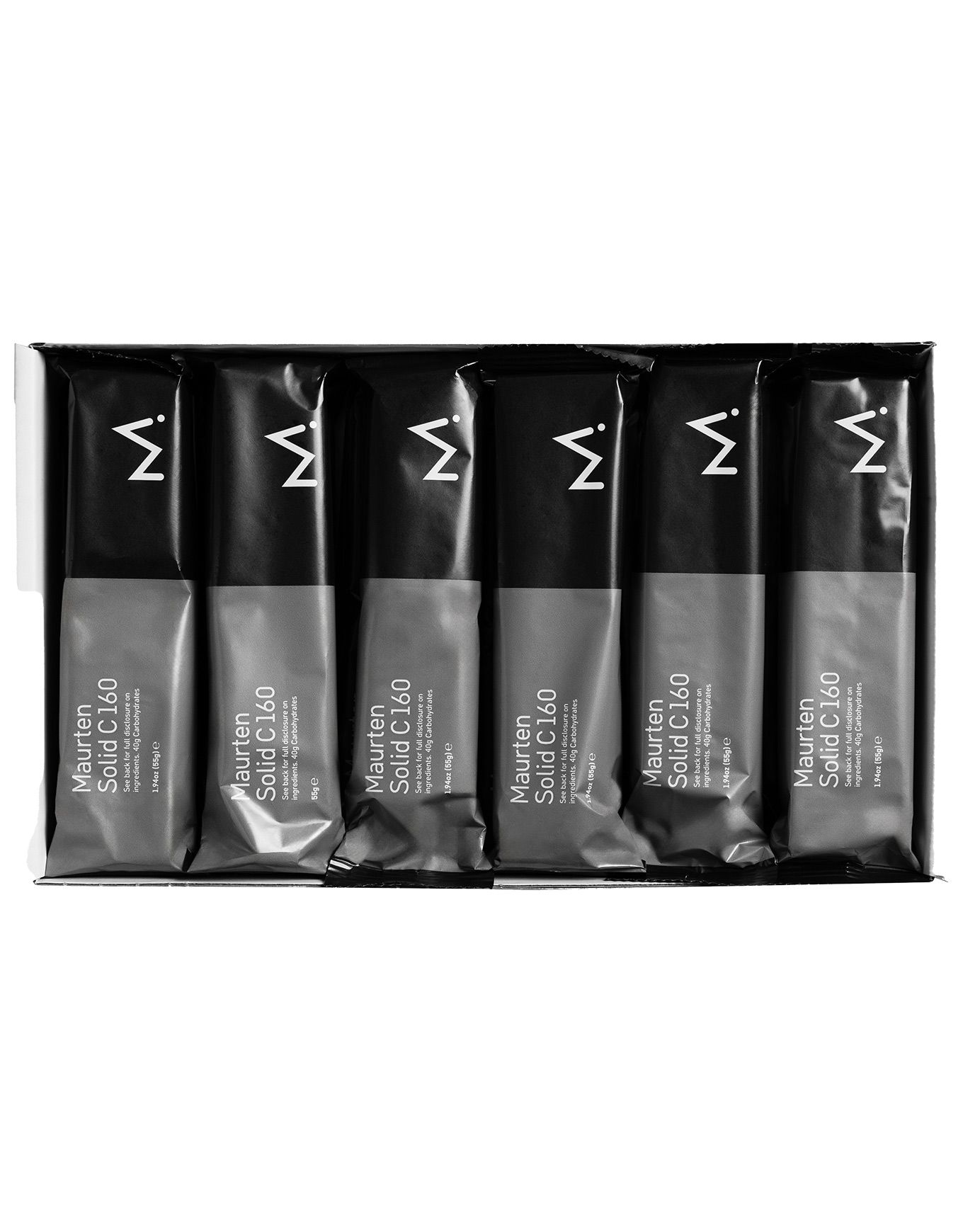 Pack de 12 barres énergétiques Maurten Solid 160 Cacao, riches en glucides et pauvres en fibres, conçues pour alimenter et accélérer la récupération lors des longues sorties sportives.