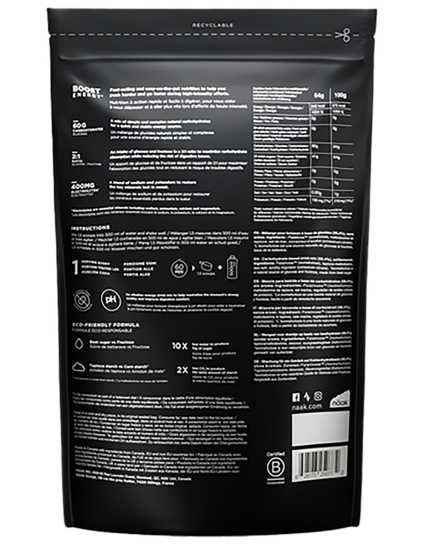 Näak Boost Energy Neutre est une préparation pour boisson énergétique apportant 60 g de glucides et 400 mg d’électrolytes pour une énergie durable sans inconfort digestif, grâce à son pH alcalin et sa formule Palatinose™ et maltodextrine de tapioca.