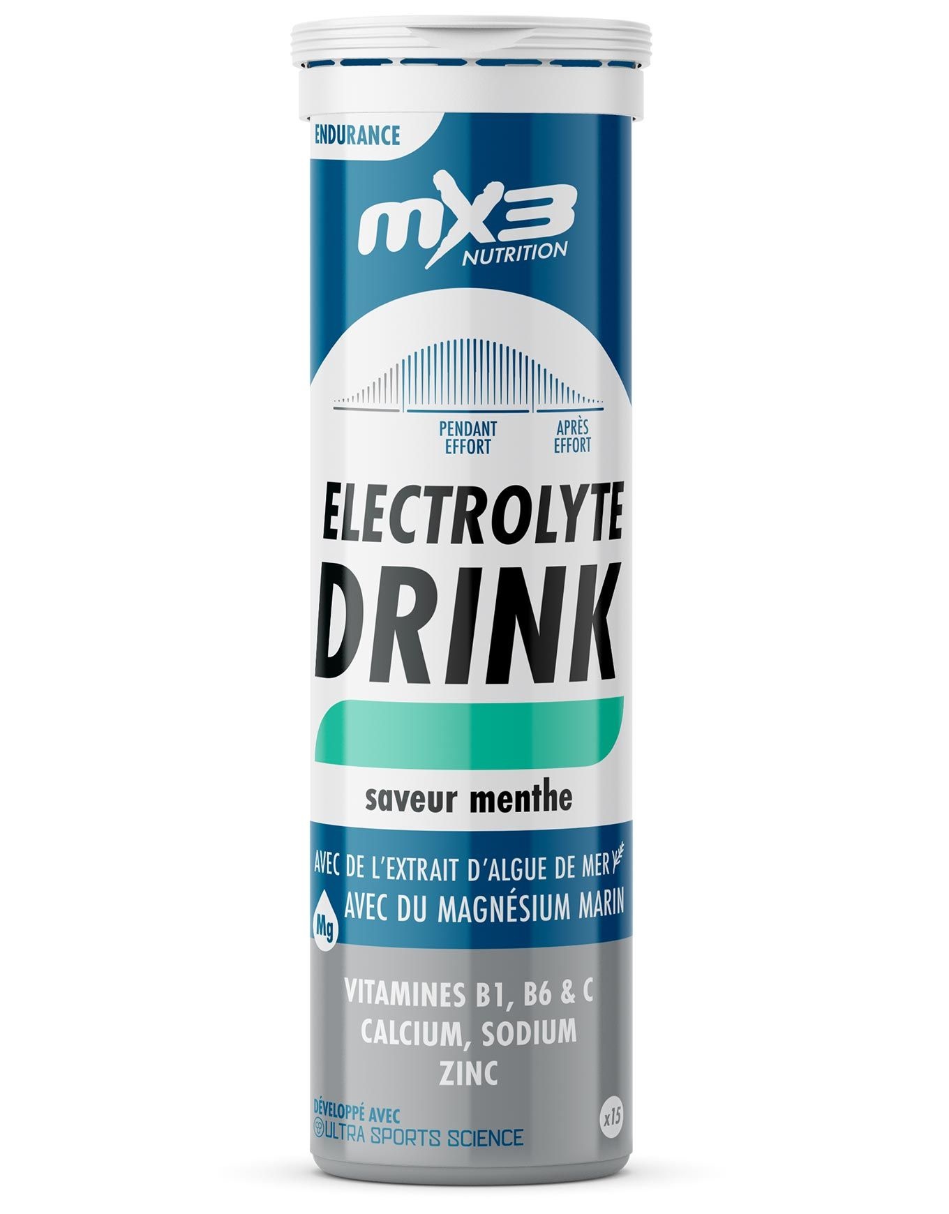 La reconstitution des minéraux et vitamines perdus durant les efforts soutenus s’effectue avec les comprimés électrolytes mentholés MX3. Dissous dans l’eau, ils préviennent la déshydratation et compensent les pertes liées à la sudation. Zinc, calcium, magnésium, potassium et sodium sont combinés dans cette formule : des nutriments essentiels au fonctionnement musculaire, articulaire et circulatoire. L’apport magnésien est encore renforcé par un extrait d’algue marine. La fatigue se voit réduite grâce aux vitamines C, B1 et B6, tandis que l’action antioxydante contre le stress oxydatif est assurée par le zinc et la vitamine C. Une note menthe vient rafraîchir agréablement la boisson. Pour une hydratation optimale, l’énergie nécessaire et le soutien de vos performances sportives, ces comprimés électrolytes au goût menthe constituent le choix idéal. Découvrir les catégories associées Boissons sportives énergétiques Alimentation