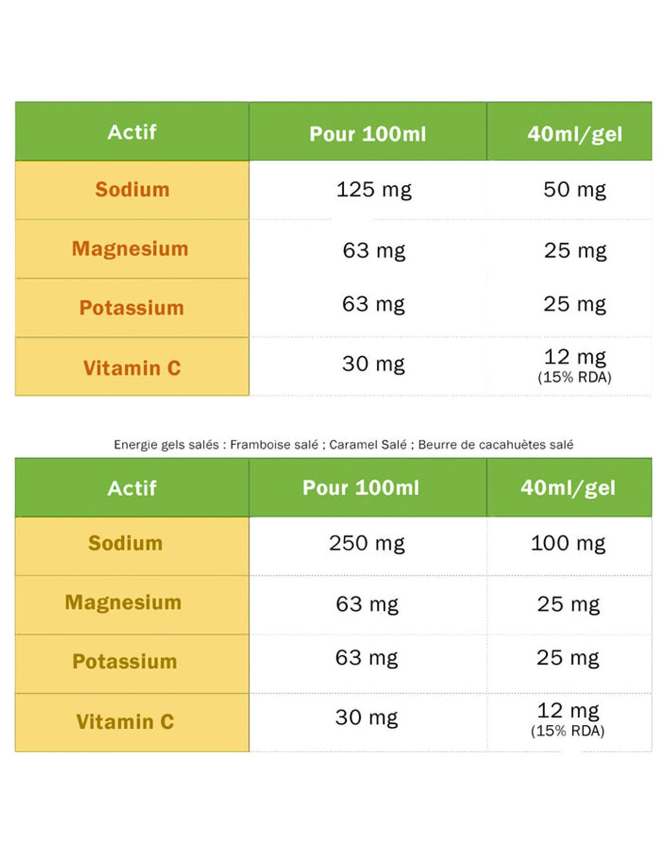 Eau, maltodextrine, sirop de glucose de maïs, saccharose, BCAA (L-Leucine, isoleucine, L-valine), électrolytes (citrate de magnésium, chlorure de sodium, chlorure de potassium), arôme naturel, acidifiant (acide citrique), vitamine C (acide ascorbique), émulsifiant (lécithine de tournesol), conservateur (sorbate de potassium), gélifiant (gomme gellane), caféine