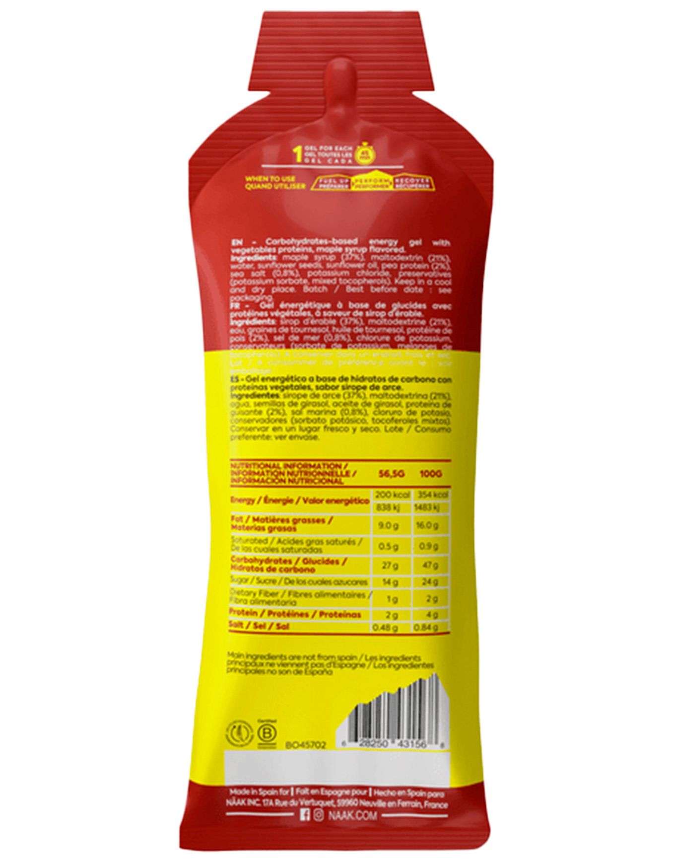 - 27 g de glucides naturels : ratio 1:1 entre sucres rapides et complexes, assurant une montée d’énergie immédiate sans rebrit. Ratio glucose/fructose 3:1 pour une absorption optimale.