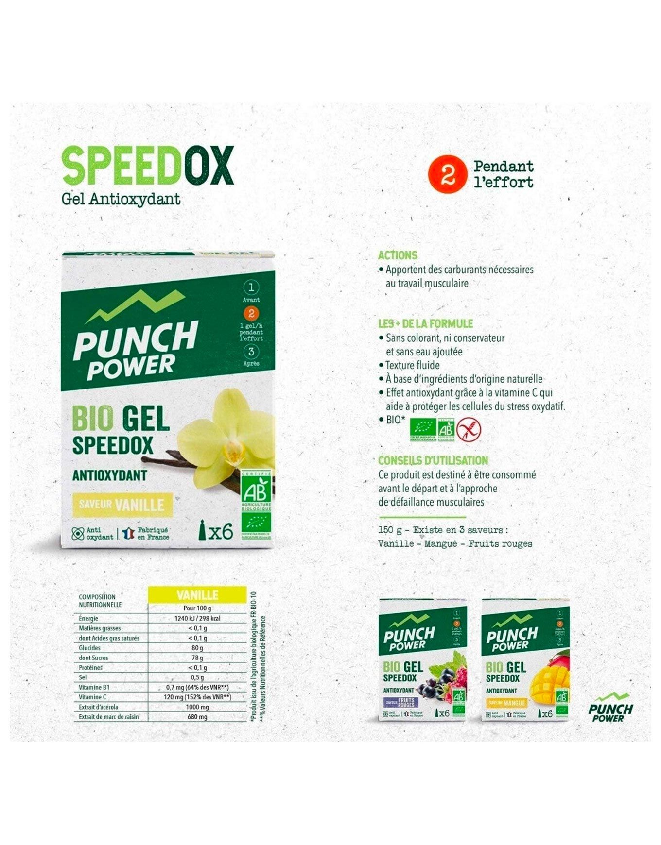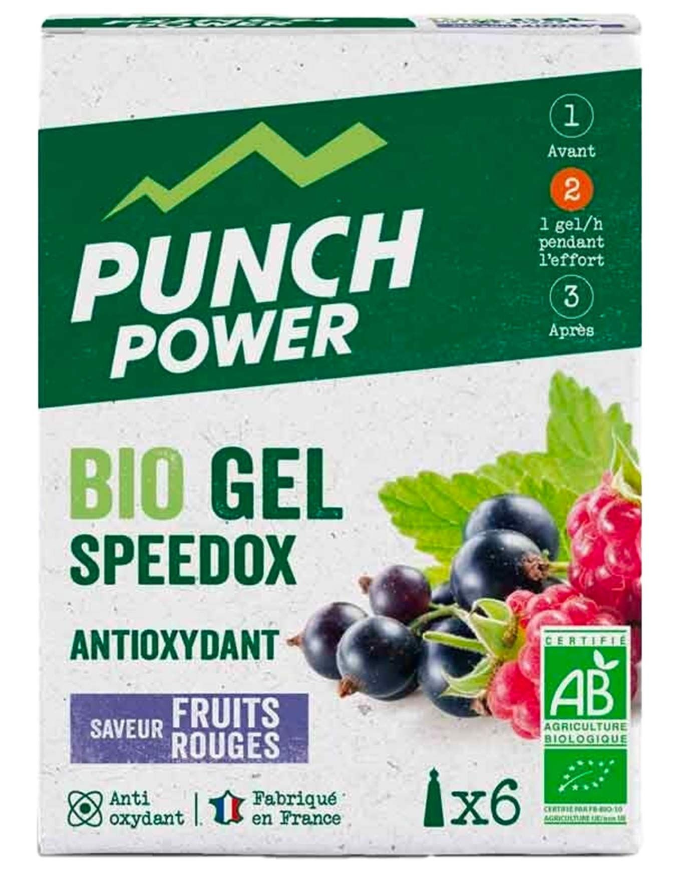 Les gels antioxydants Speedox Fruits Rouges de Punch Power vous donneront un coup de fouet énergétique sur les efforts longs. Grâce à sa teneur élevée en vitamine C, ce gel protège les cellules du stress induit par l’activité physique intense. Son mélange de glucides libère une énergie en douceur, parfait pour les sorties d’endurance. Prenez un tube juste avant le départ et dès les premiers signes de fatigue musculaire pour un effet maximal. Sans colorants, sans conservateurs ni arômes de synthèse, bio et sans gluten, Speedox offre un soutien 100 % naturel pour tenir la distance en entraînement comme en compétition. Découvrir les catégories associées Gels et gommes Alimentation