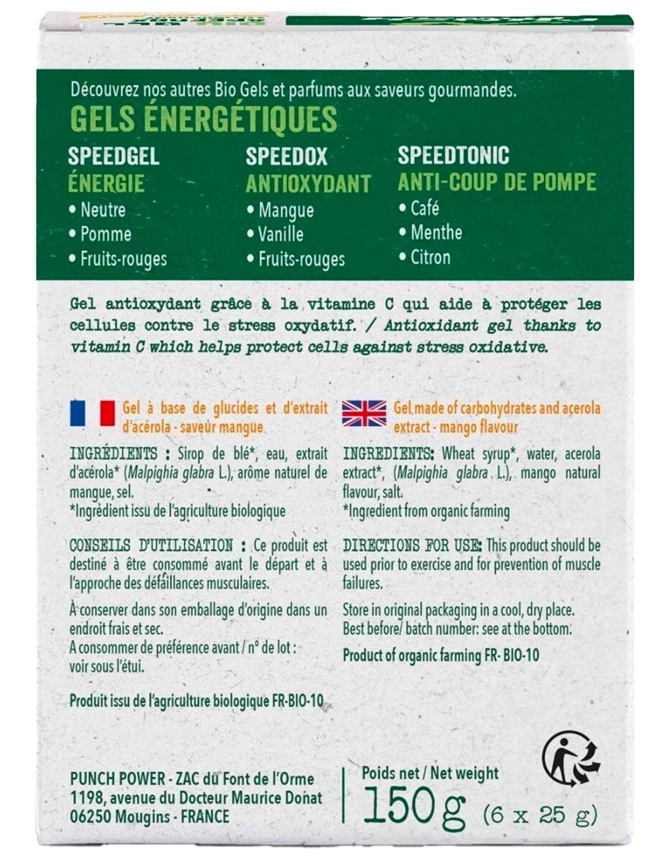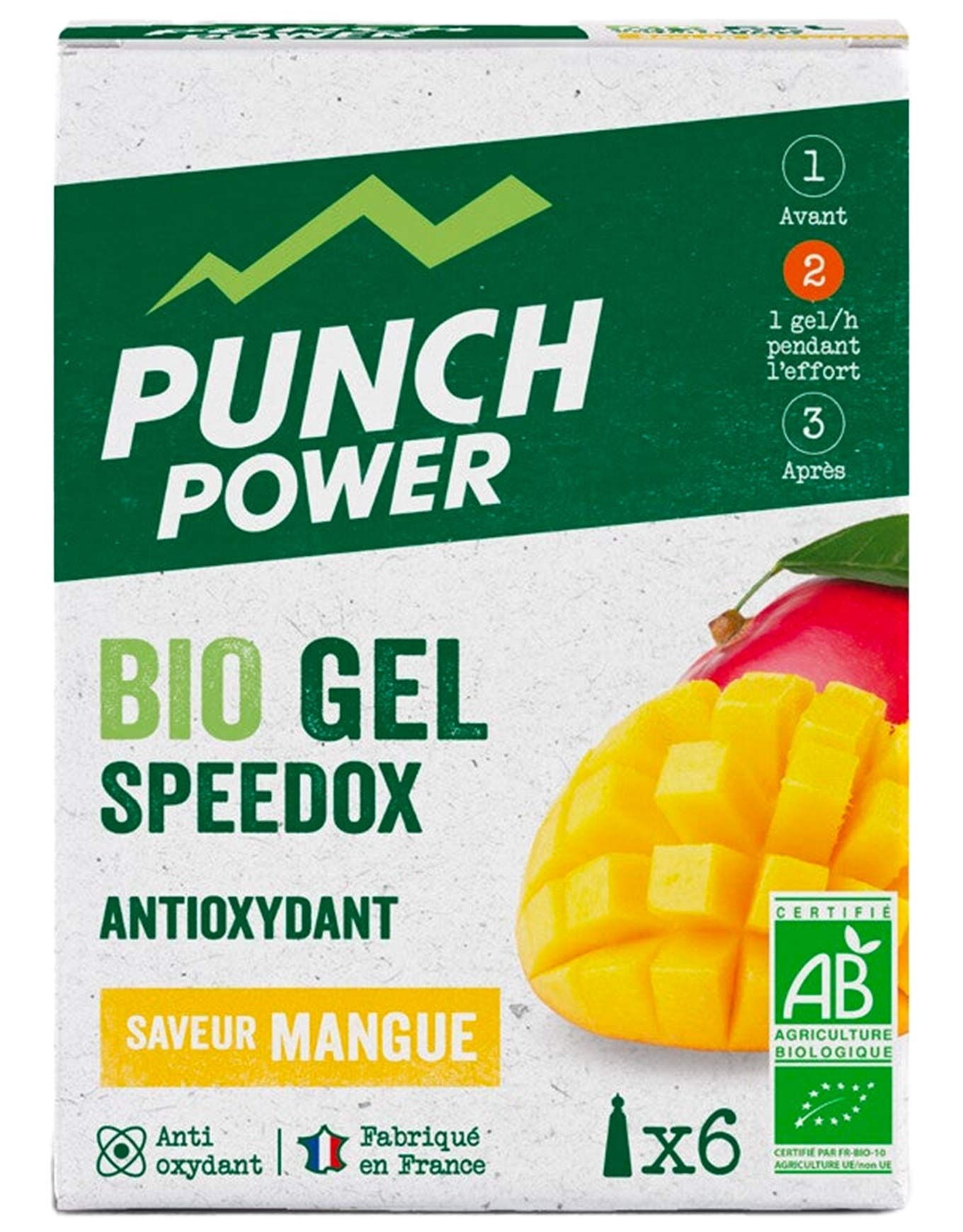 Propulsez votre énergie lors des efforts prolongés avec les gels antioxydants Speedox Mangue de Punch Power. Riche en vitamine C, ce gel énergétique assure la protection cellulaire face aux agressions engendrées par l’intensité de l’effort. Une énergie progressive est diffusée par ses glucides, idéale pour les sorties de moyenne et longue durée. Pour un effet optimal, la consommation d’un tube est recommandée avant le départ ainsi qu’à l’apparition des premiers signes de fatigue musculaire. Bio, sans gluten, dépourvu de colorants, conservateurs et arômes artificiels, le Speedox procure un coup de boost naturel et durable accompagné d’une protection antioxydante tout au long des entraînements et compétitions. ATTENTION : barre avec une DLUO* au 03/12/2025 *La DLUO (Date Limite d’Utilisation Optimale) est un indicatif de qualité, soit une date après laquelle le produit perd des vertus organoleptiques (croquant, moelleux, texture) sans présenter de risques pour la santé (contrairement à une DLC). Découvrir les catégories associées Gels et gommes Alimentation