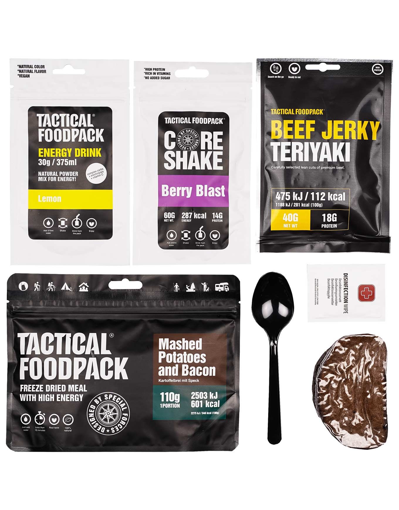 Conçue pour les expéditions de longue durée et les situations de survie, la sélection d’aliments déshydratés du pack 1 repas Delta par Tactical Foodpack restitue l’intégralité de la vitalité et des nutriments essentiels en un instant. La préservation des arômes, saveurs et valeurs nutritionnelles est assurée par la lyophilisation : votre plat chaud, prêt en quelques minutes, vous redonne l’énergie indispensable pour continuer l’ascension. L’insertion de ces sachets ultra-compacts et légers dans le sac s’effectue sans difficulté, permettant une optimisation de l’espace disponible. L’ensemble comprend un plat principal Tactical Foodpack, plusieurs collations et une boisson énergisante. Sont également fournis : une cuillère, un gobelet Tactical ainsi qu’une lingette nettoyante pour les mains. Découvrir les catégories associées Packs Alimentation