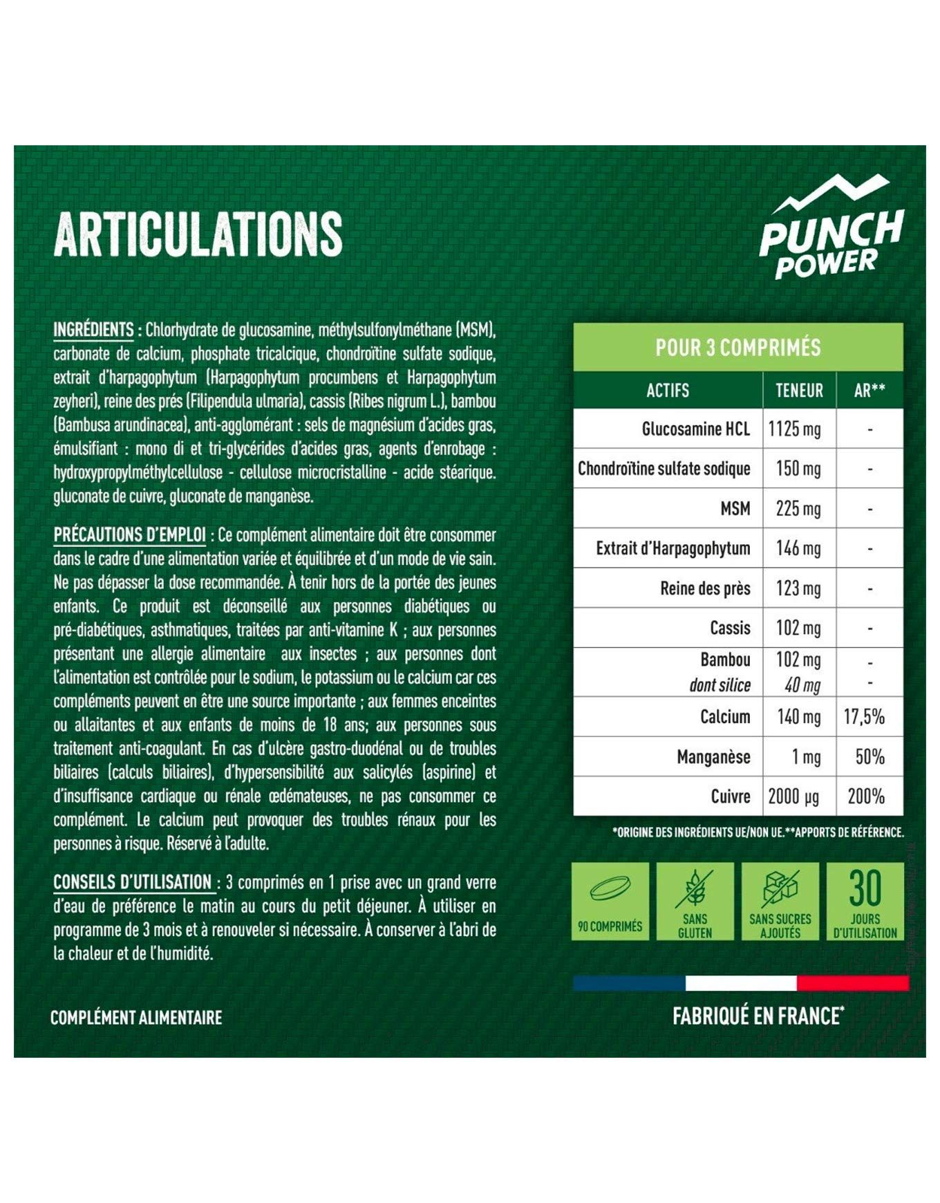 Glucosamine HCL, minéraux : carbonate de calcium – phosphate tricalcique – gluconate de cuivre – gluconate de manganèse, méthylsulfonylméthane (MSM), chondroïtine sulfate sodique, extrait d’harpagophytum, reine-des-prés, cassis, bambou