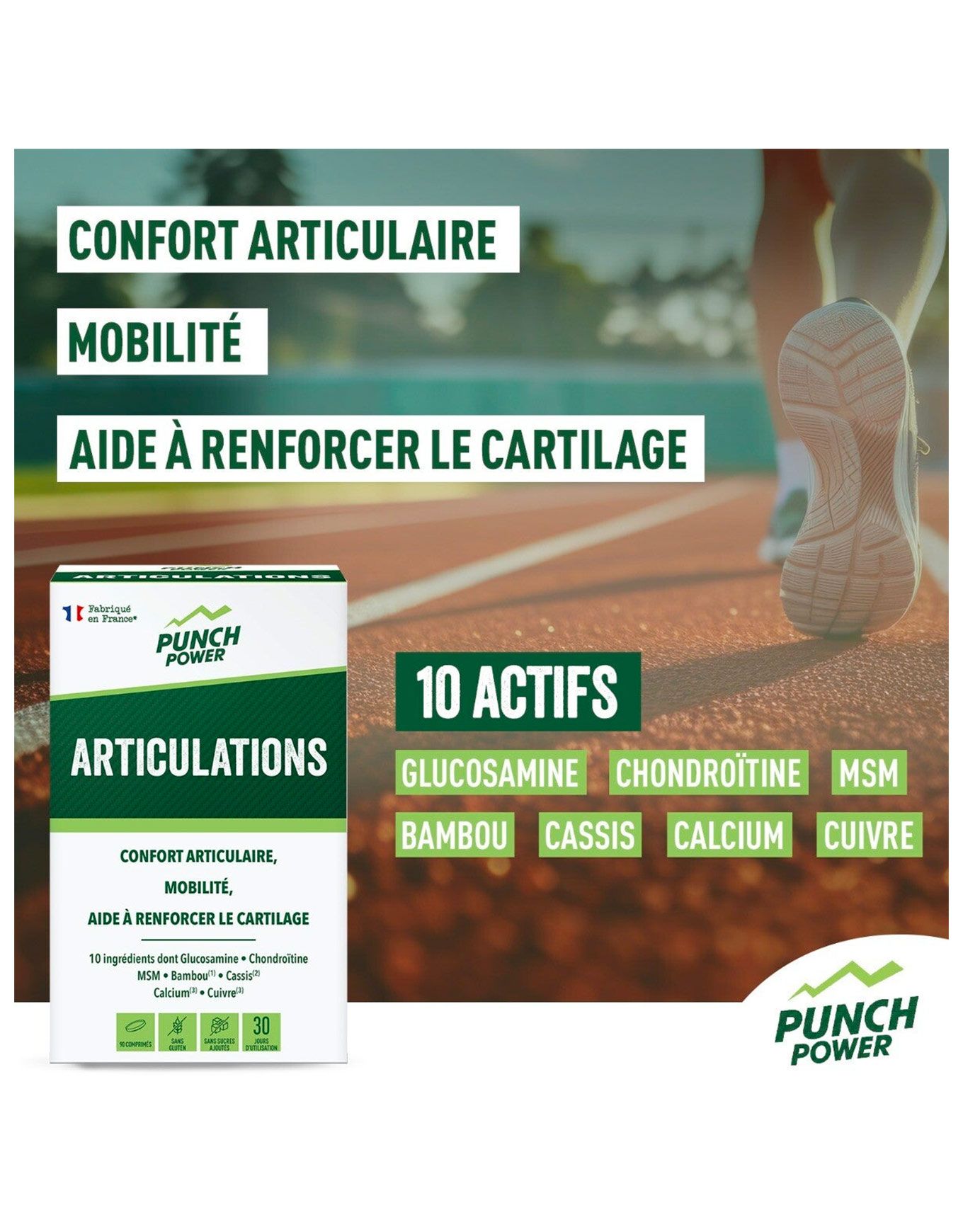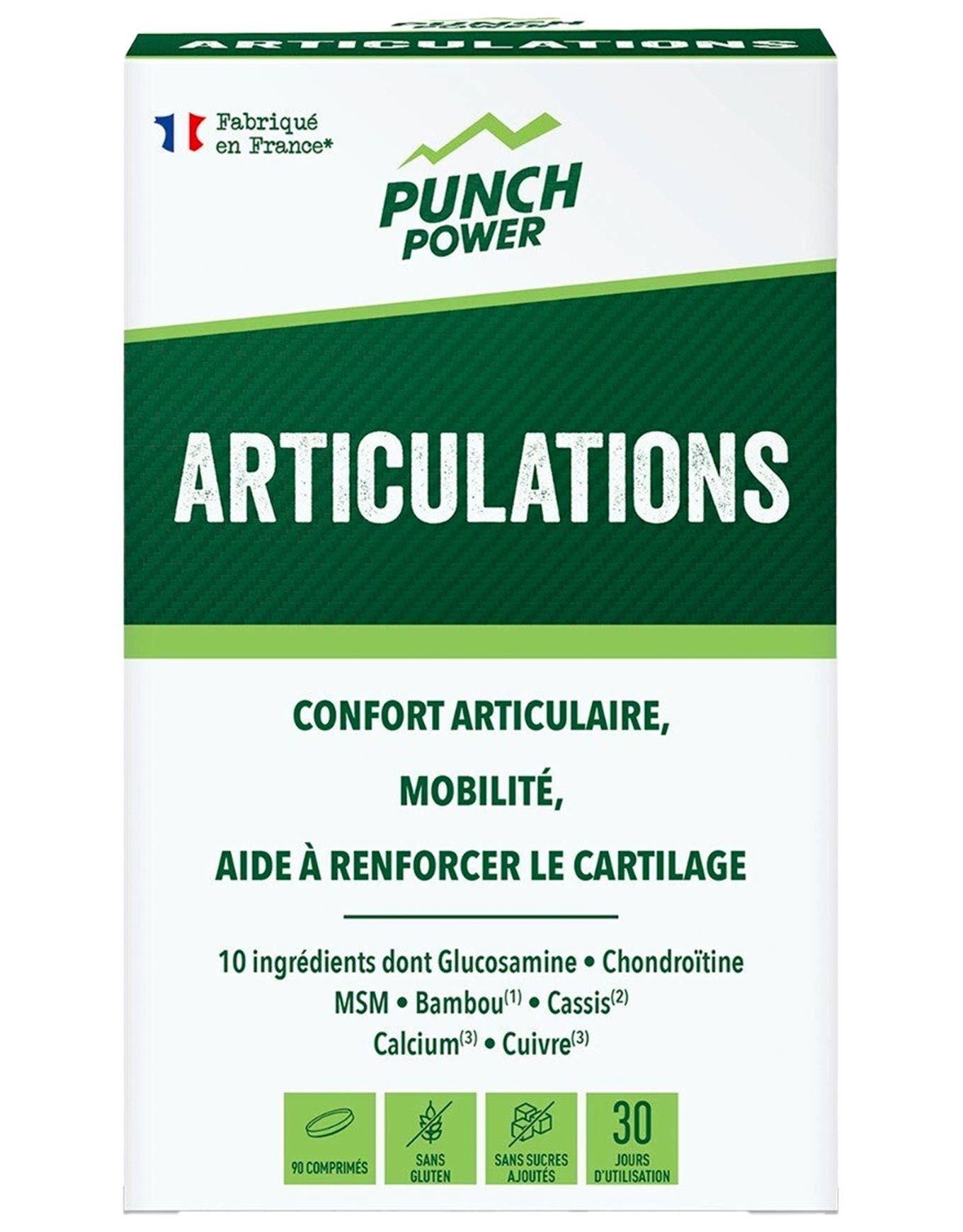 Issus de la marque Punch Power, ces 90 comprimés forment un complément nutritionnel élaboré en vue d’améliorer la mobilité articulaire. Cette préparation s’adresse tant aux athlètes qu’aux individus dynamiques, étant fabriquée à base de composants naturels et d’oligo-éléments indispensables pour optimiser souplesse, flexibilité et solidité des articulations. La souplesse est améliorée et les gênes diminuées grâce à la glucosamine, la chondroïtine et le MSM, tandis que l’assouplissement des articulations est favorisé par l’harpagophytum, le cassis et la Reine-Des-Prés. Par ailleurs, la santé des tissus conjonctifs et articulaires trouve un allié dans le bambou. Le capital osseux est préservé par l’action conjuguée du calcium et du manganèse, alors que la récupération musculaire post-effort bénéficie de l’intervention du cuivre. Avec cette formule naturelle et performante, Punch Power — spécialiste de la nutrition sportive — accompagne les athlètes dans leur recherche de performance et d’équilibre physique. Découvrir les catégories associées Préparation et récupération Alimentation