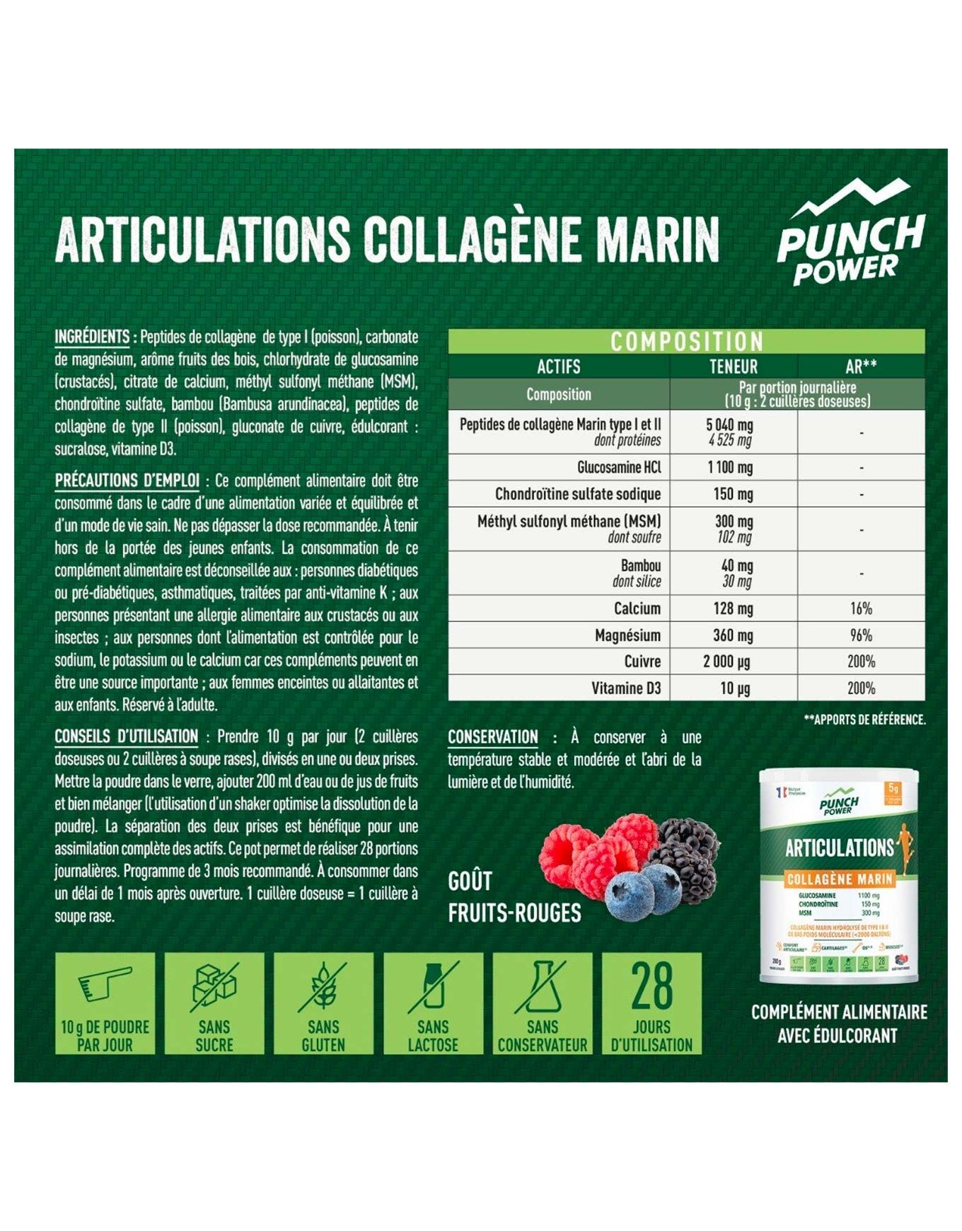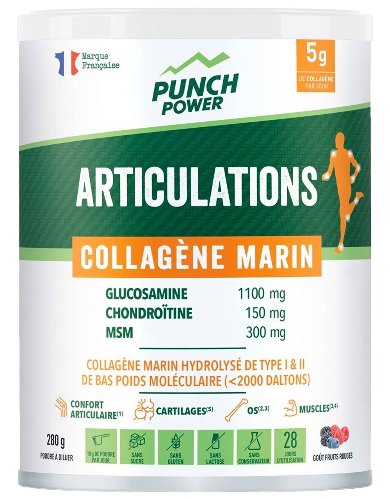 Punch Power Collagène Marin Articulations est un complément alimentaire en poudre qui apporte 5040 mg de peptides de collagène marin hydrolysé, glucosamine, MSM et chondroïtine pour soutenir la mobilité, la résistance articulaire et accélérer la récupération après l’effort.