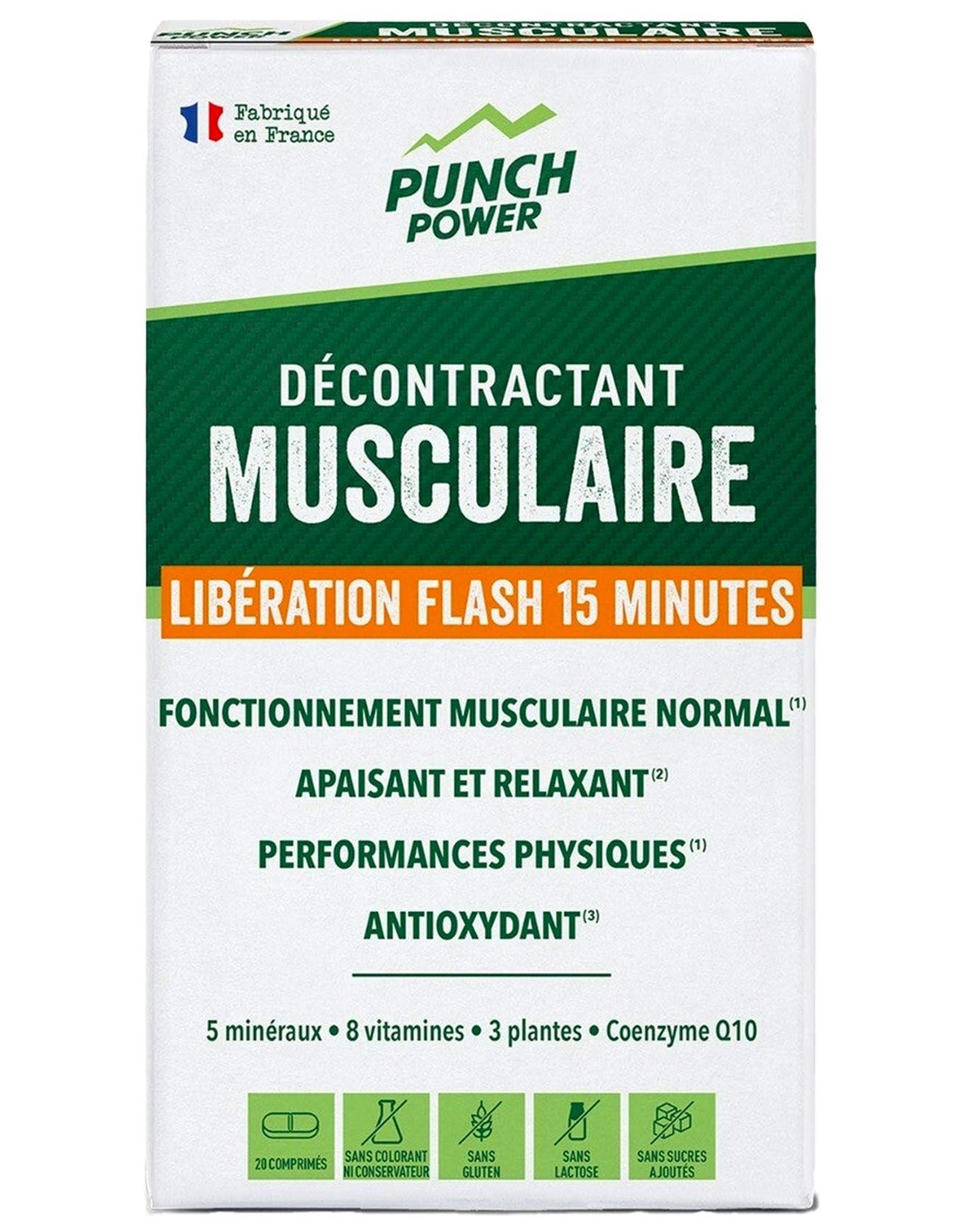 Conçu pour apaiser rapidement les tensions musculaires et optimiser la récupération post-effort, le Décontractant Musculaire Fort de Punch Power est un complément alimentaire aux effets rapides. Agissant en seulement 15 minutes, ce produit offre une puissante action relaxante sur la musculature. Les tensions sont spécifiquement ciblées, les douleurs atténuées et la sensation de fatigue diminuée grâce à une formule riche en minéraux, vitamines, extraits végétaux et Coenzyme Q10. La communication nerveuse est améliorée, les muscles relâchés, la production énergétique stimulée et une protection contre le stress oxydatif est assurée. Pour prévenir les contractures avant l’entraînement ou favoriser une récupération paisible suite à une activité intense, la prise recommandée est de quatre comprimés au réveil ou deux le matin et le soir, hors des repas, accompagnés d’un grand verre d’eau. Ainsi, une réponse immédiate et performante est offerte pour une récupération musculaire optimale ou une préparation idéale avant compétition. Découvrir les catégories associées Préparation et récupération Alimentation