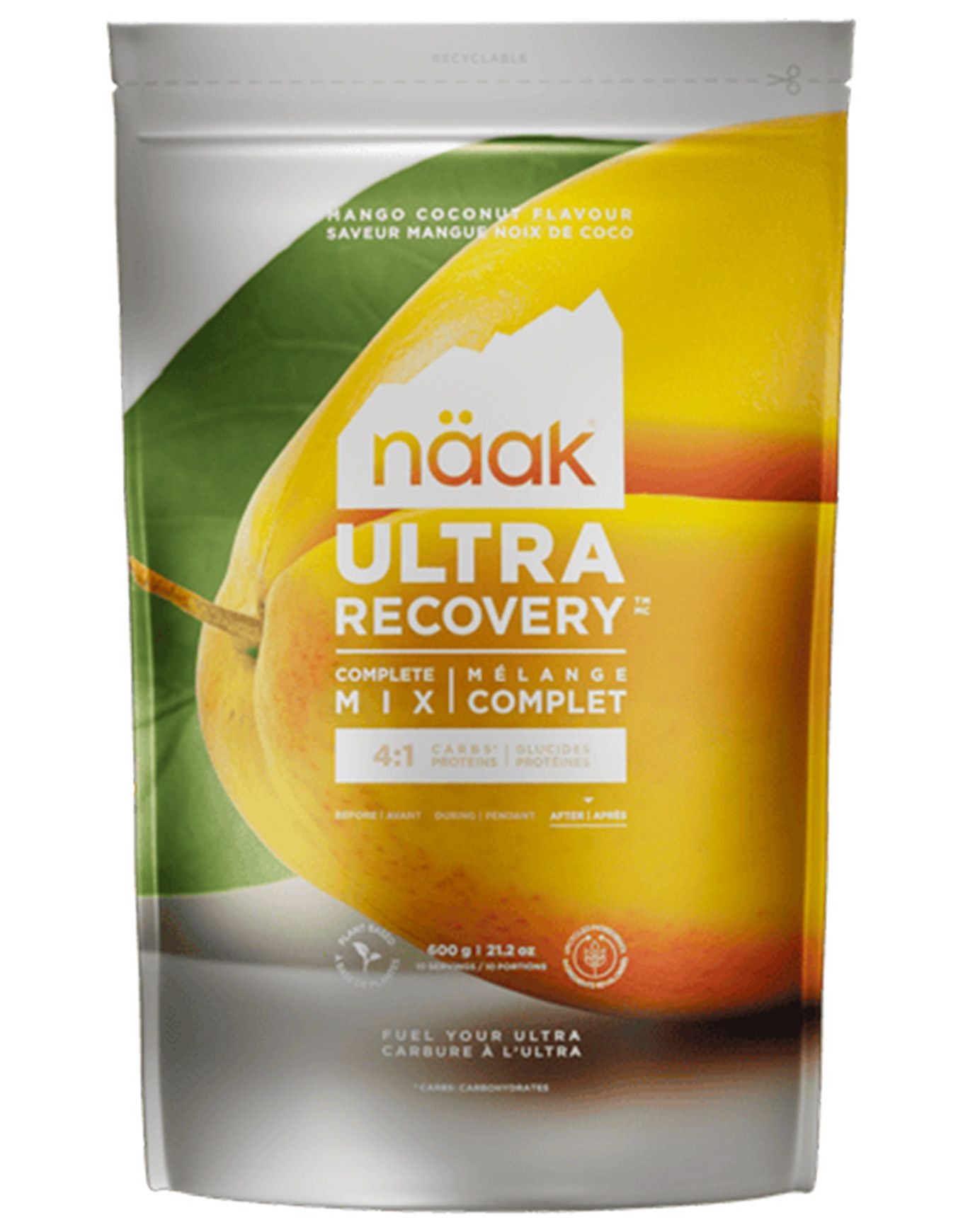 Näak Préparation boisson récupération mangue coco, 40 g glucides, 10 g protéines, 1800 mg BCAA, 520 mg électrolytes, sans gluten, végétale, pour réparation et réhydratation post-effort.