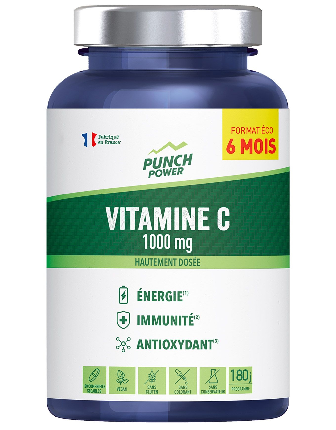 Une excellente assimilation est proposée par ces comprimés de vitamine C de la marque Punch Power, permettant de stimuler votre énergie quotidienne ! Sous forme liposomale micro-encapsulée, chaque comprimé fournit 1000 mg de vitamine C pour une biodisponibilité optimisée. De la cellulose microcristalline et du carbonate de magnésium sont également intégrés à la formulation. La prise conseillée correspond à 1 à 2 comprimés par jour, à ingérer accompagnés d’un grand verre d’eau, lors du petit-déjeuner et/ou du déjeuner. Les adultes ainsi que les enfants âgés de plus de 10 ans constituent le public cible de ce complément. Découvrir les catégories associées Préparation et récupération Alimentation