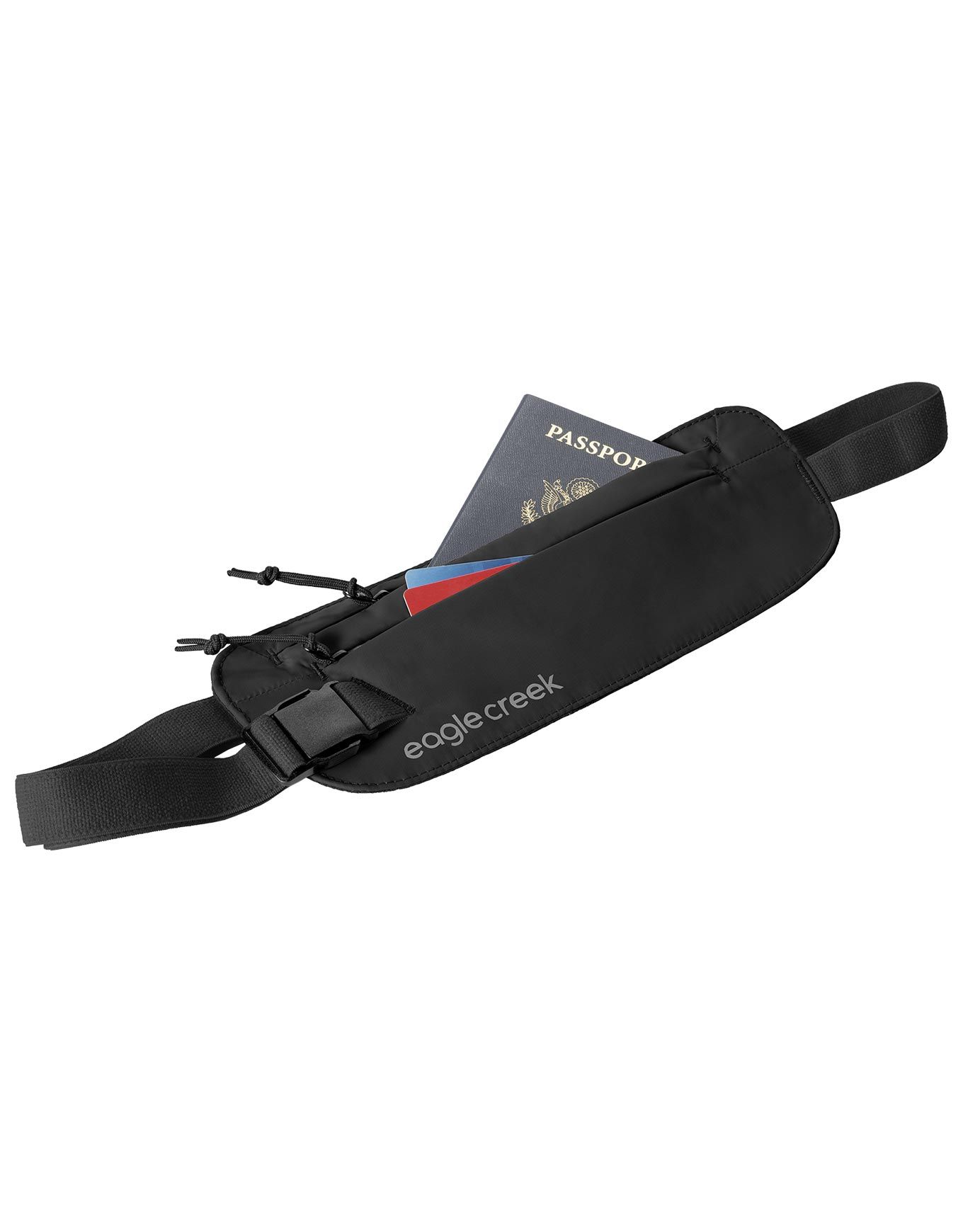 Eagle Creek Undercover RFID Money Belt Black : ceinture porte-monnaie discrète en tissu recyclé doux et respirante, avec deux compartiments zippés pour protéger billets, cartes et papiers d’identité contre le vol et les lectures RFID.