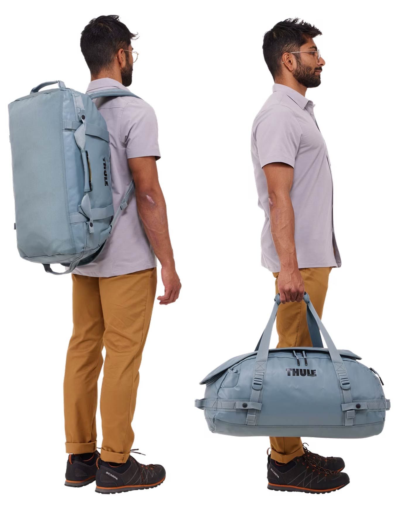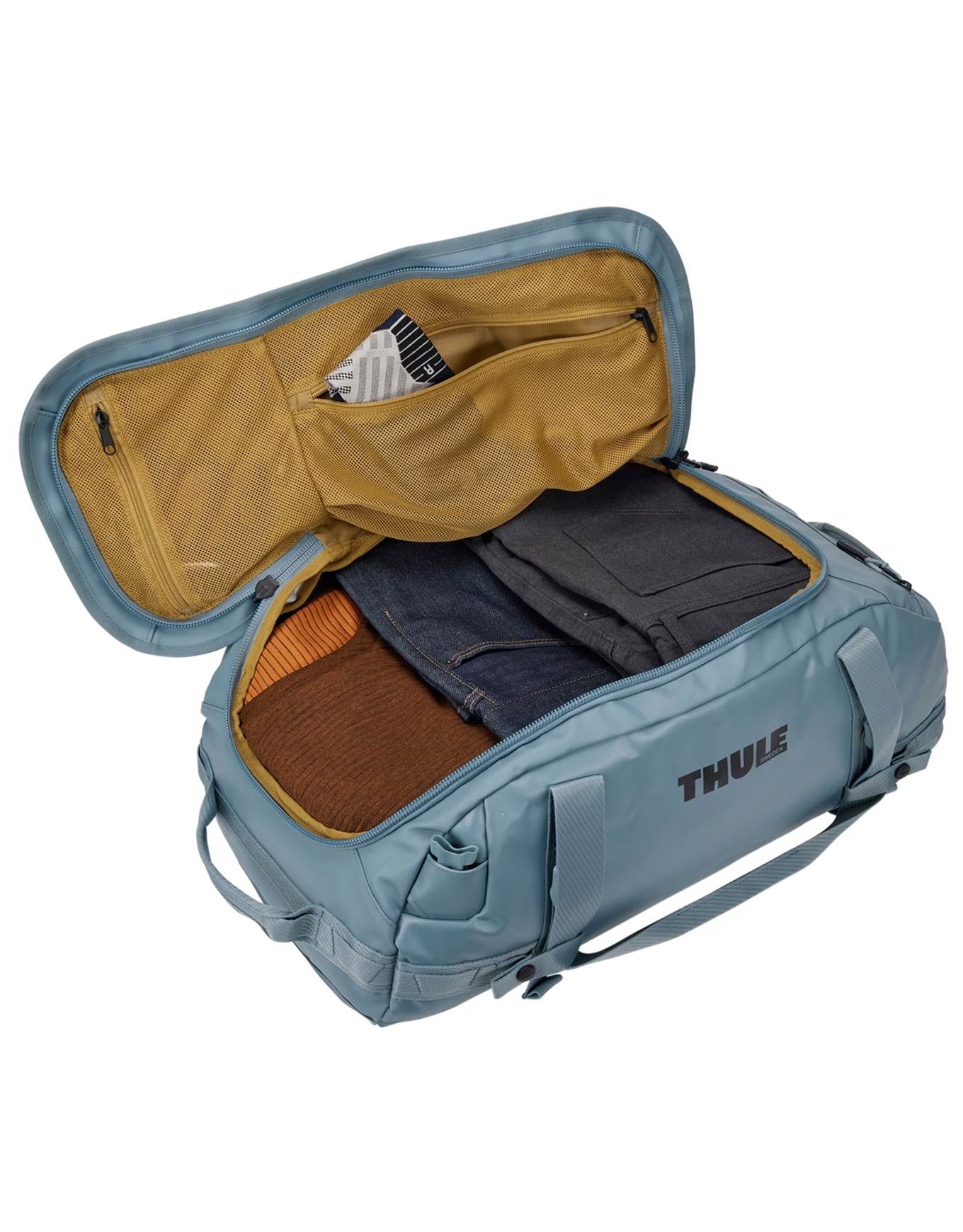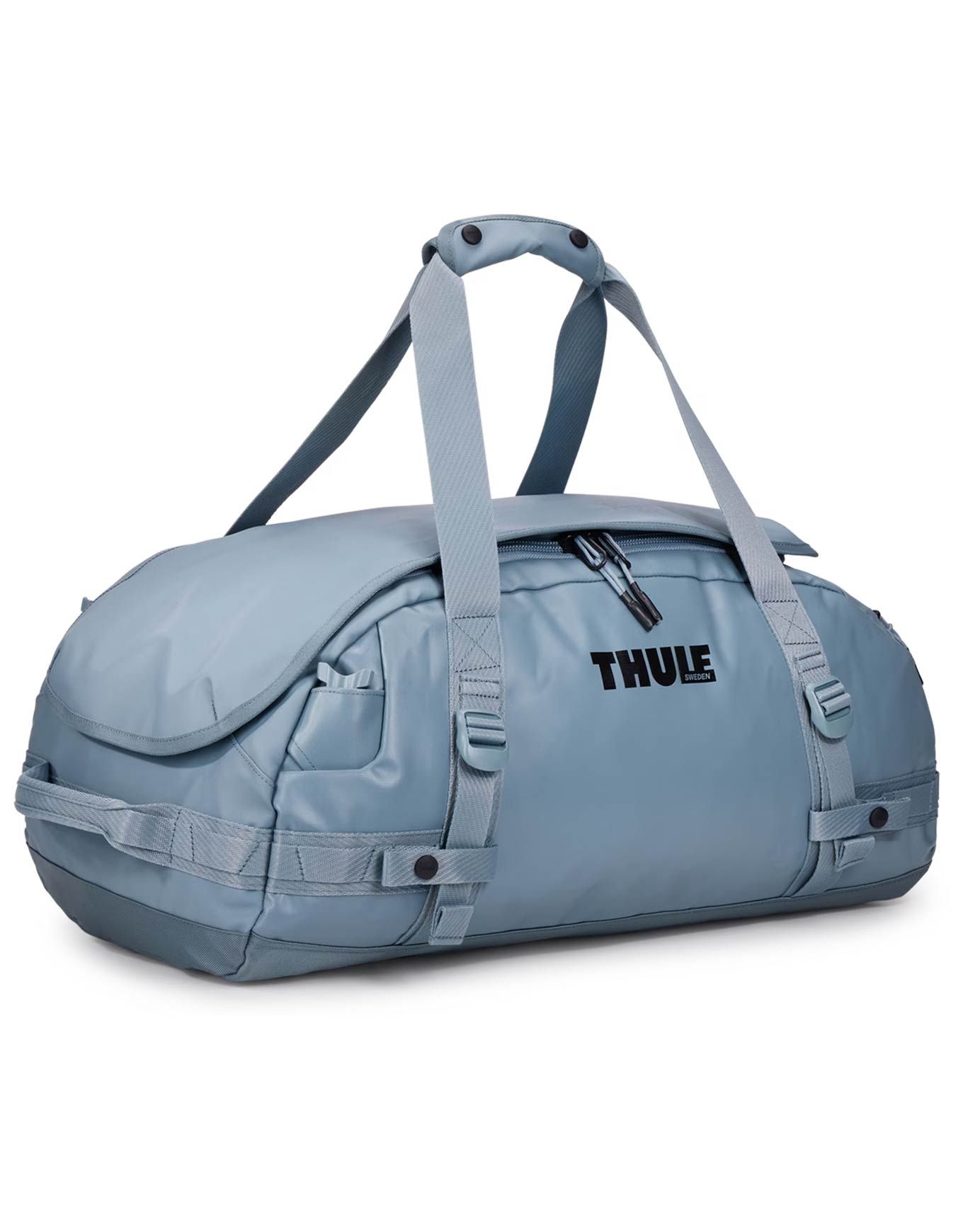 Sac de transport unisexe Thule Chasm 40L Duffel Bag Pond Gray, résistant aux intempéries, se porte à la main ou à dos grâce à ses bretesses amovibles, avec poche rapide, intérieur organisé et fond renforcé.