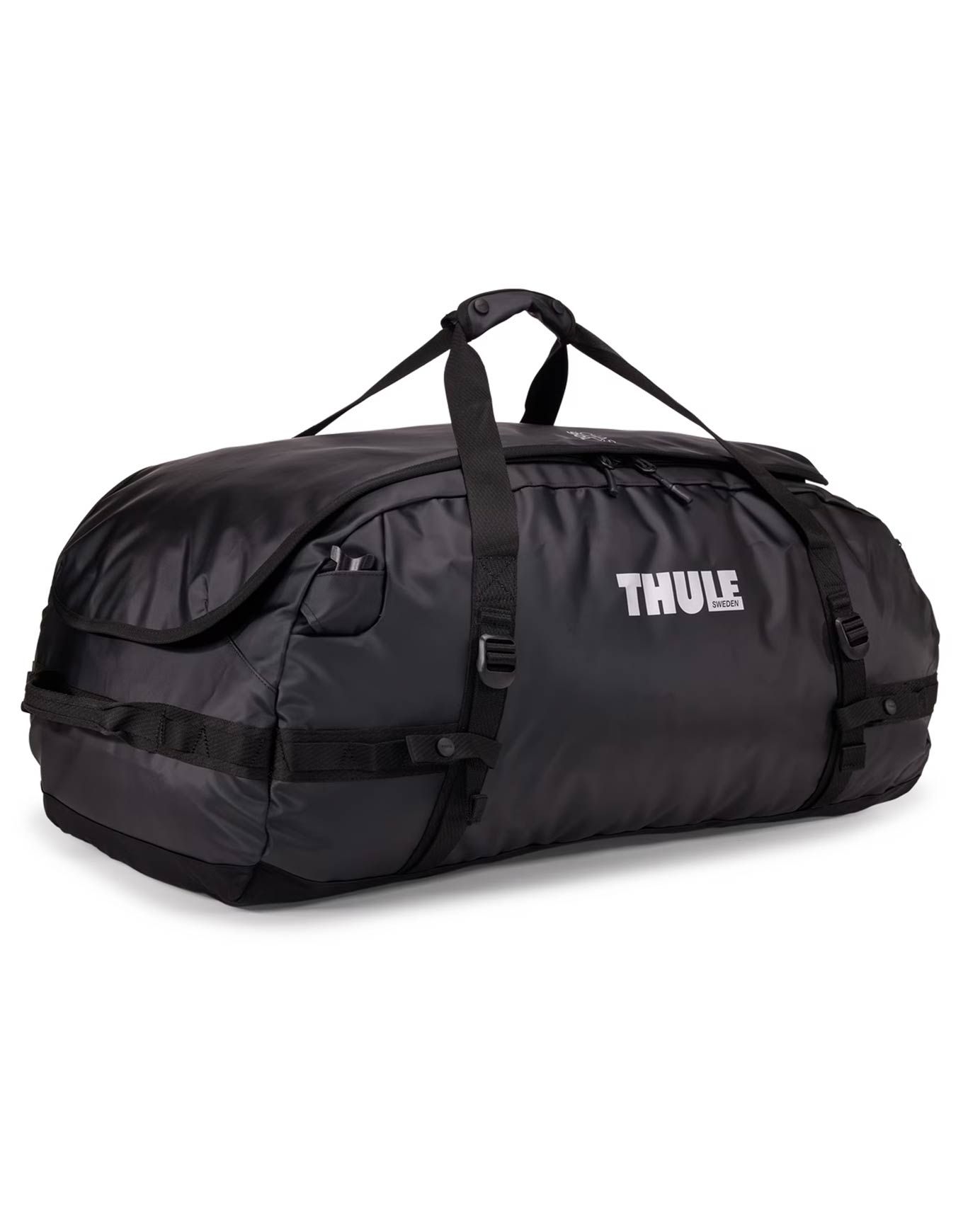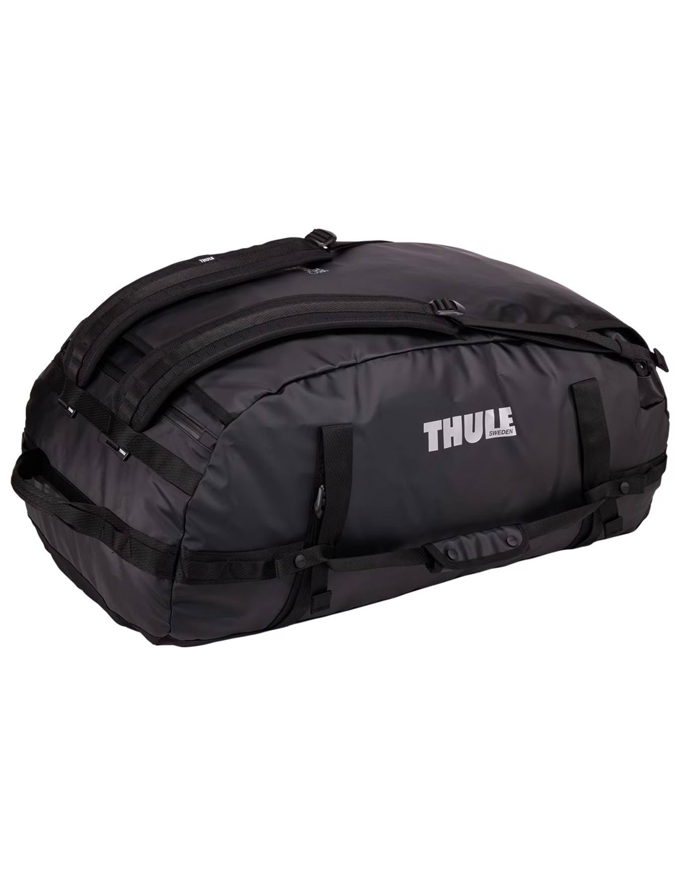 Sac de transport Thule Chasm 90L Black : robuste et résistant aux intempéries, il se porte à la main ou en sac à dos grâce à ses bretesses pliables.