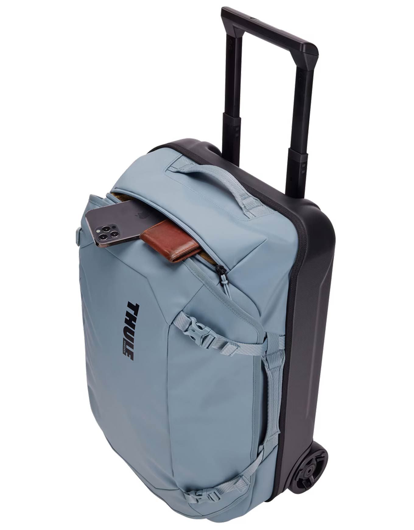 La valise cabine Thule Chasm Carry On Wheeled Duffel Bag 40L Pond Gray, en toile de bâche recyclée et panneau dorsal polycarbonate, résiste à la pluie et aux chocs. Roulette fluide, poignée télescopique, indicateur de remplissage, accès large et poches sécurisées.