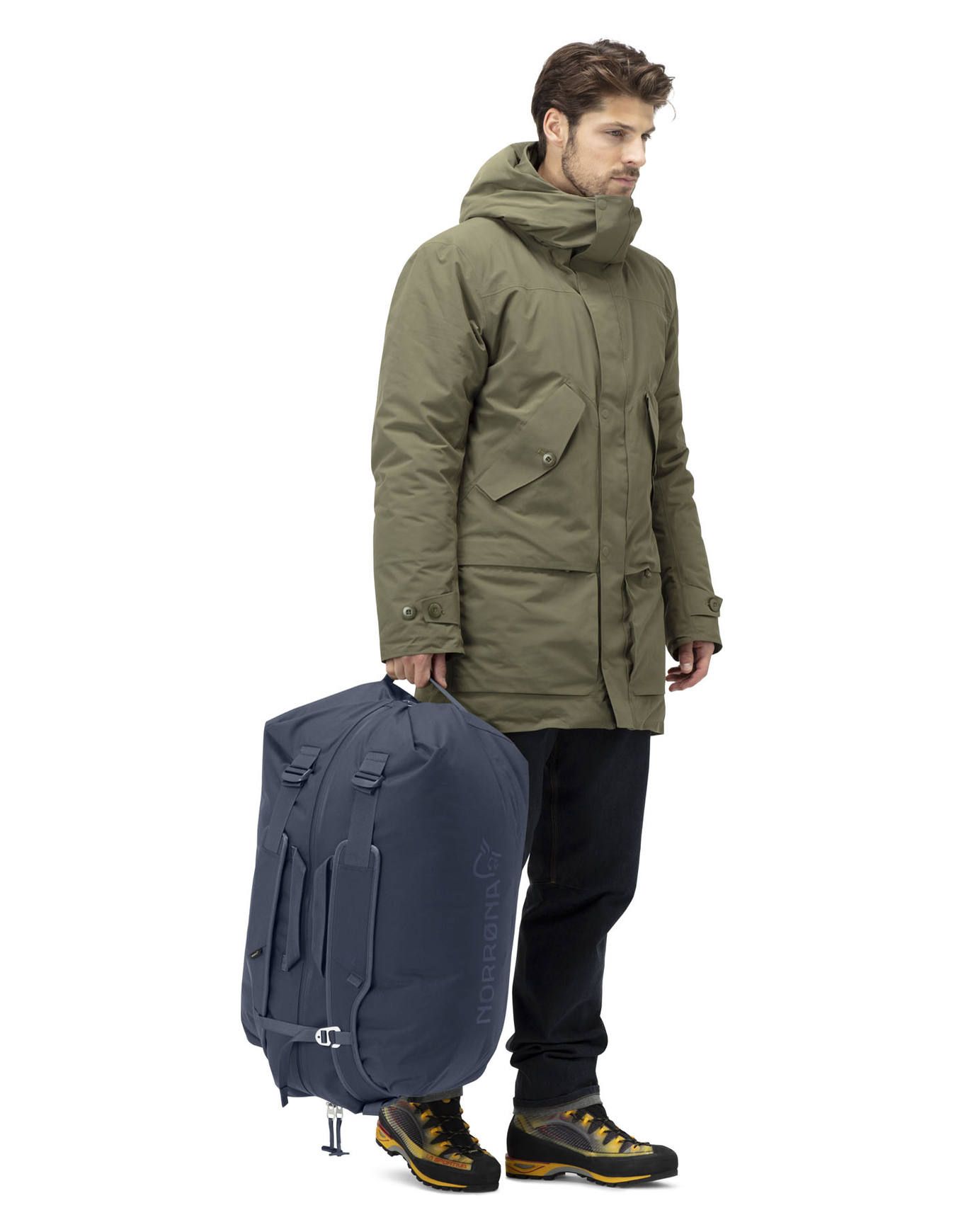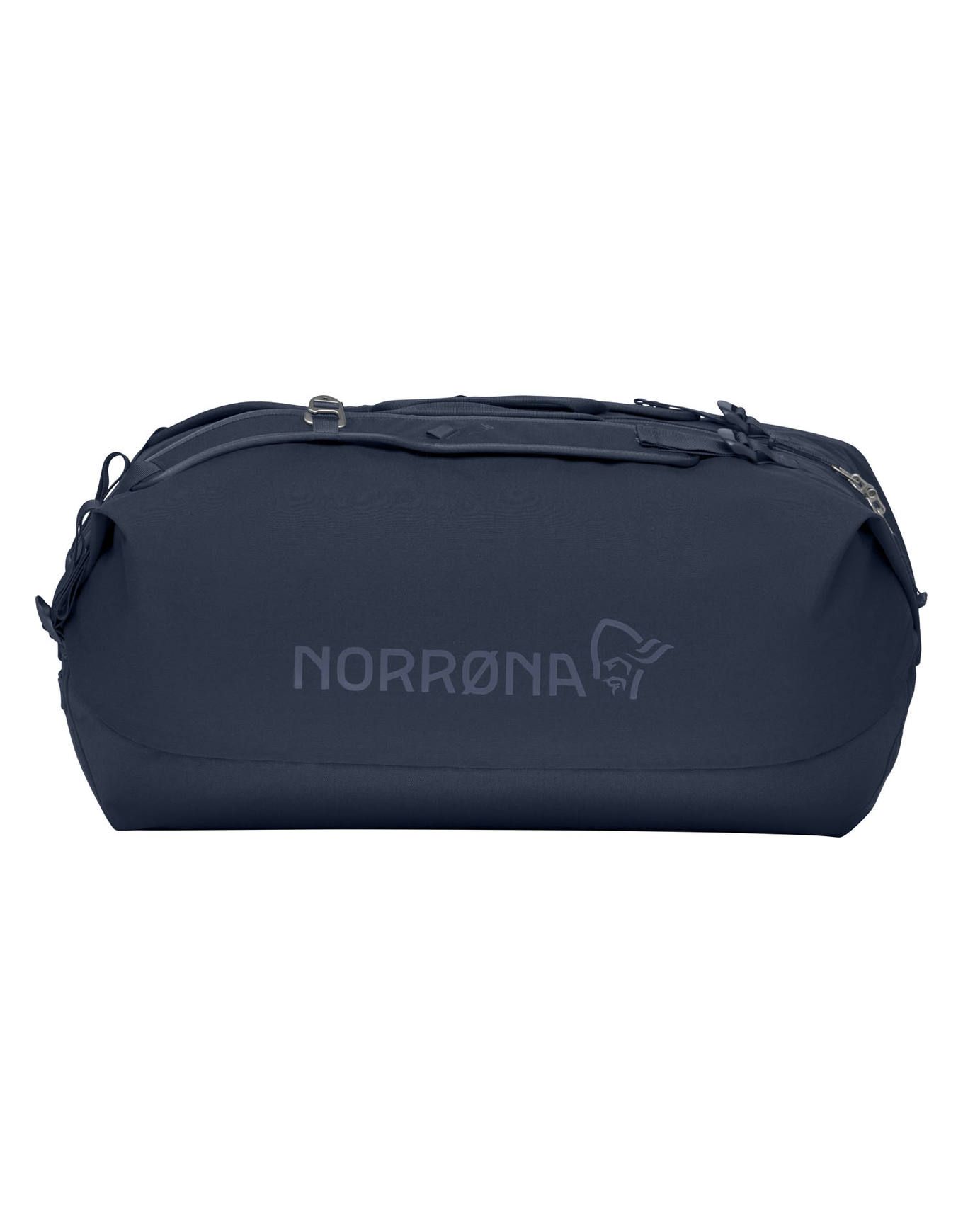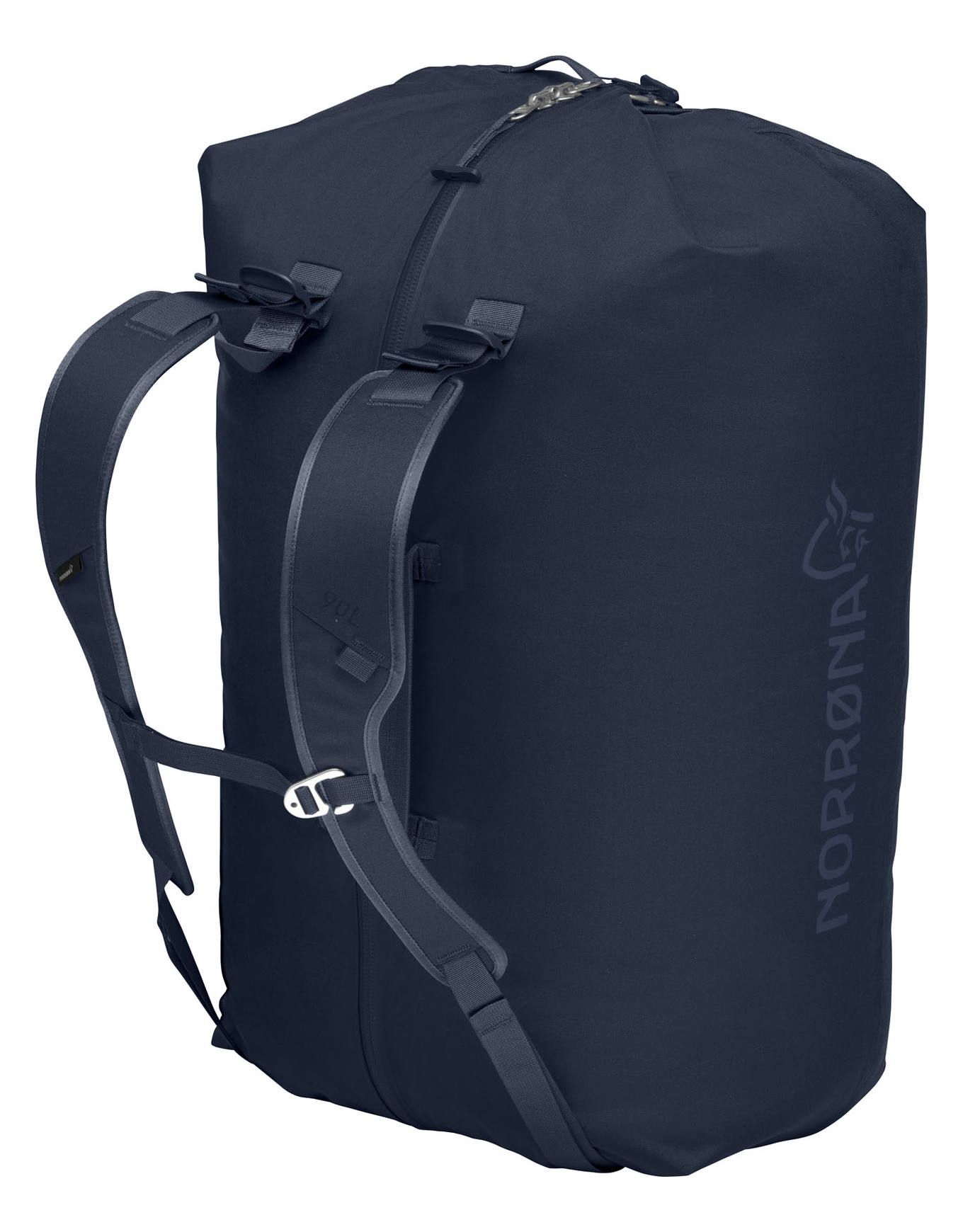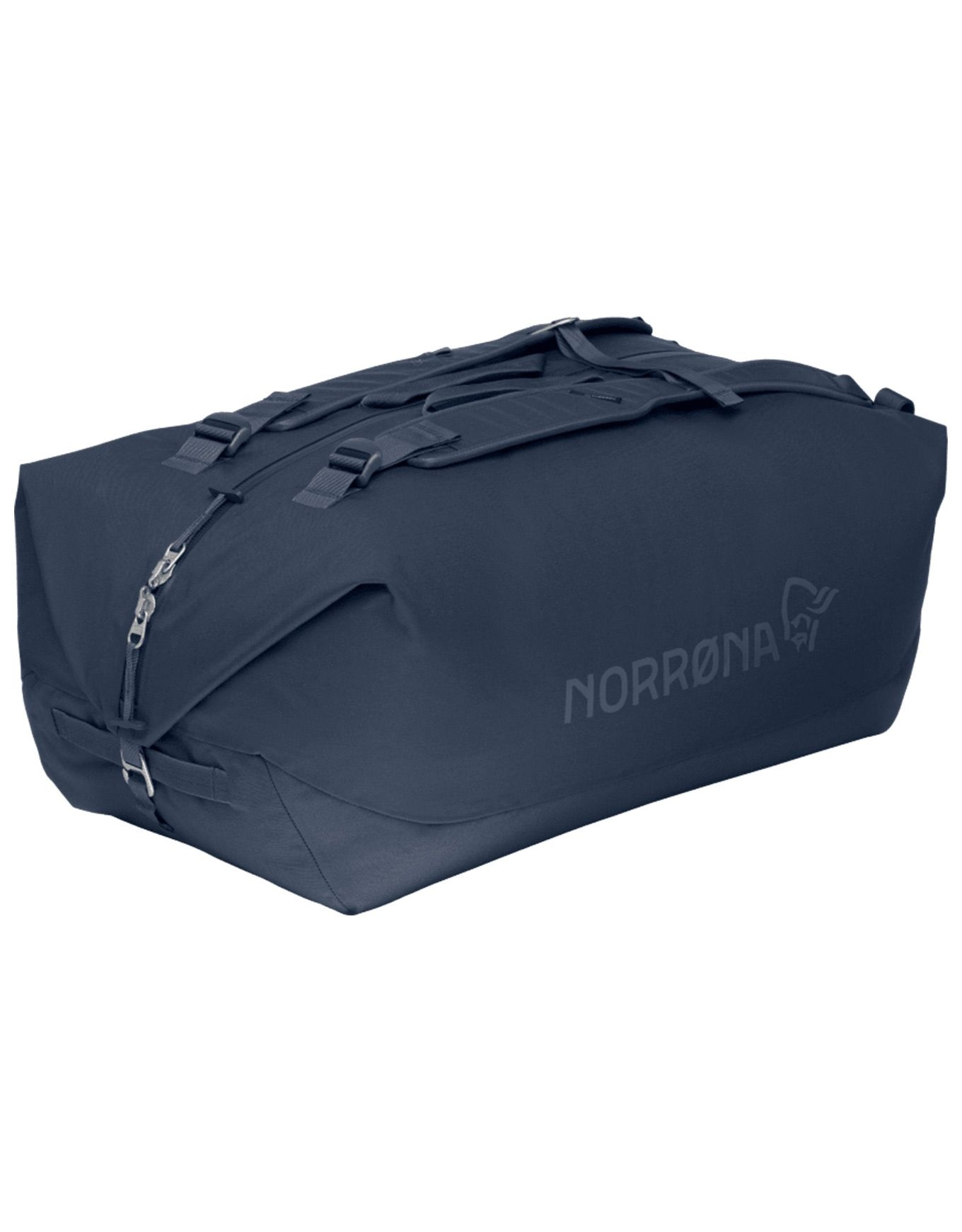 Le sac Norrøna 70L Duffel Indigo Night, conçu en ECONYL® recyclé et revêtu de polyuréthane, résiste aux intempéries et se porte en sac à dos ou en bandoulière.