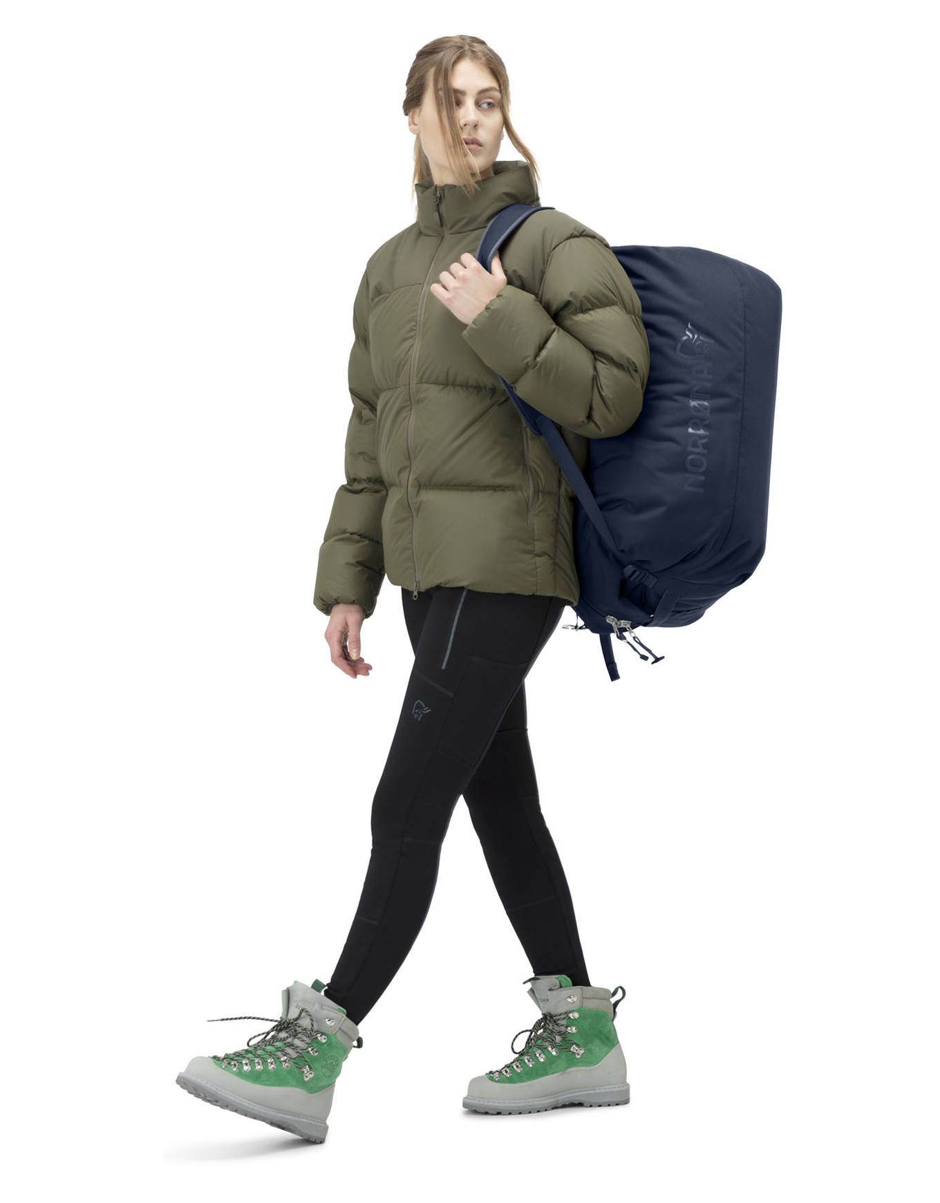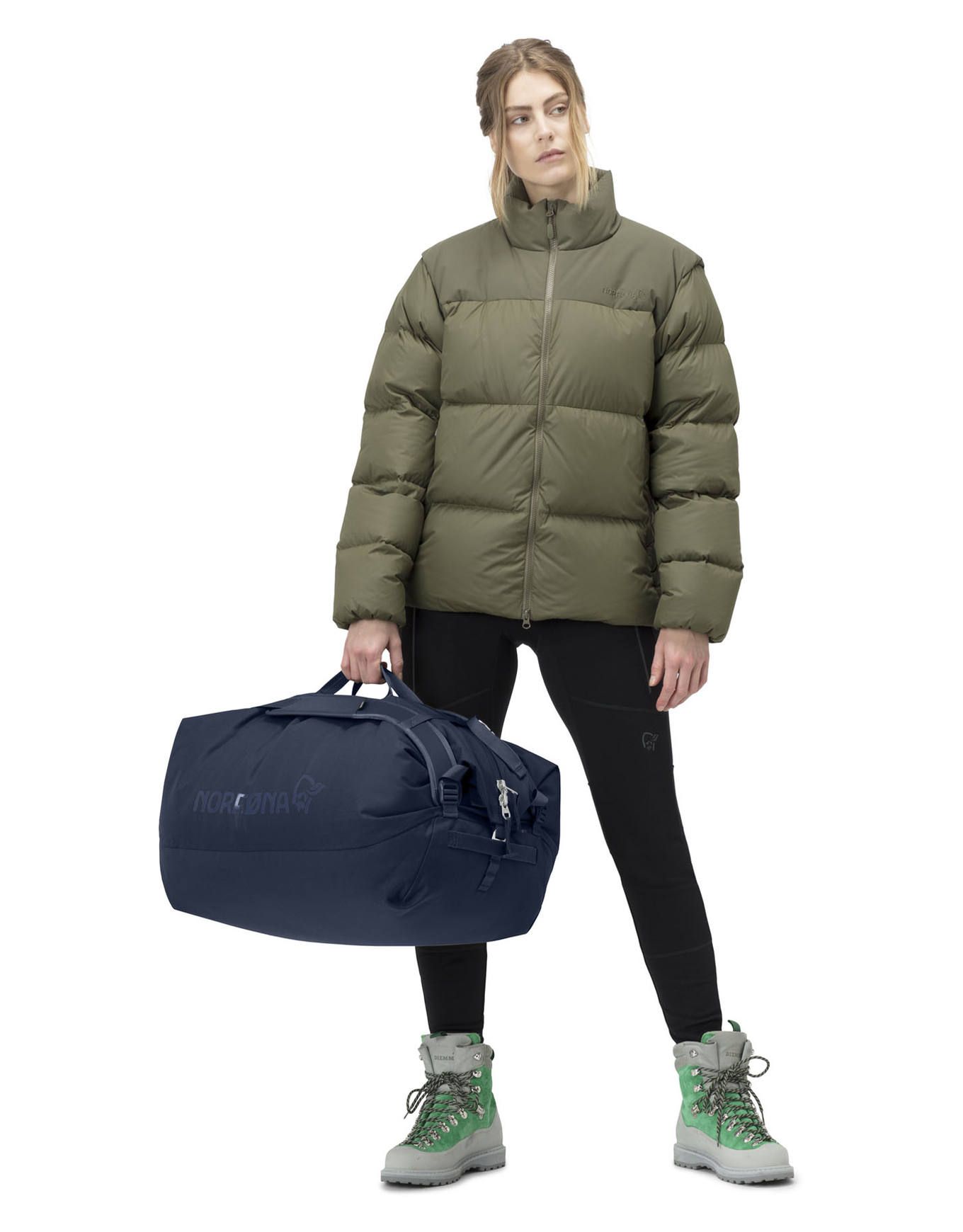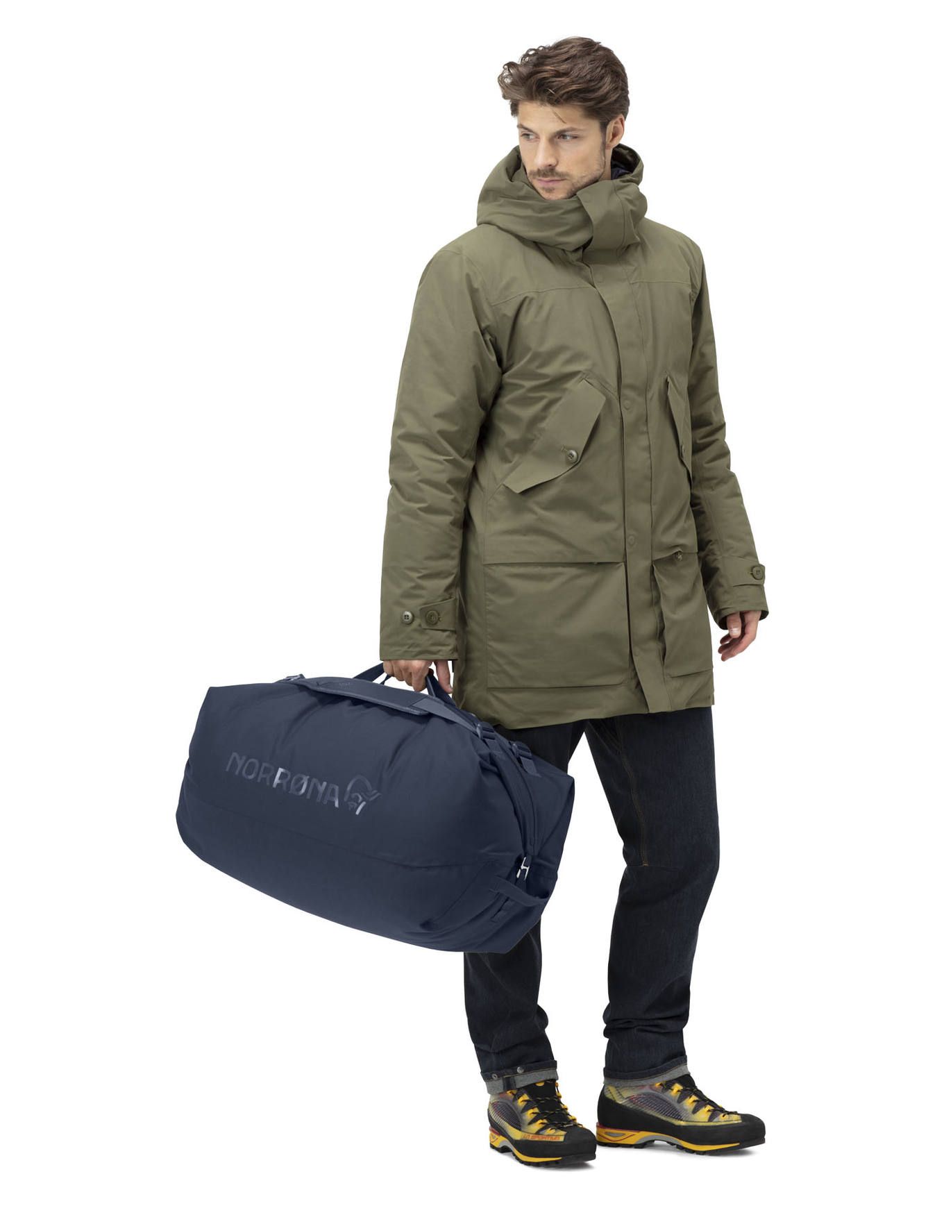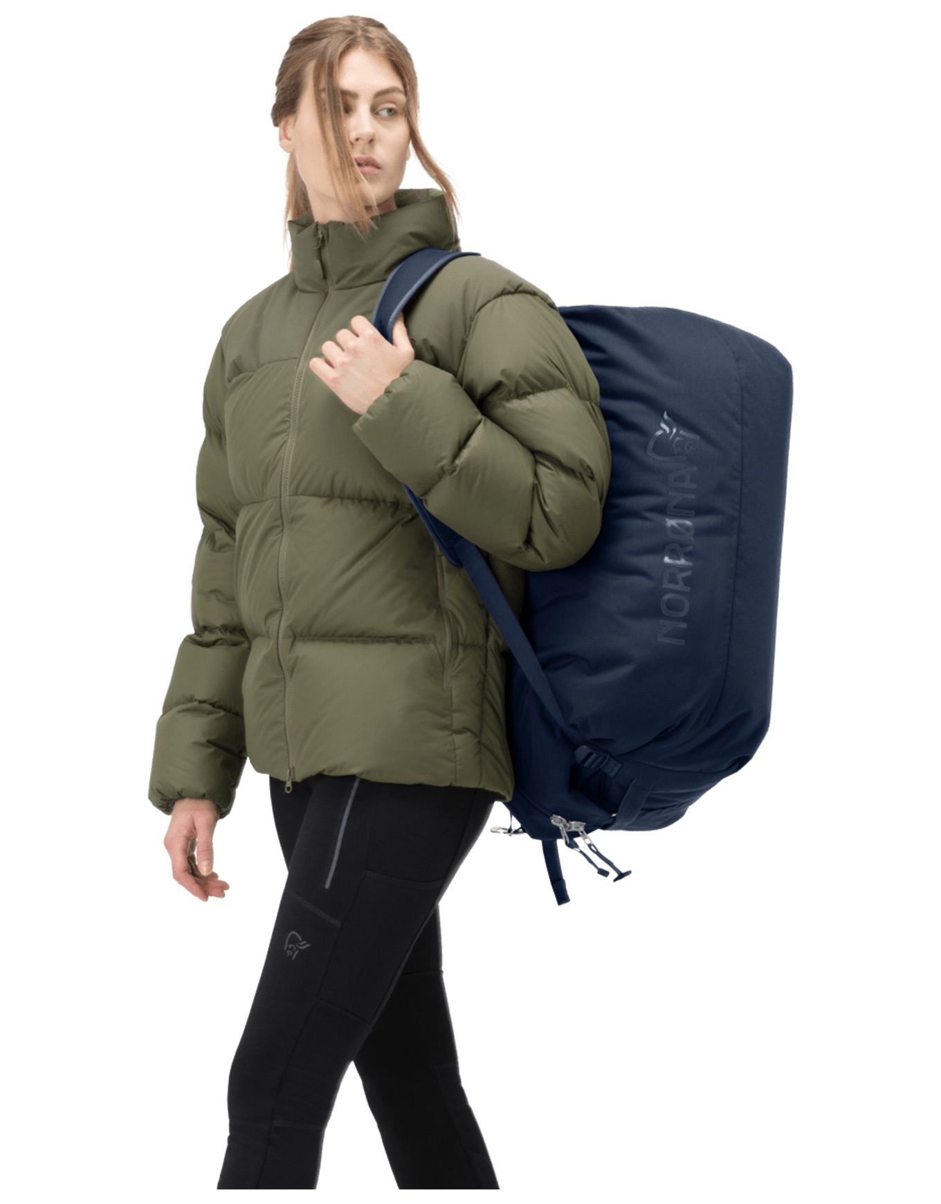 Le sac Norrøna 70L Duffel Indigo Night, conçu en ECONYL® recyclé et revêtu de polyuréthane, résiste aux intempéries et se porte en sac à dos ou en bandoulière.
