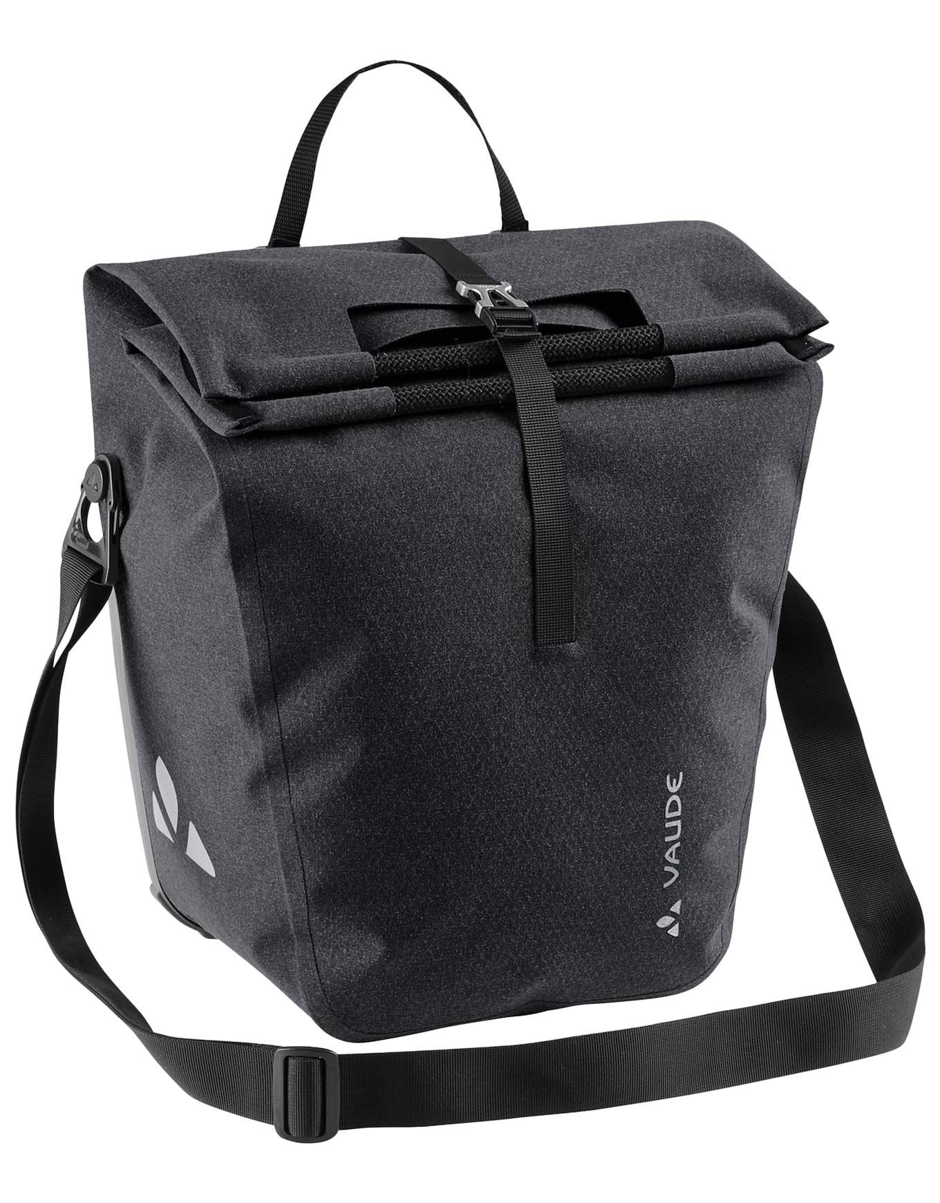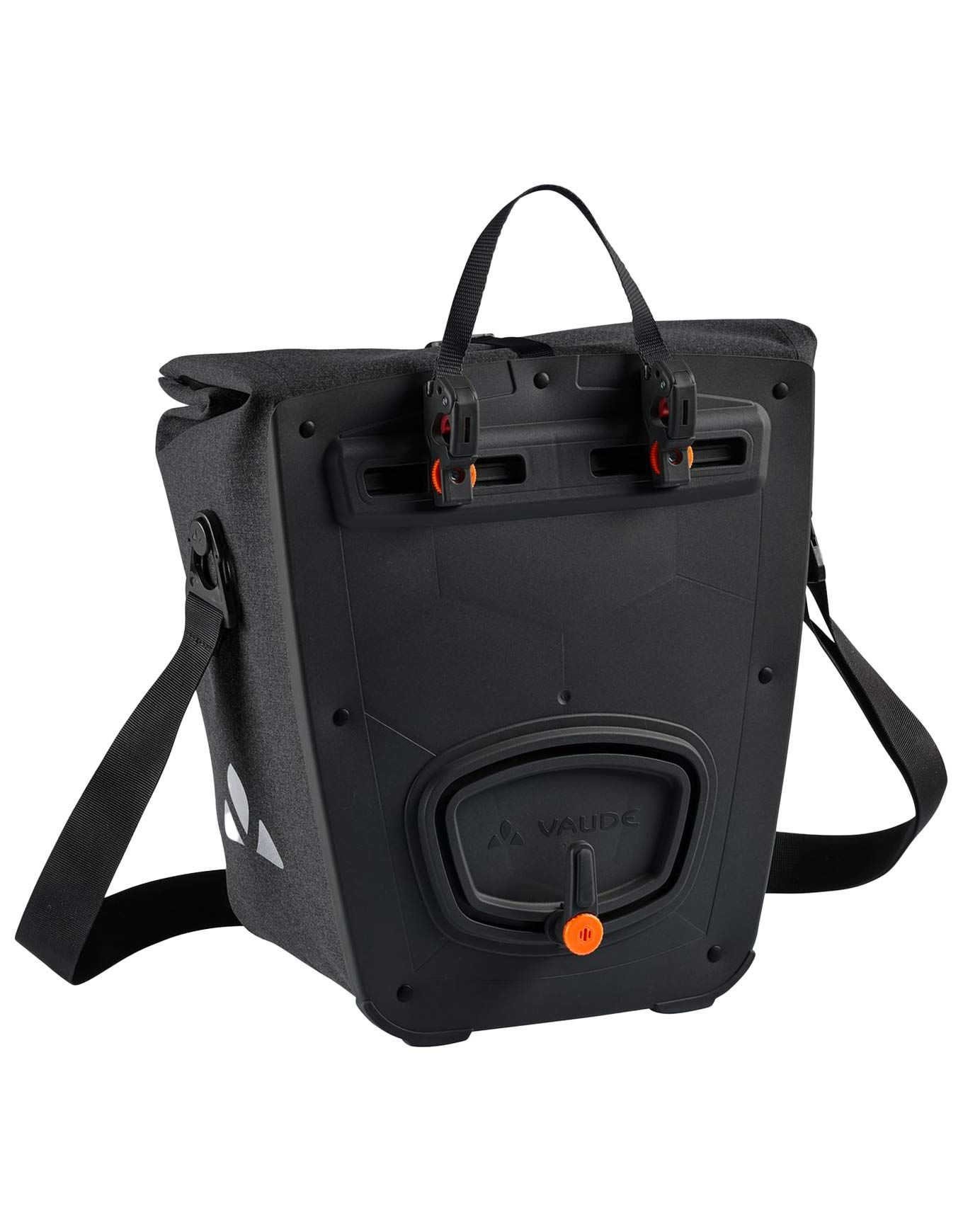 Sacoche arrière Vaude ReCycle Back Single Black, 23 L, 100 % étanche, en matières recyclées, fixation QMR 2.0 réglable 8-16 mm, dos rigide, bandoulière amovible et logos réfléchissants.