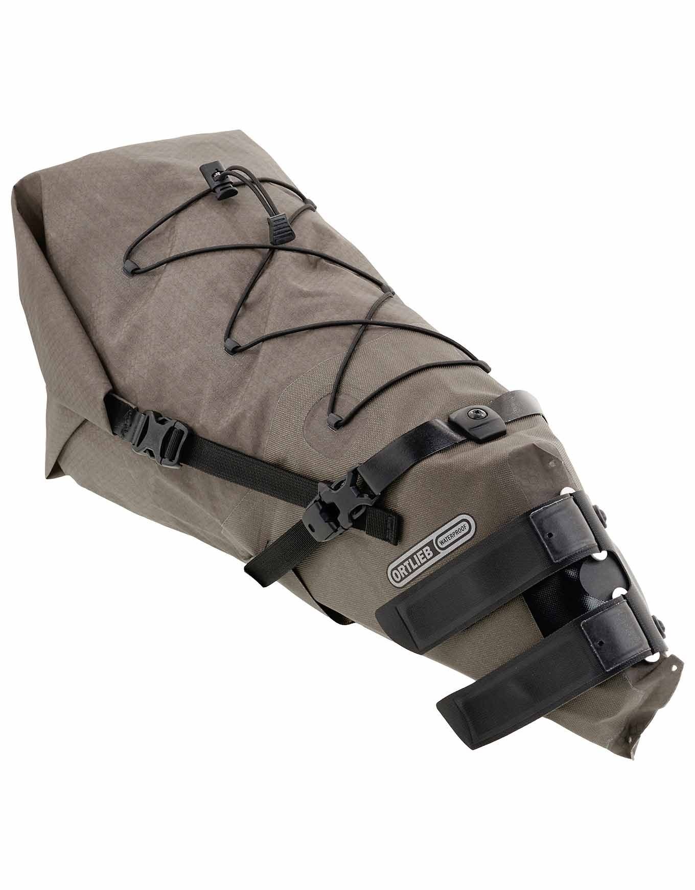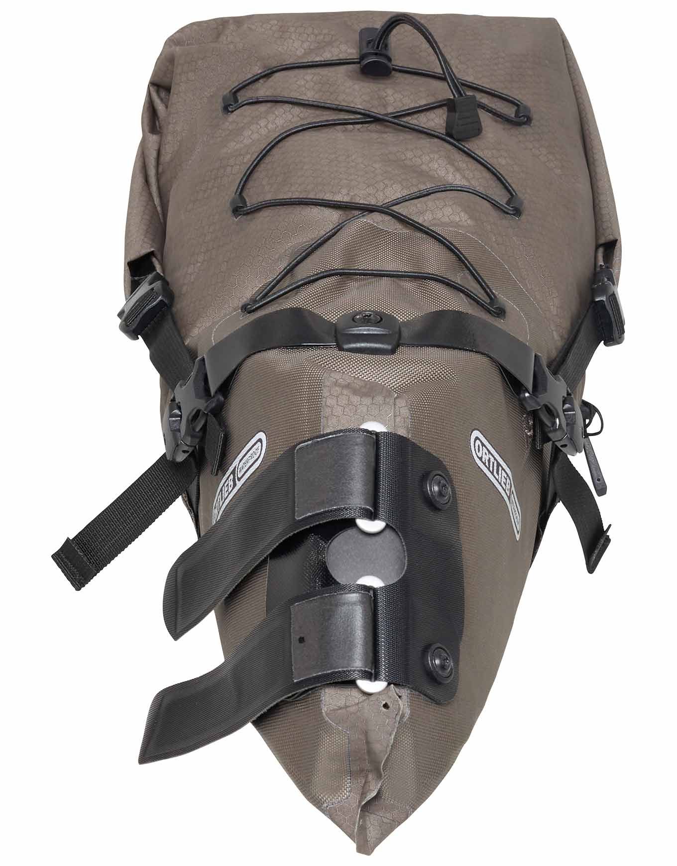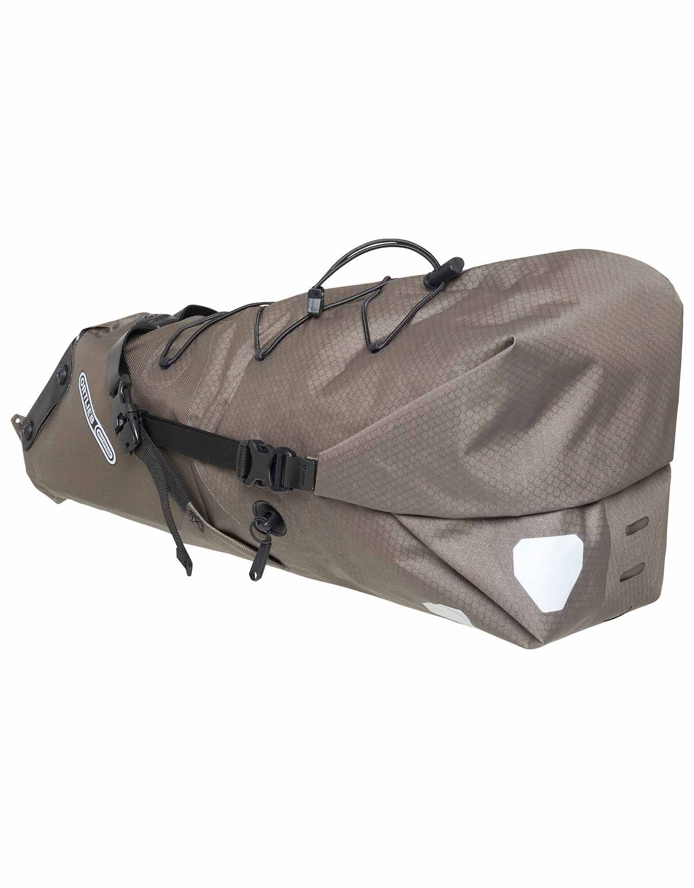 Sacoche de selle Ortlieb Seat Pack 16,5 L Dark Sand, étanche et compressible, fixée par auto-agrippants renforcés, en nylon enduit PU avec Daisy Chain pour feu arrière et éléments réfléchissants.