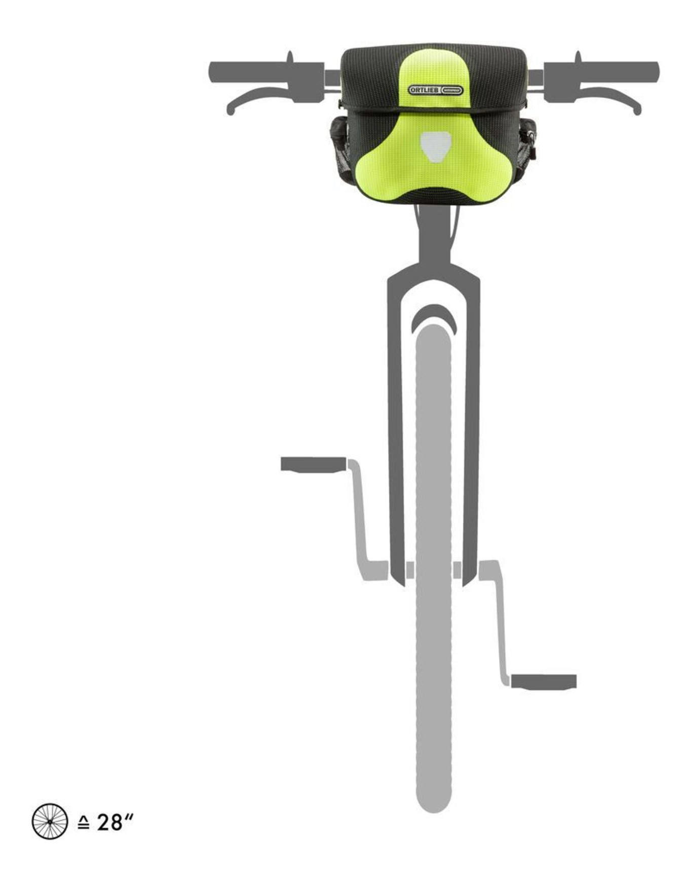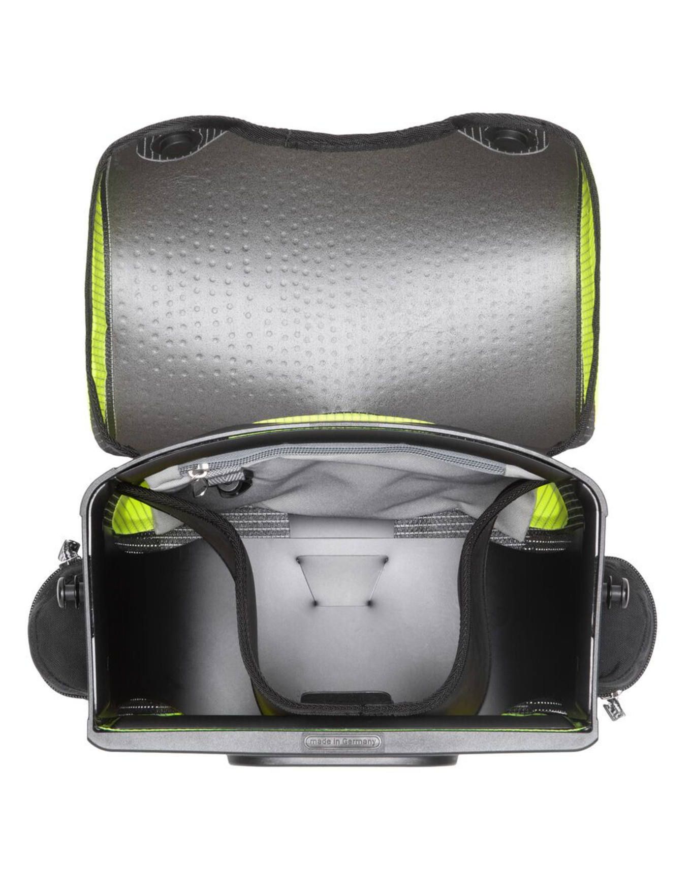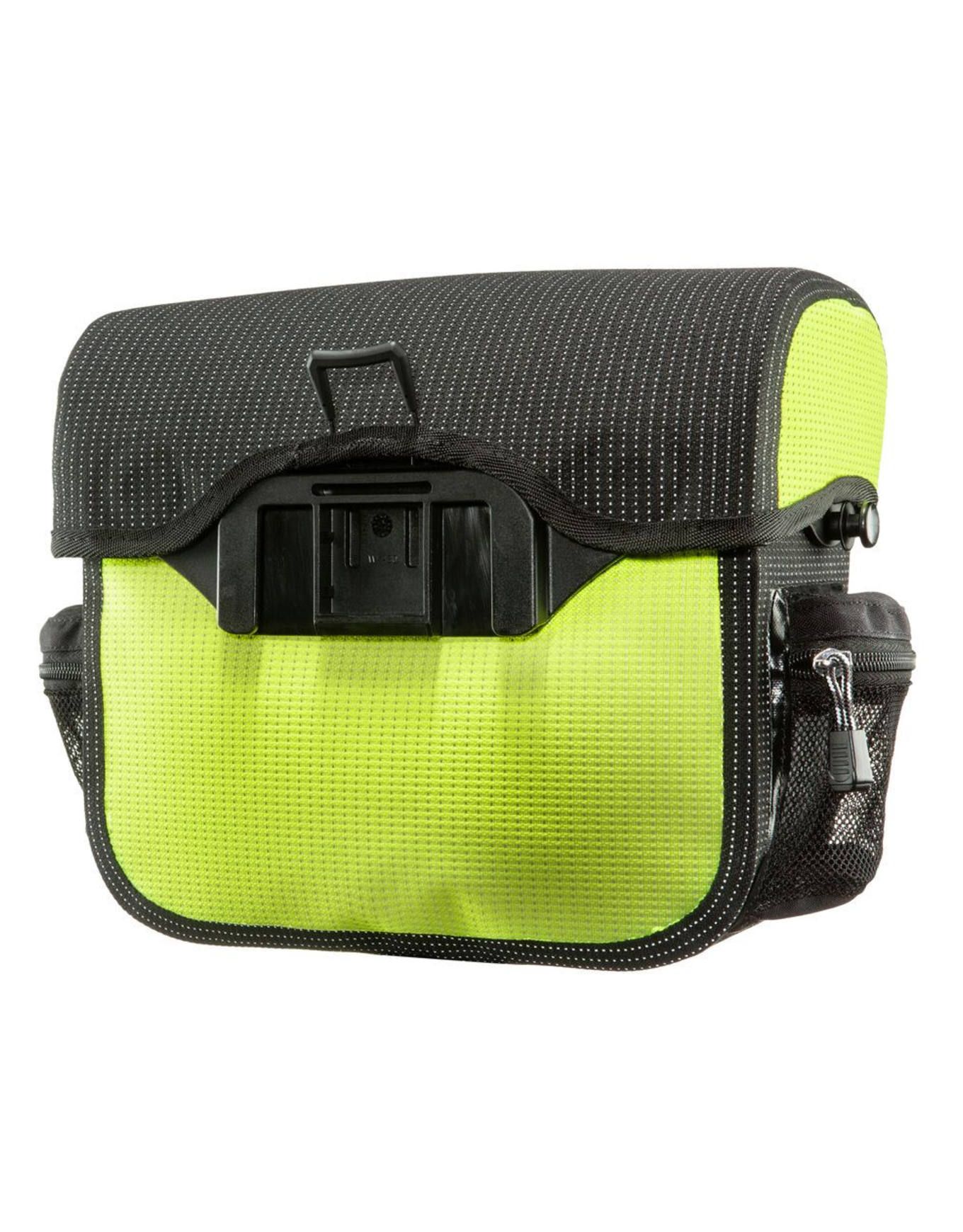 Sacoche de guidon Ortlieb Ultimate Six High Visibility 7L imperméable en Cordura PU jaune fluo avec fil réfléchissant, rabat magnétique verrouillable, poche intérieure zippée et crochet clés, capacité 7 L.