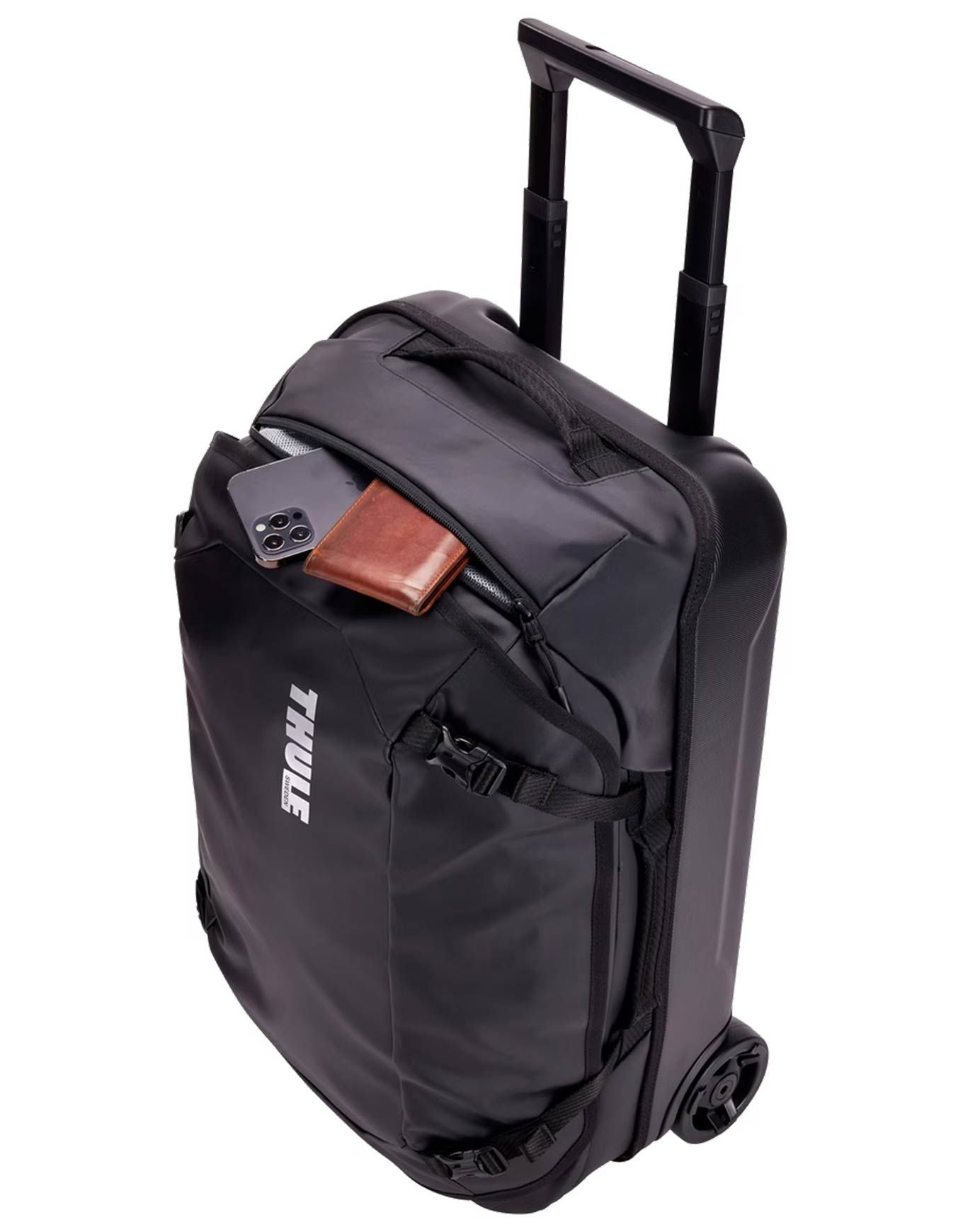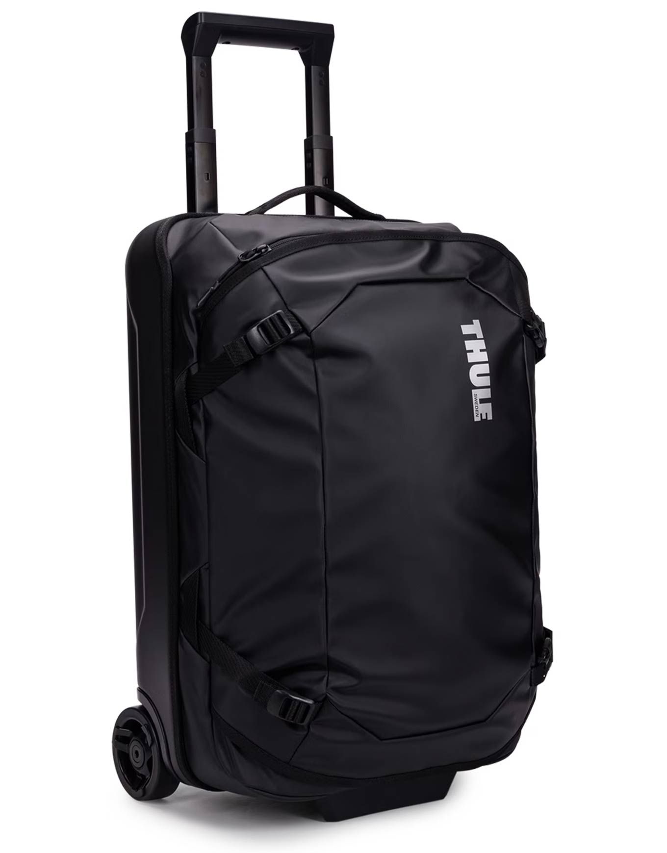 Thule Chasm Carry On Wheeled Duffel Bag 40L Black, valise cabine à roulettes en toile de bâche recyclée et dos polycarbonate résistant aux chocs. Ouverture large, poche extérieure sécurisée, indicateur de remplissage, poignée télescopique et roulement fluide.