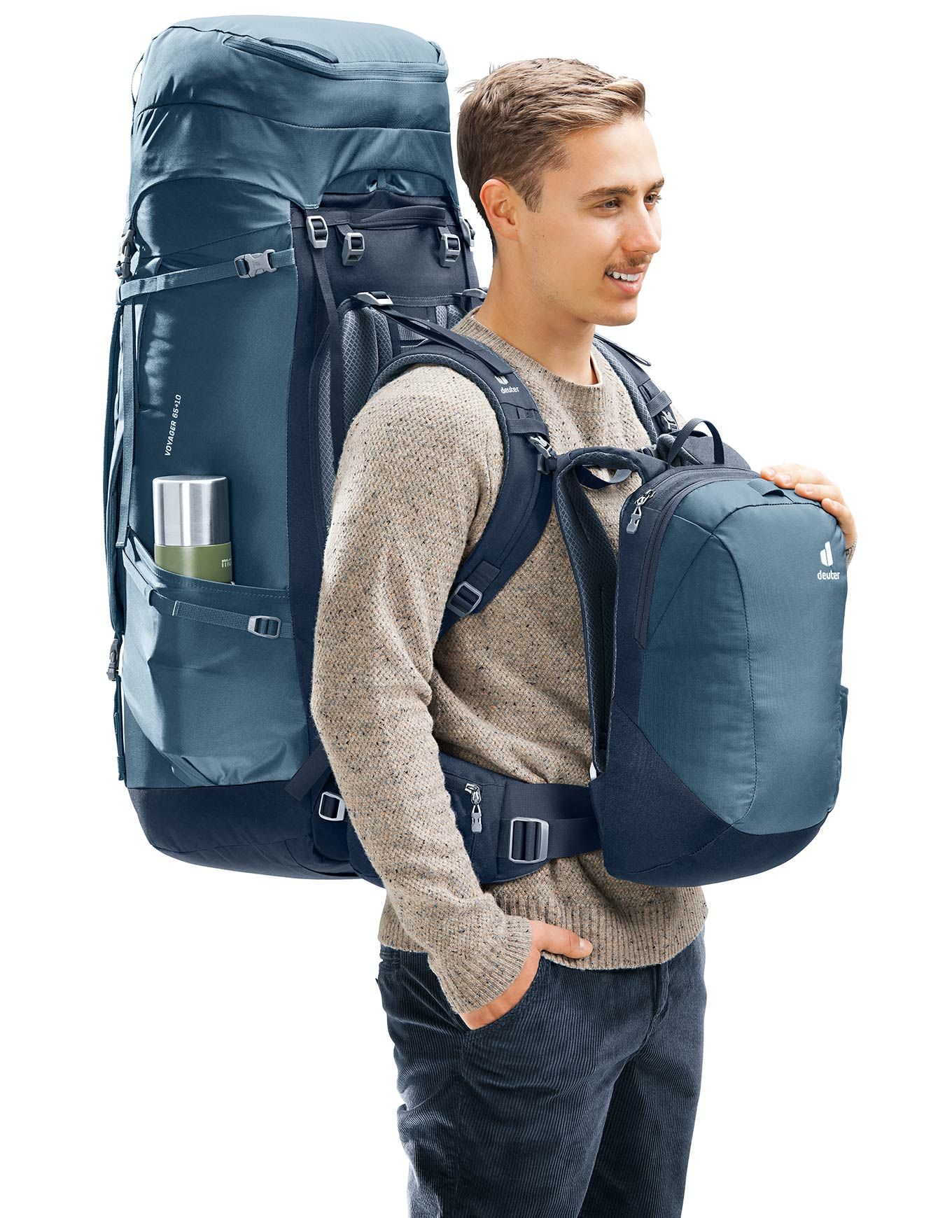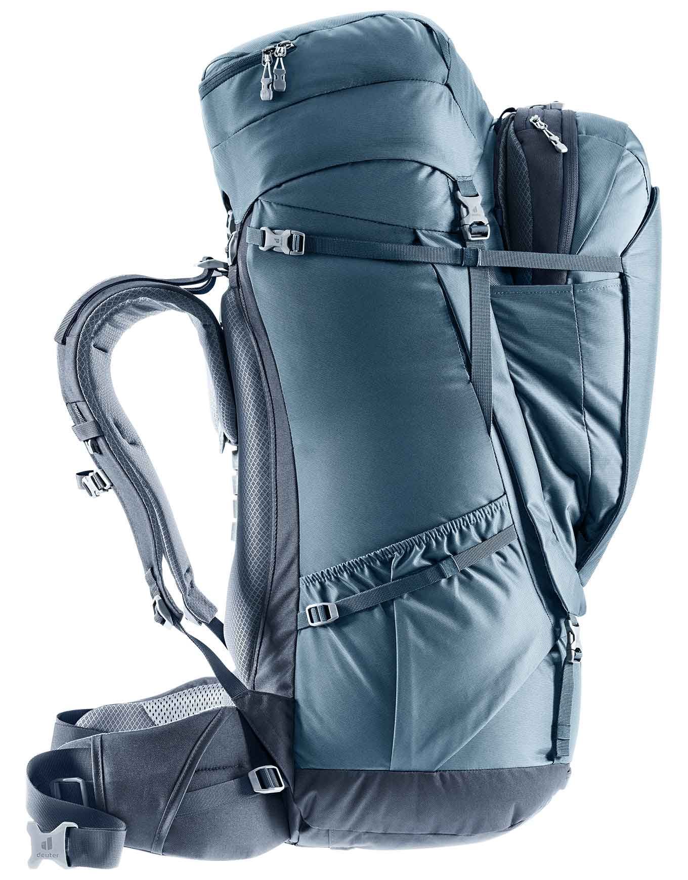 Sac à dos de voyage Deuter Voyager 65+10 Black, réglable par VariQuick, dos Contact avec cadre acier, houche pluie et daypack PC intégrés, poche NFC pour traçage.