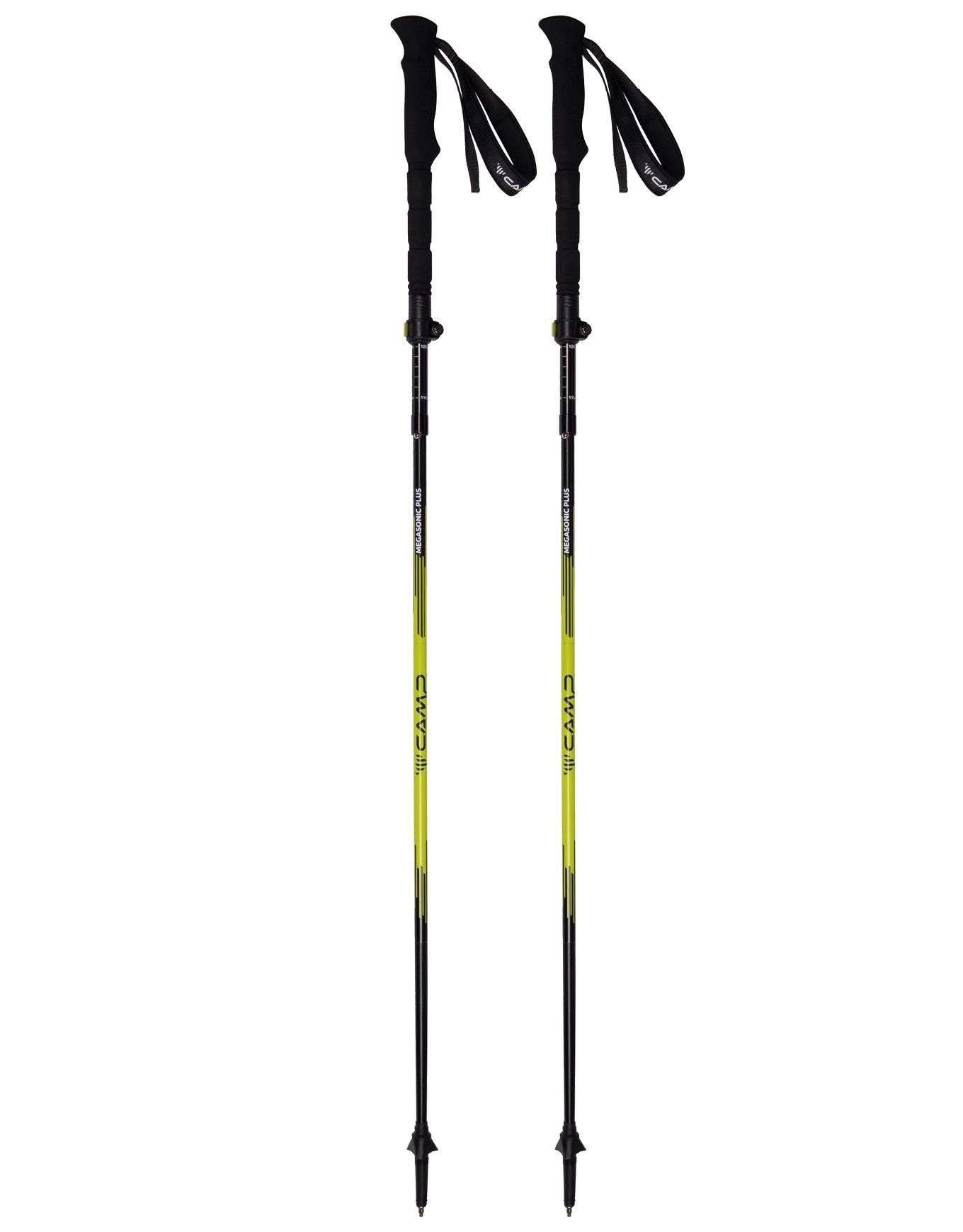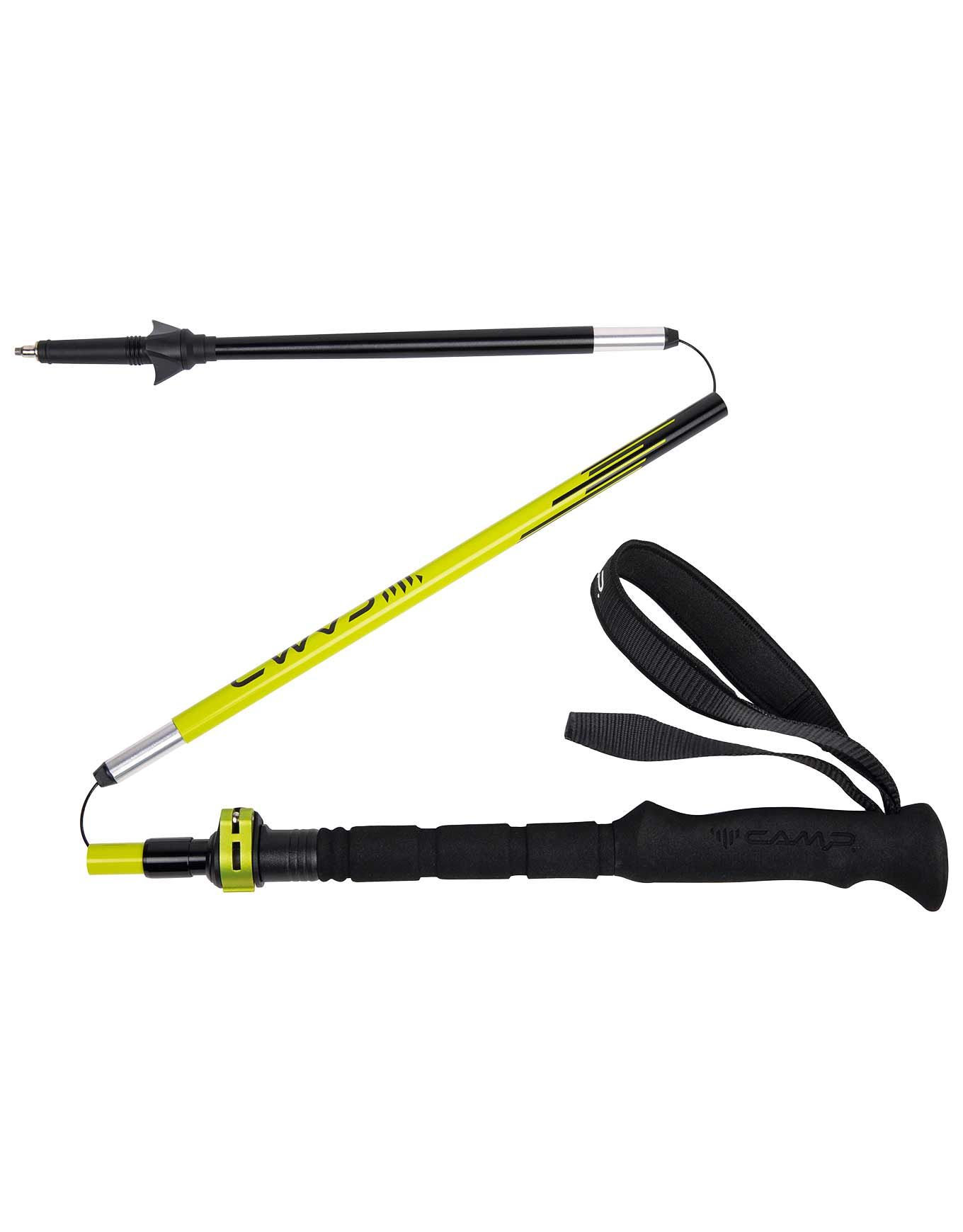 Le bâton de trekking pliable Camp Megasonic Plus, réglable de 115 à 135 cm et sepliant à 36 cm, allie segments aluminium haute résistance, câble acier polyamide pour montage fluide, poignée mousse allongée et pointe carbure saisons.