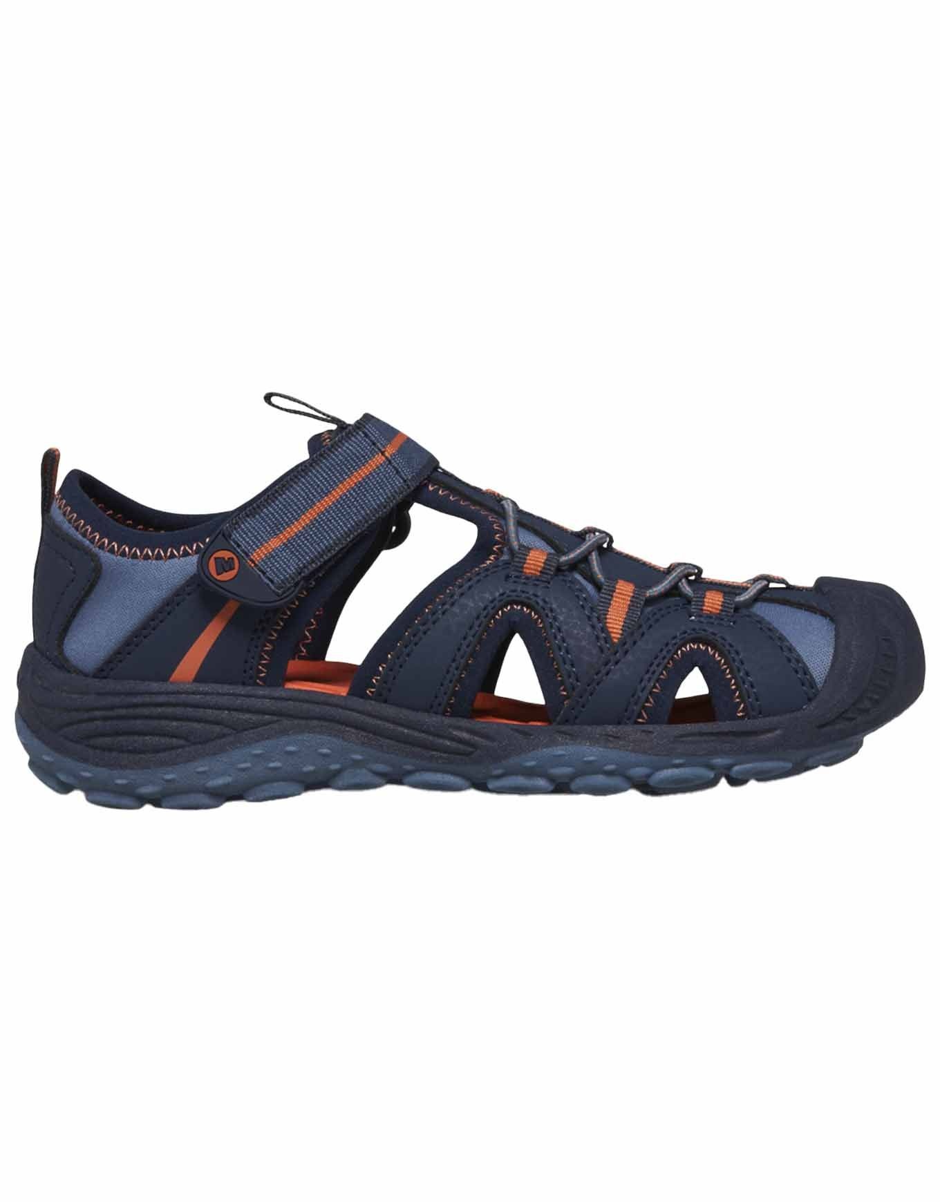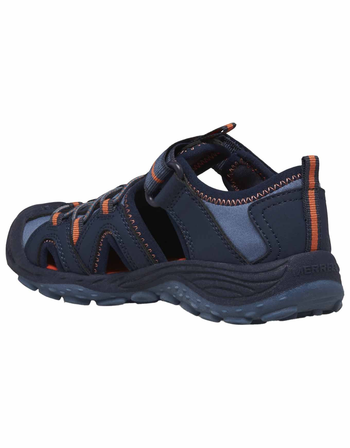 Sandale fermée Merrell Hydro 2 Navy/Orange, conçue pour les enfants actifs : dessus synthétique résistant à l’eau, doublure séchage rapide, fermeture scratch, semelle intérieure EVA moulée et adhérence fiable sur terrains secs ou humides.